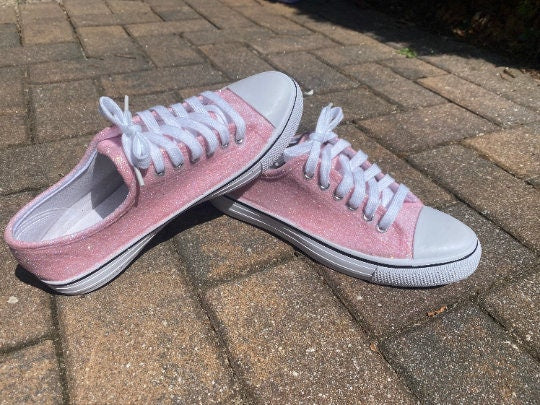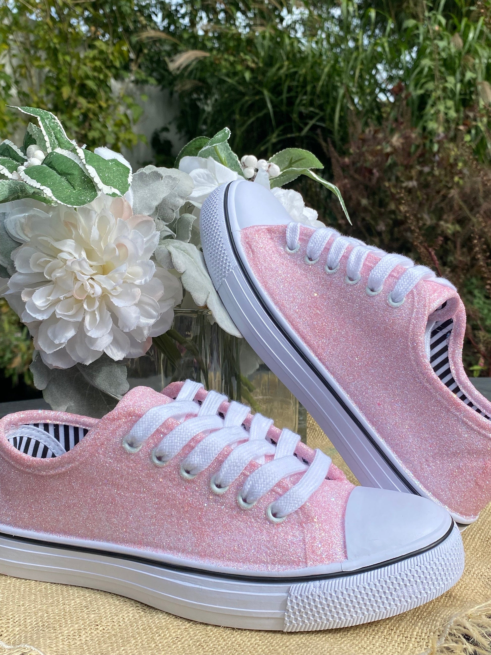 Hand Glittered unbranded canvas sneakers glittered in a gorgeous pink opal glitter. Made to order.