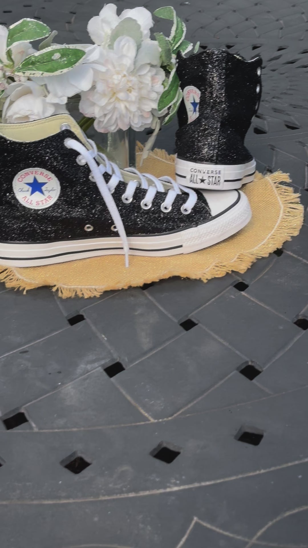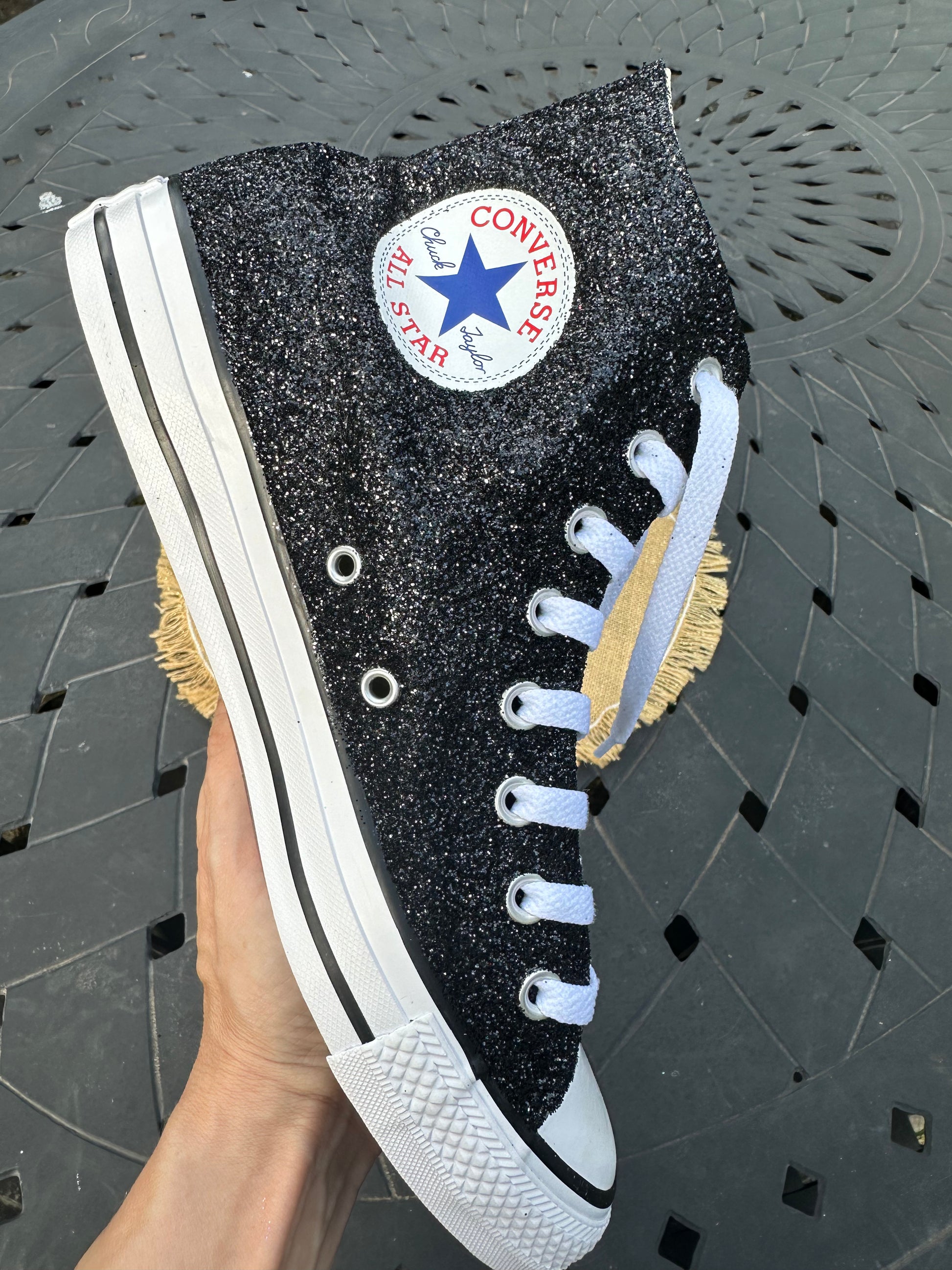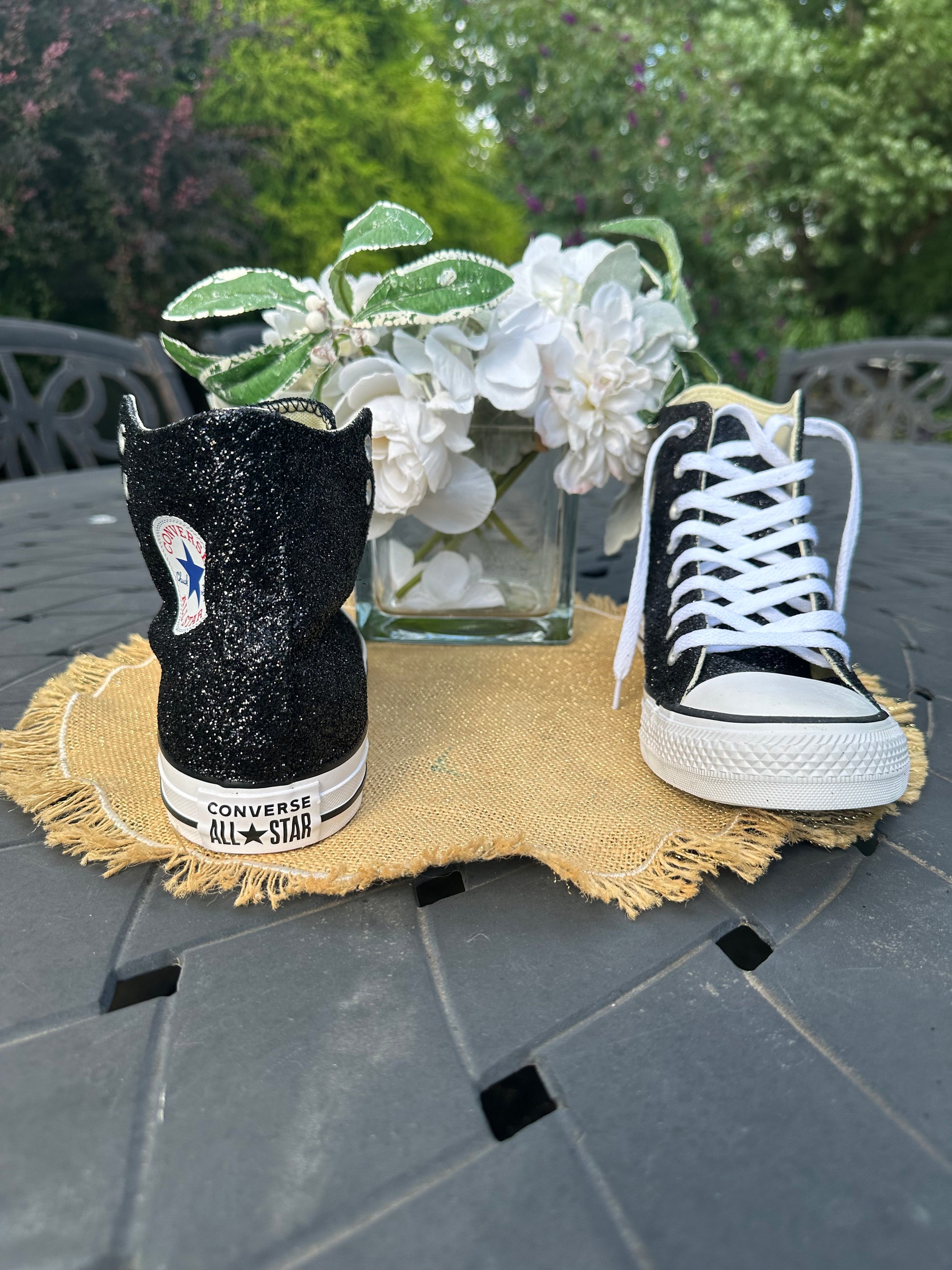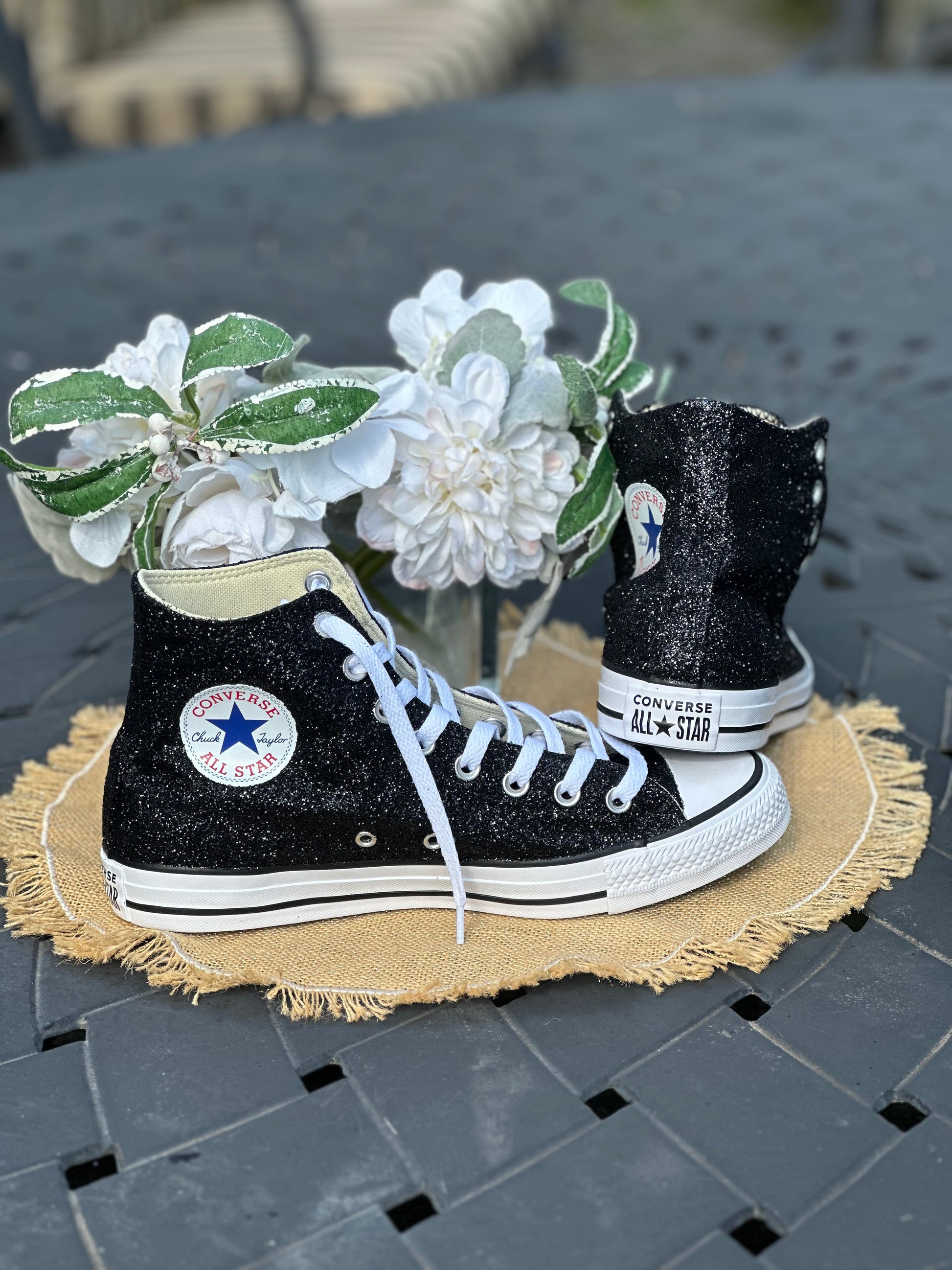 Hand Glittered High Top Converse Chuck All Star sneakers glittered in a gorgeous sparkly black glitter. Made to order. Please order your US Women's size.