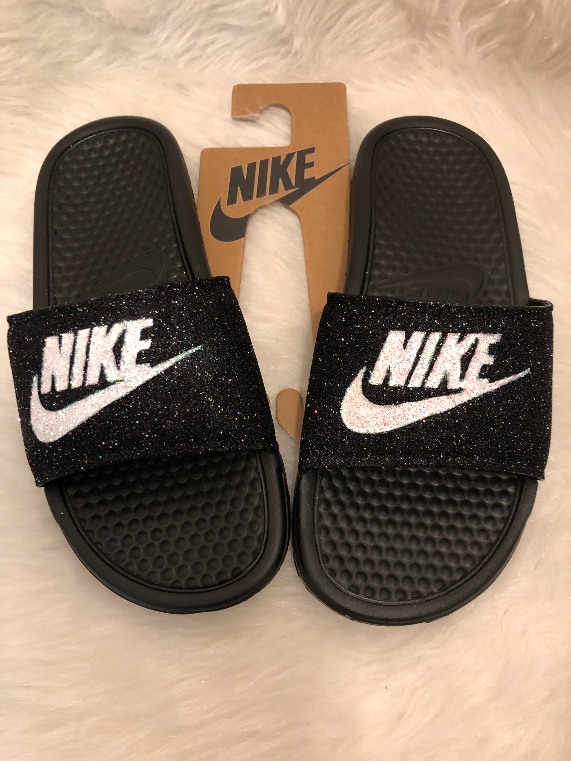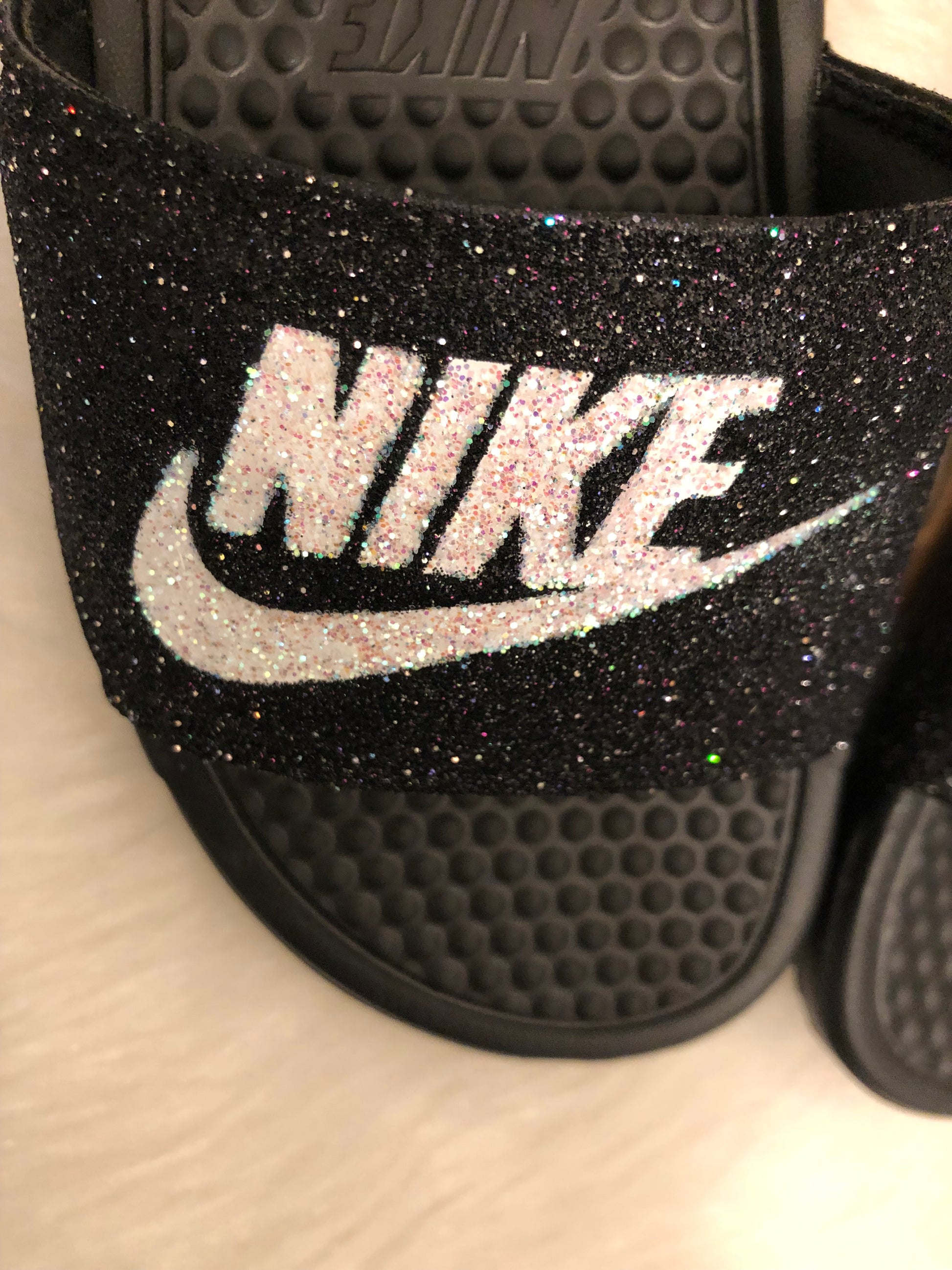 Custom Authentic Nike slide sandals covered with black glitter with white glittered logo. Please order in women’s sizes.