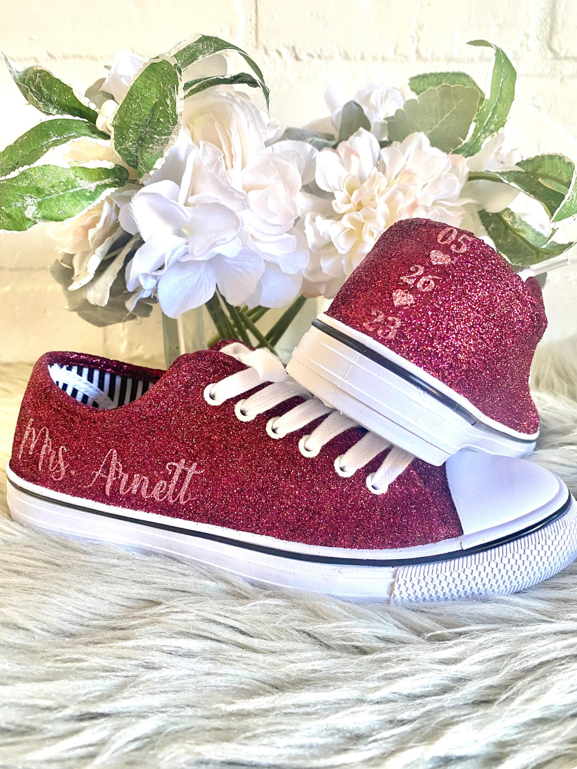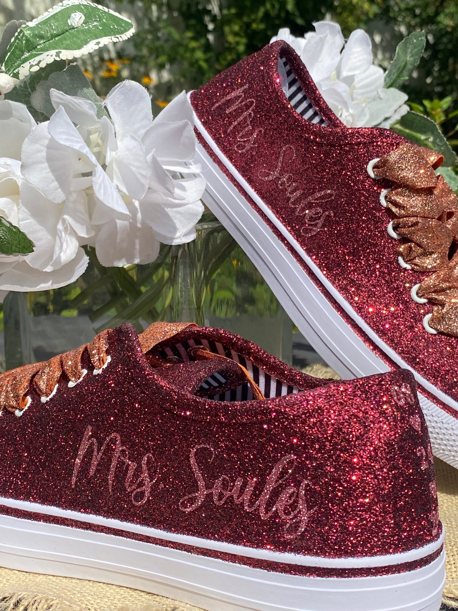 Hand Glittered unbranded canvas sneakers glittered in a gorgeous burgundy maroon glitter with rose gold glitter personalization of your choice. Made to order. Ribbon laces not included but can be added here:
