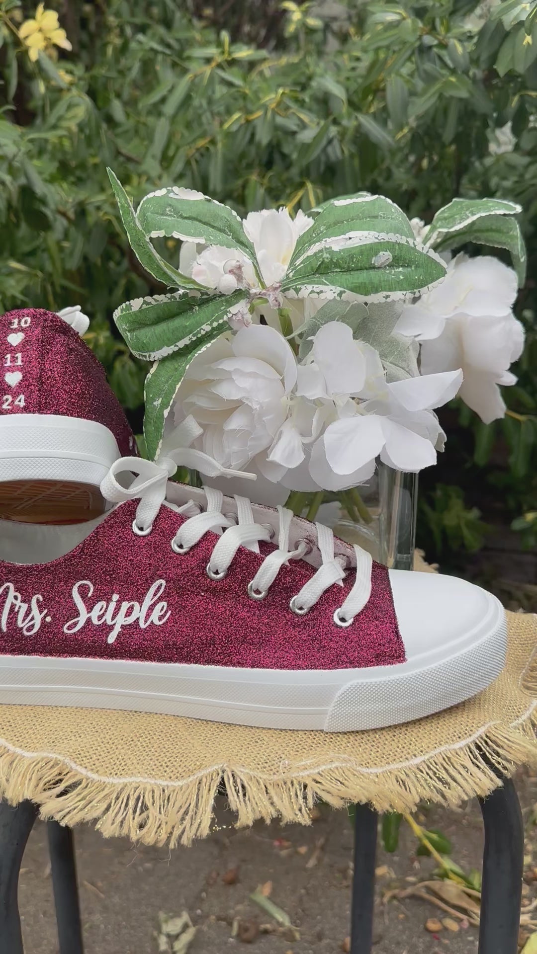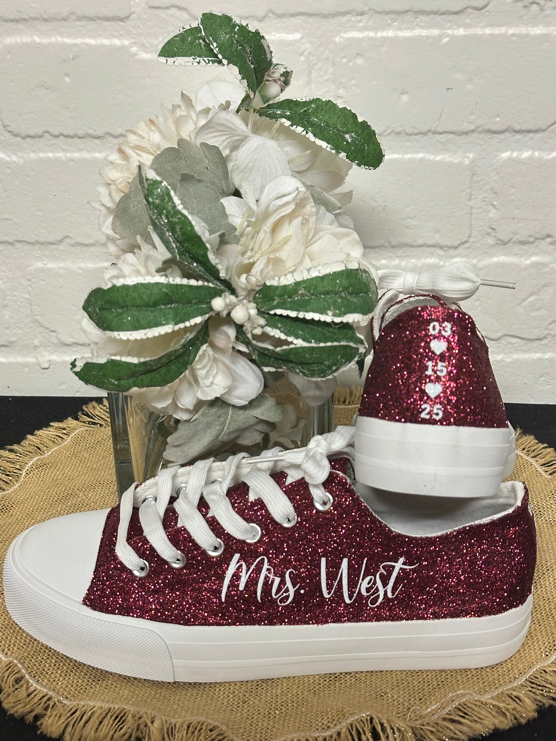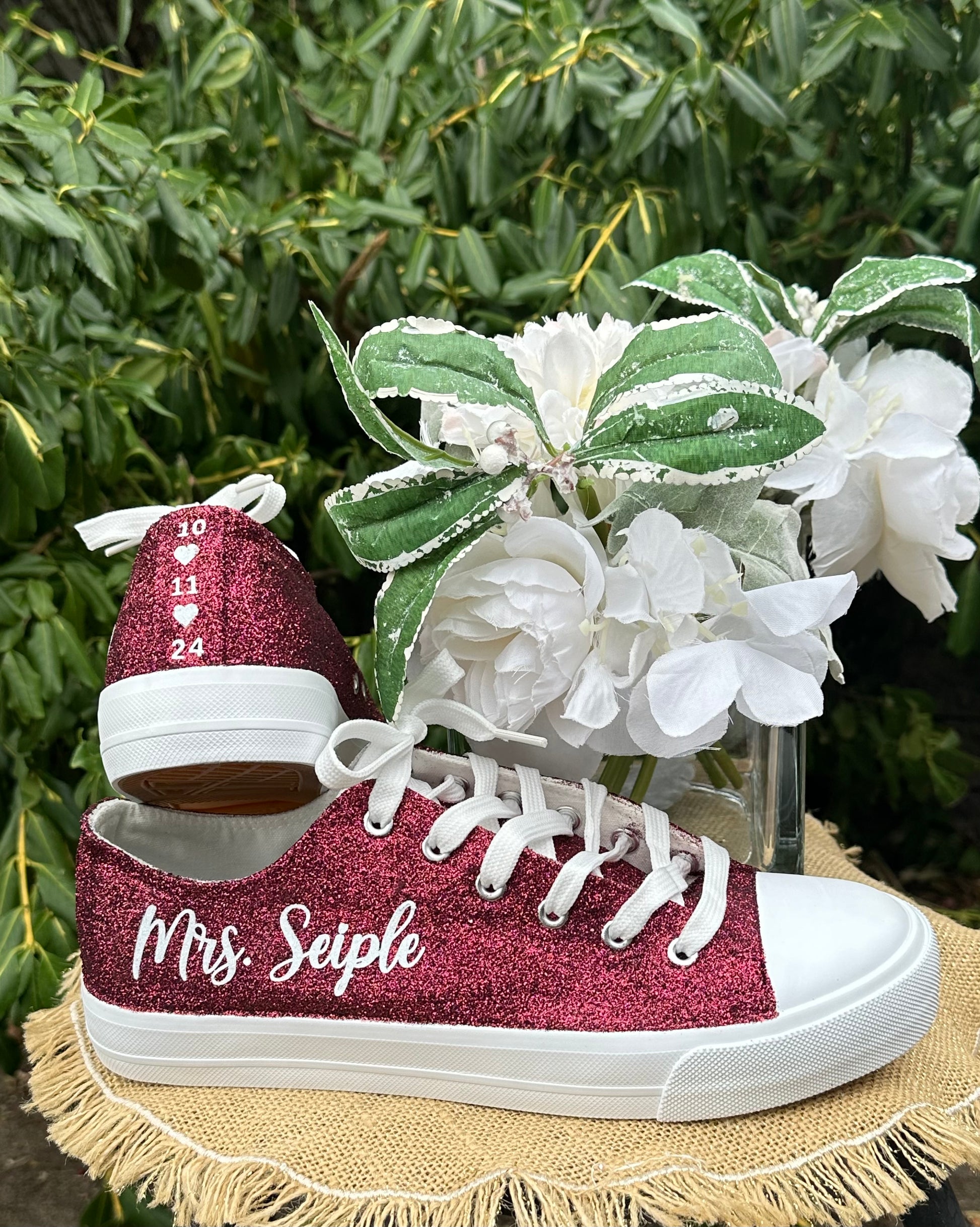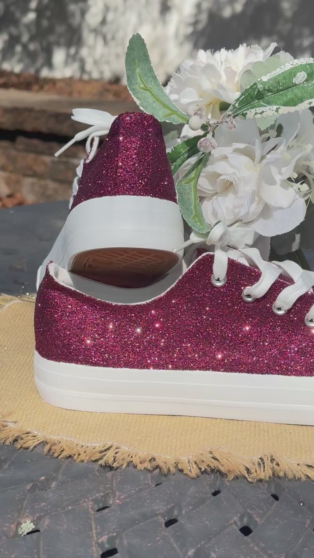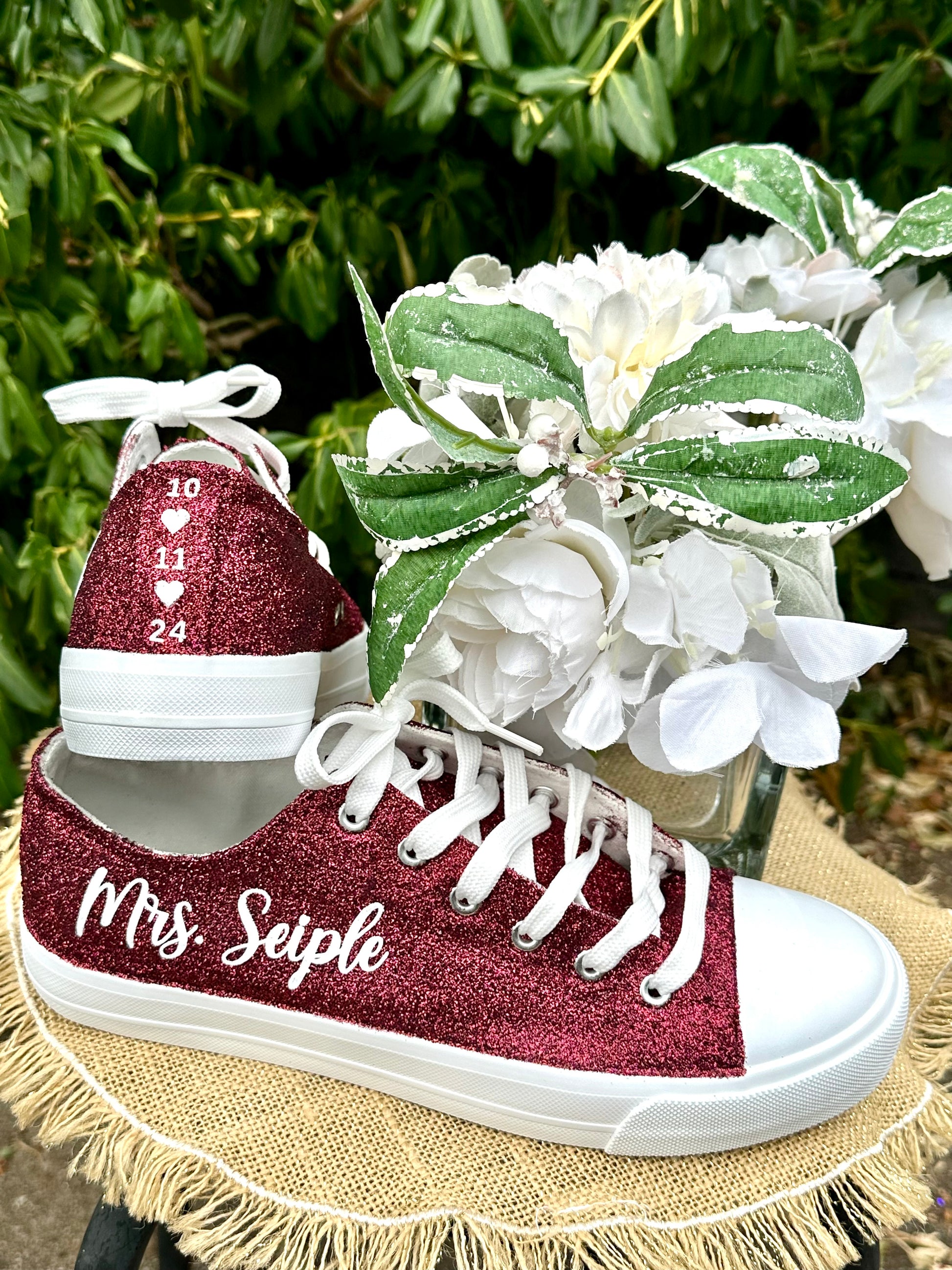 Hand Glittered unbranded white canvas sneakers glittered in a gorgeous maroon glitter. (Shown personalized). Made to order.