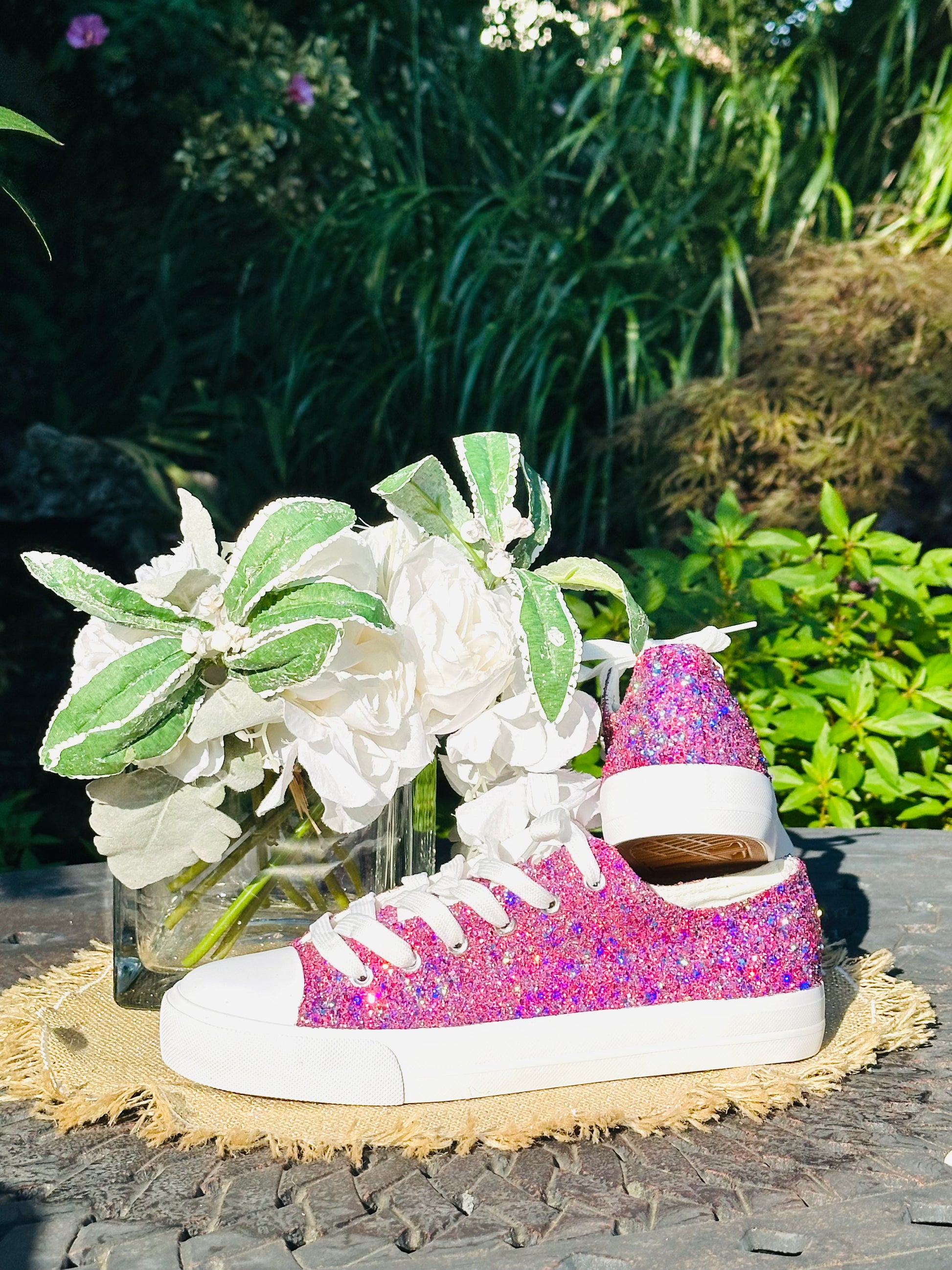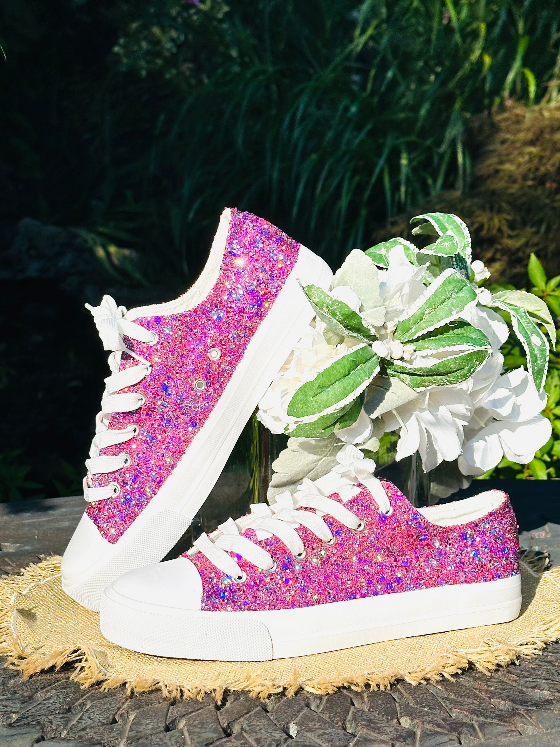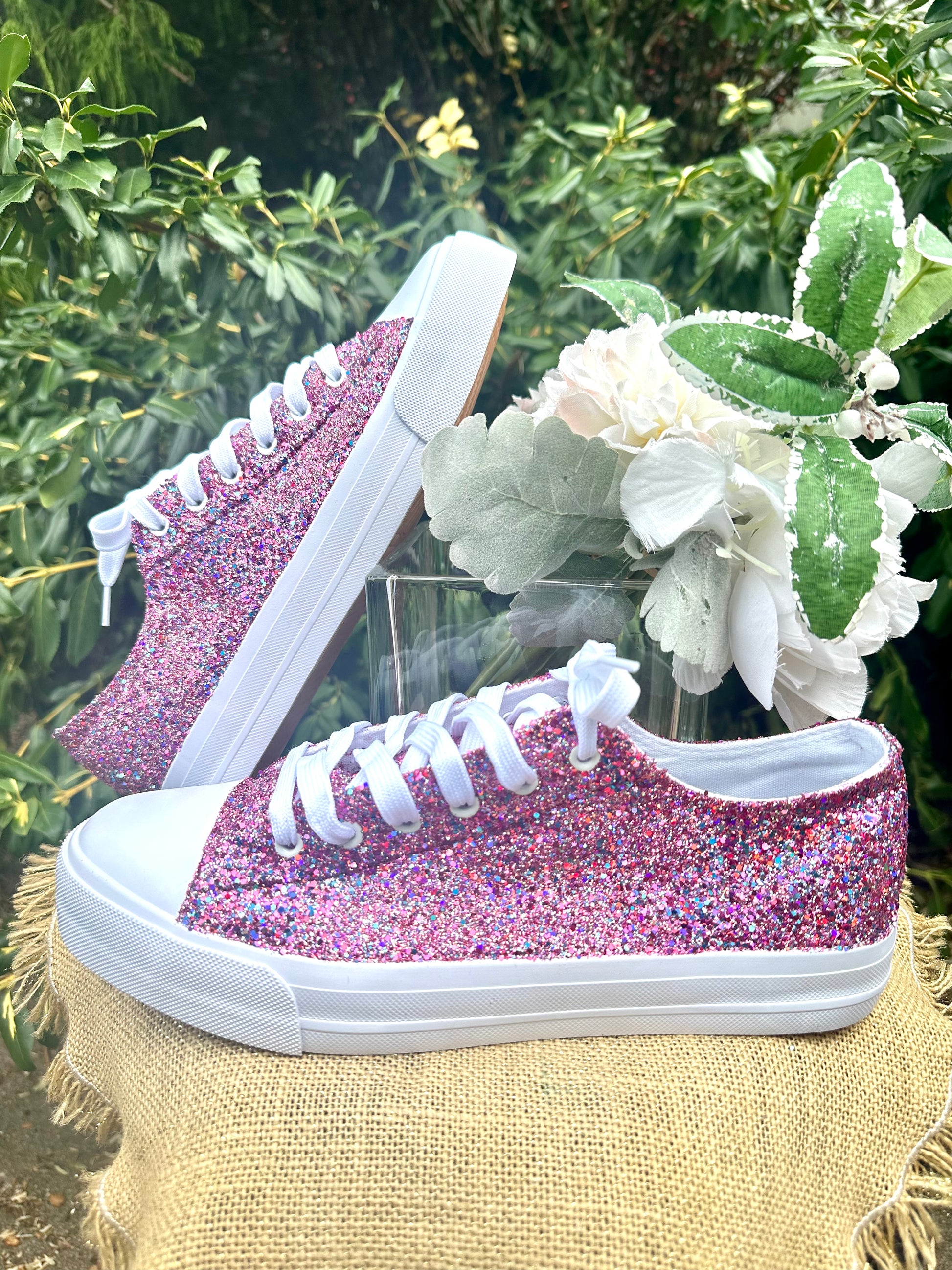Cotton Candy Pink hand glittered unbranded canvas sneakers in a gorgeous chunky pink and blue glitter mix. Made to order.
