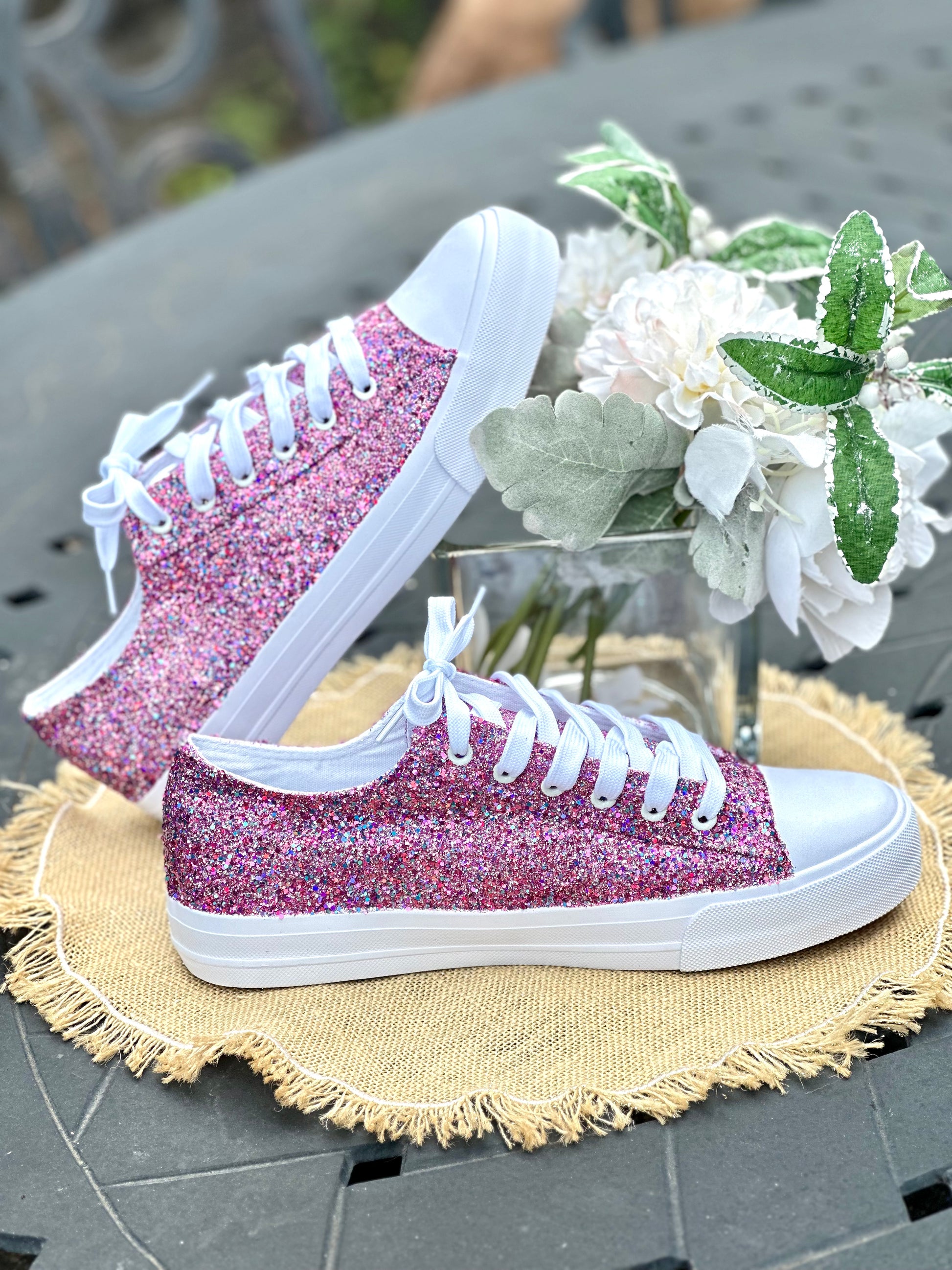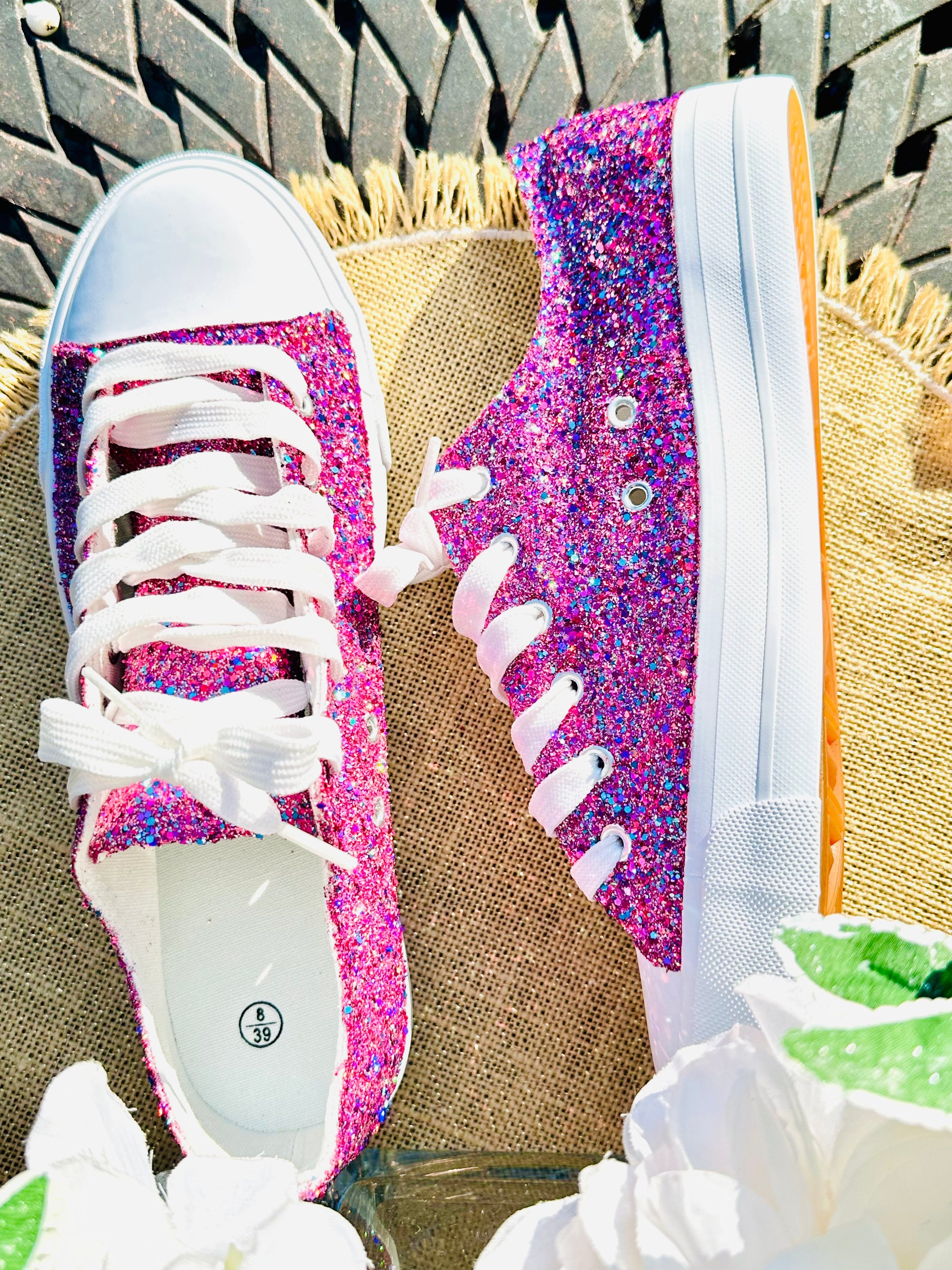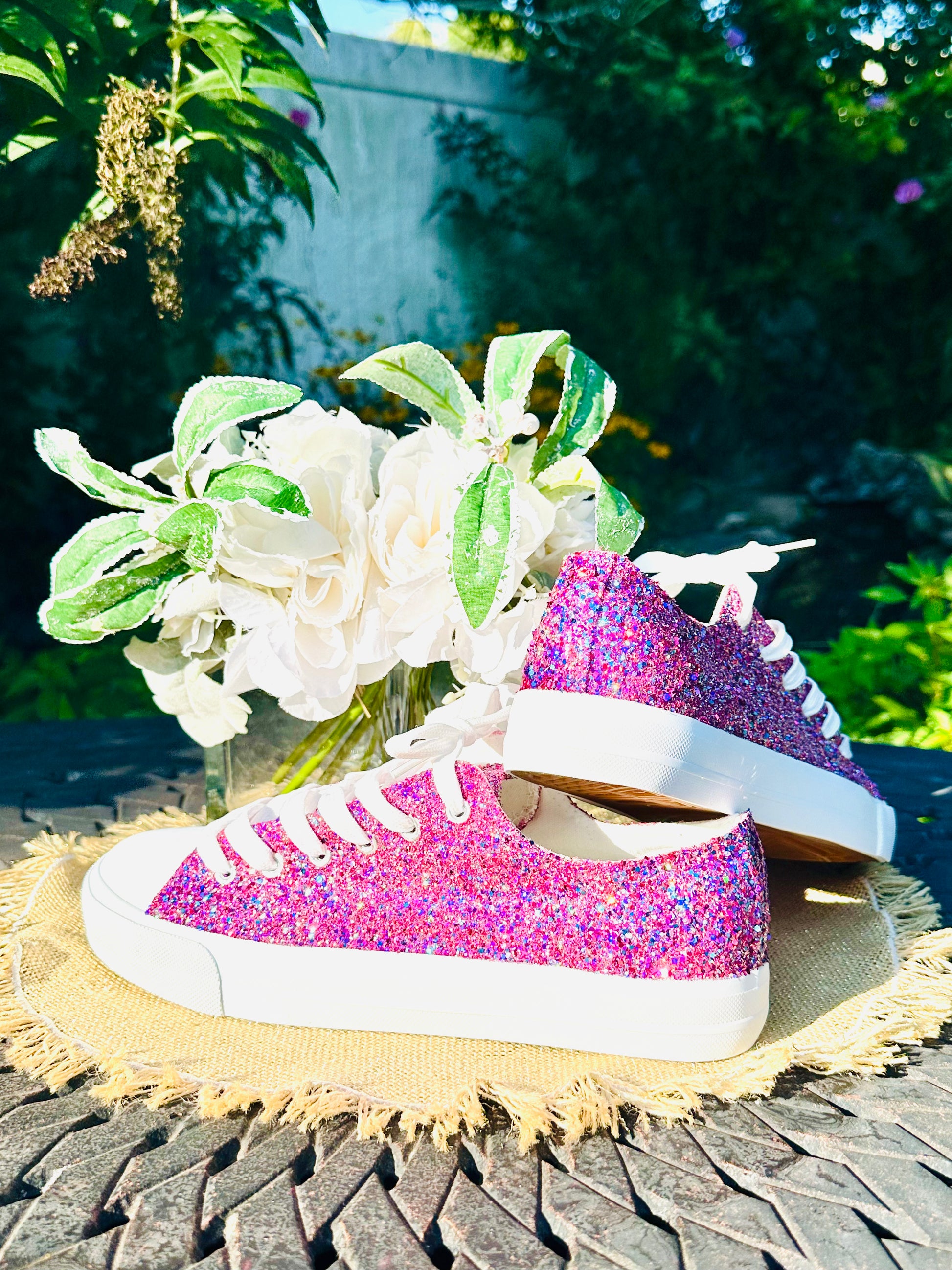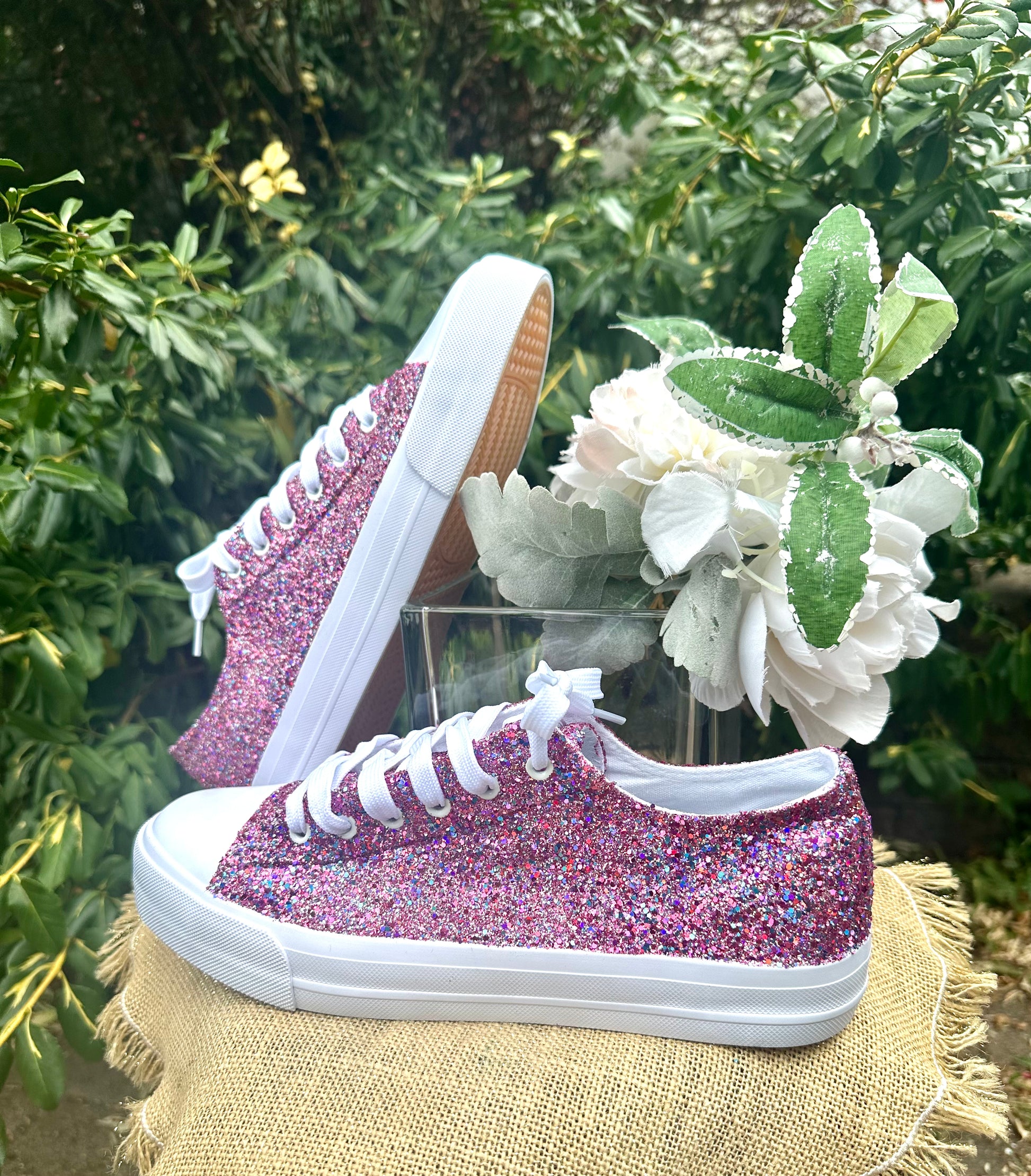 Cotton Candy Pink hand glittered unbranded canvas sneakers in a gorgeous chunky pink and blue glitter mix. Made to order.
