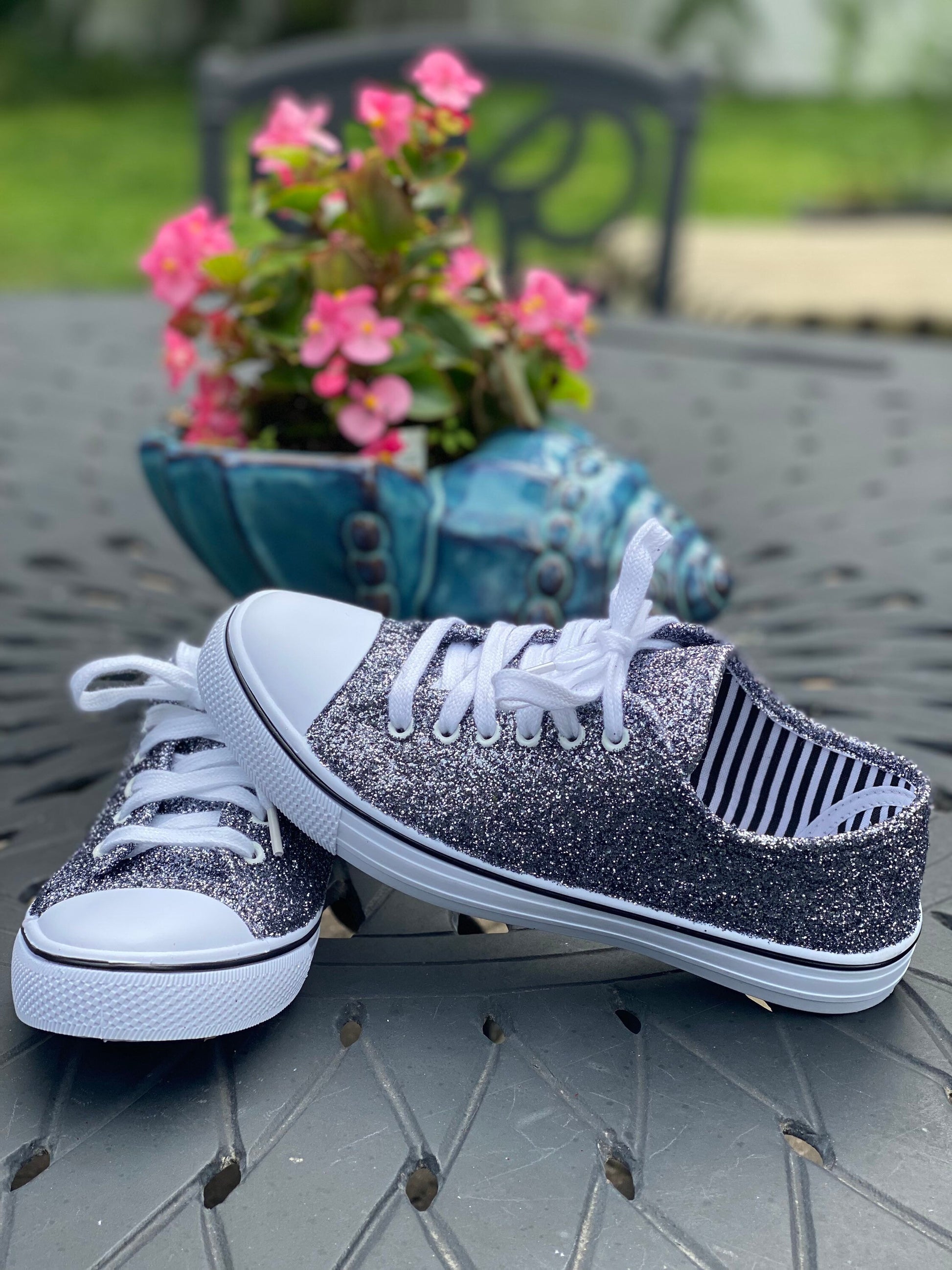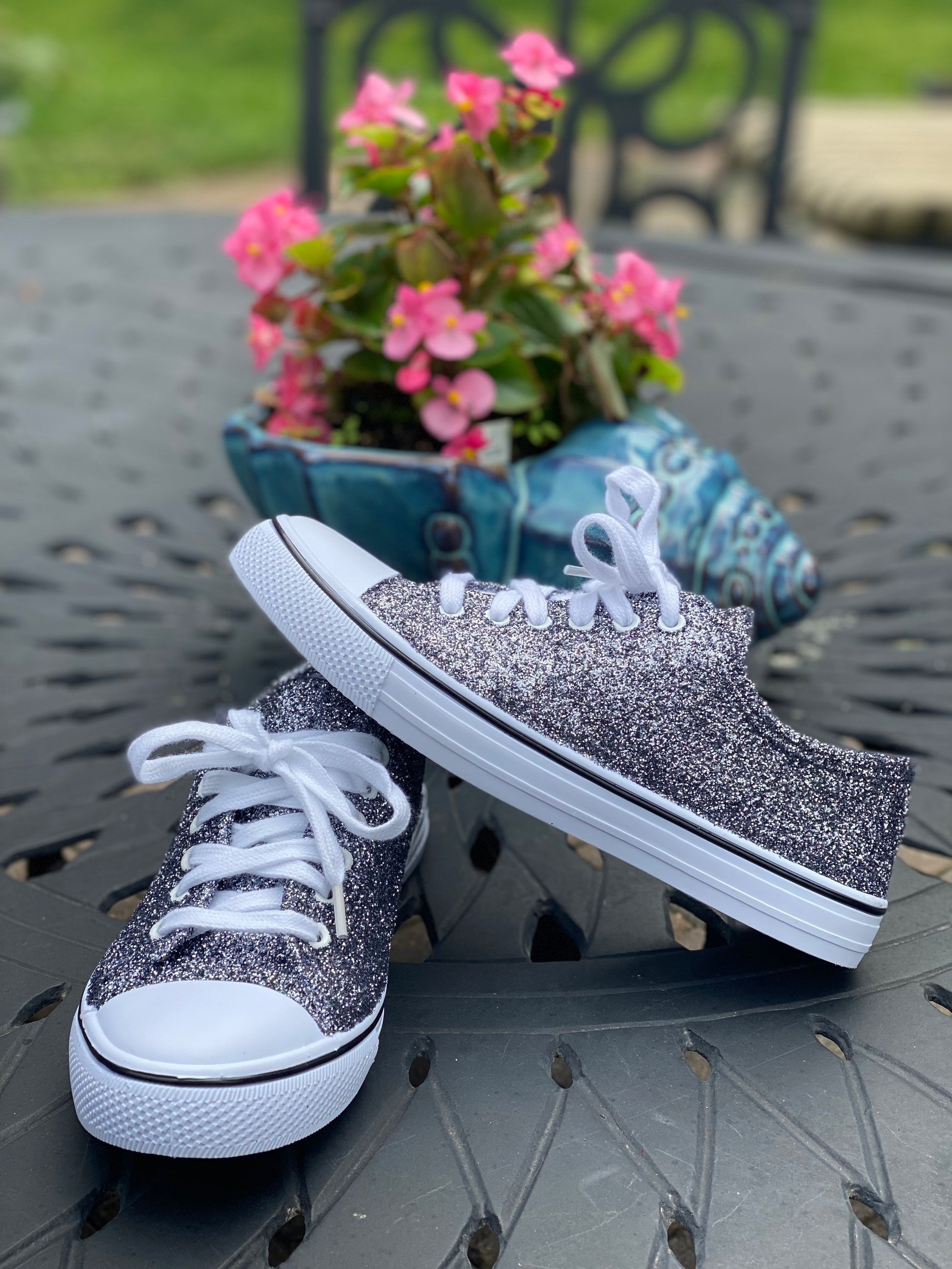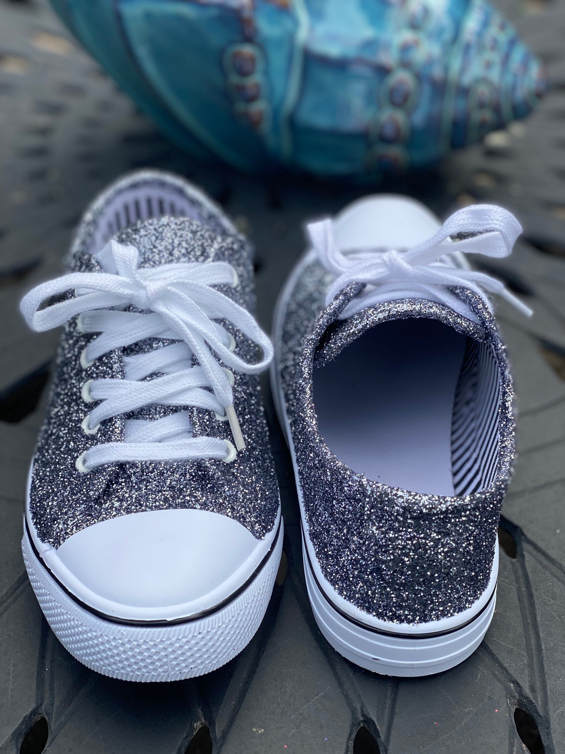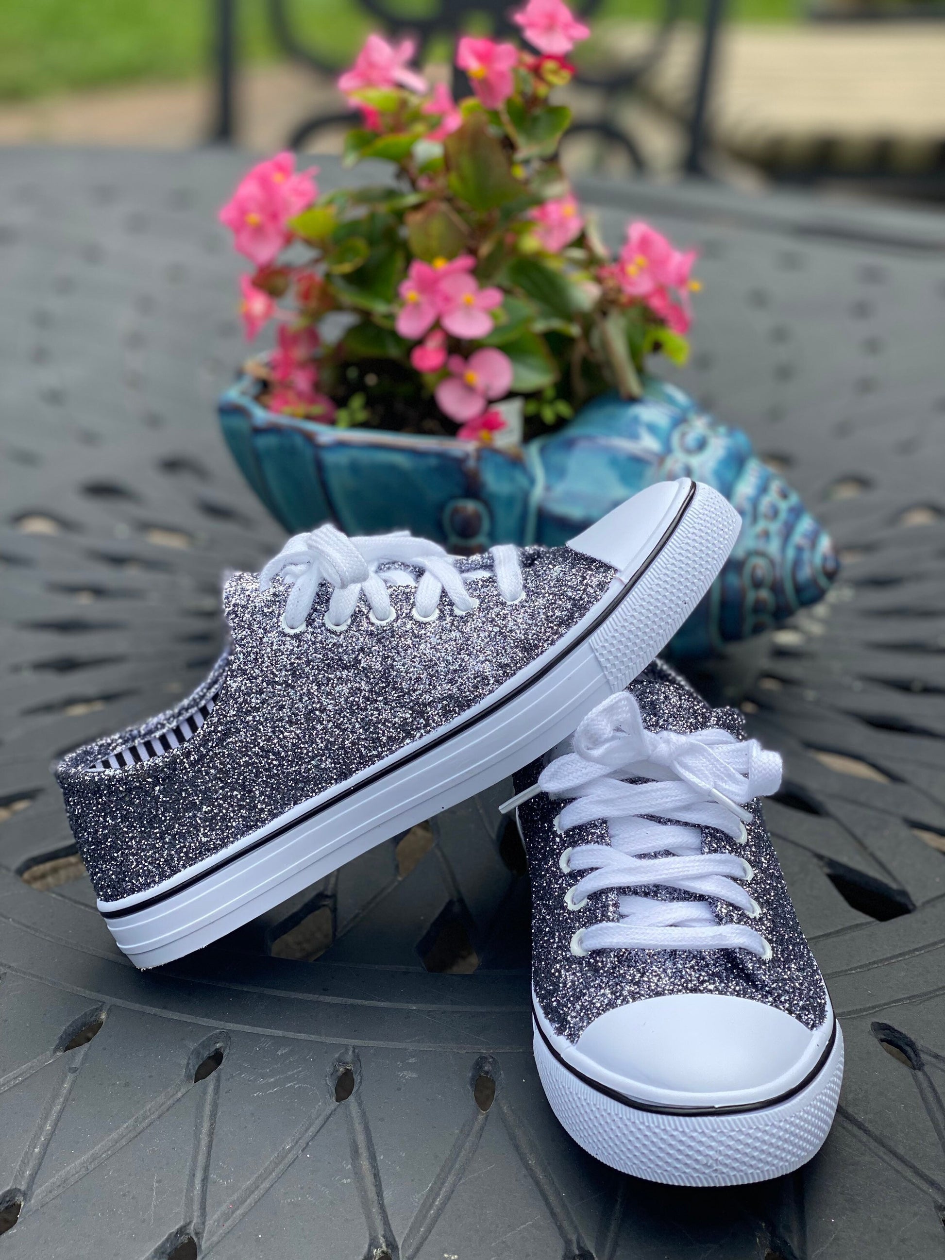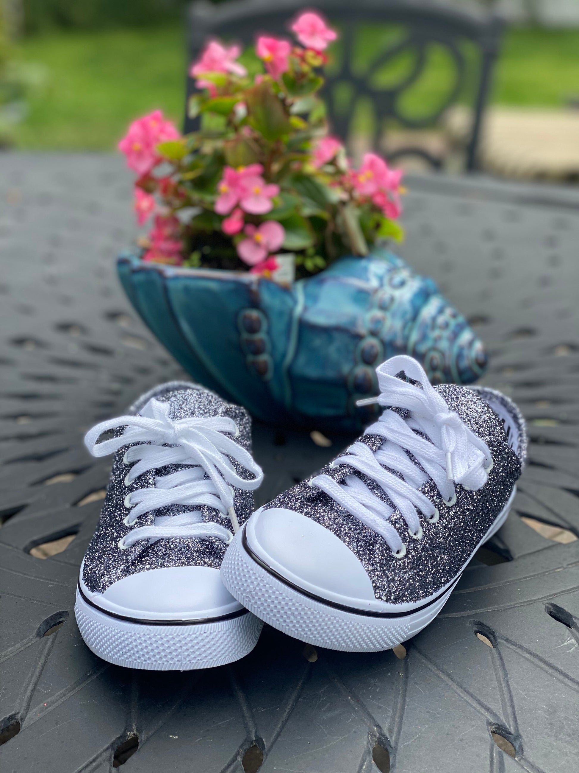 Hand Glittered unbranded canvas sneakers glittered in a gorgeous grey 'Mist' glitter. Made to order.