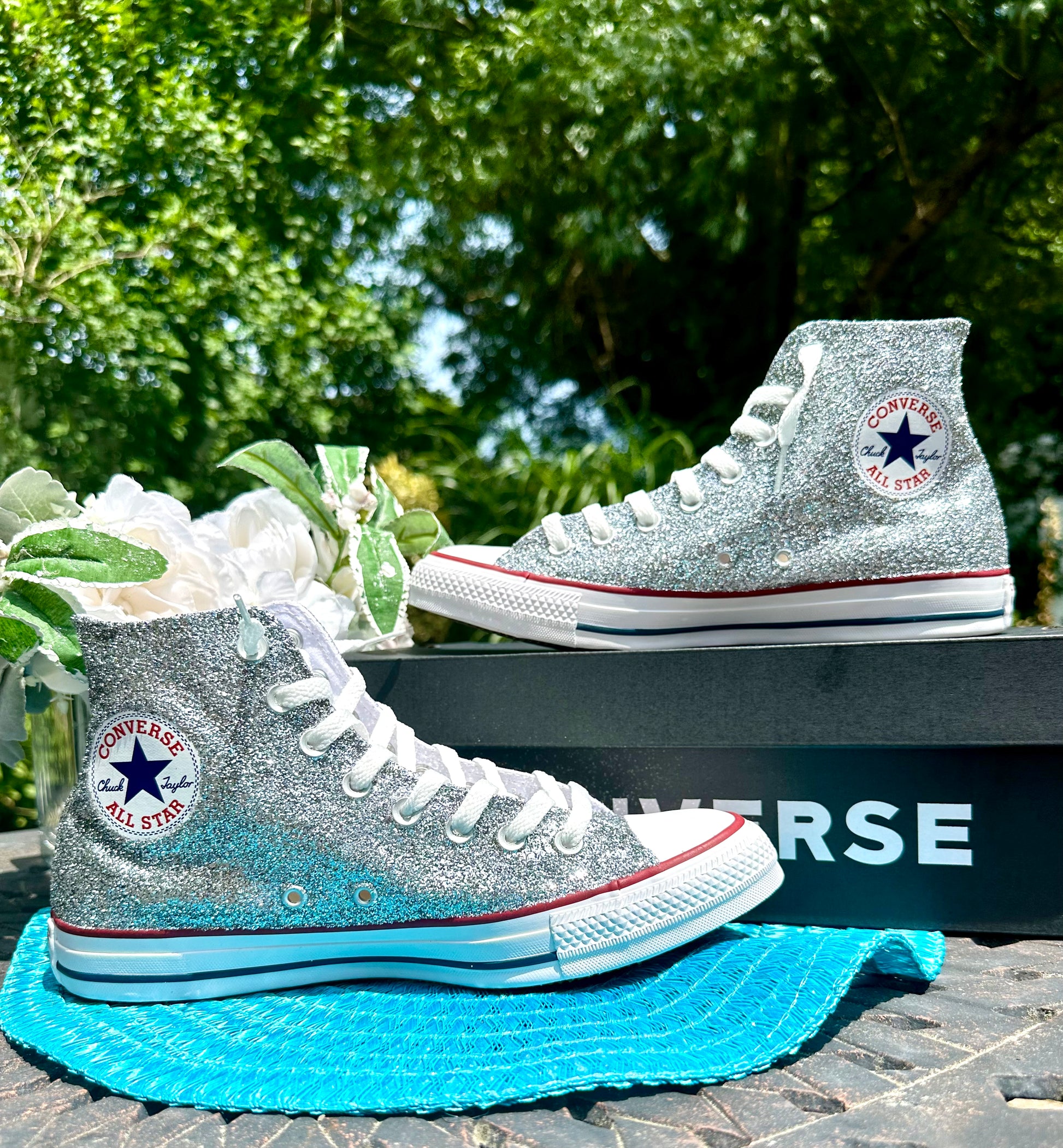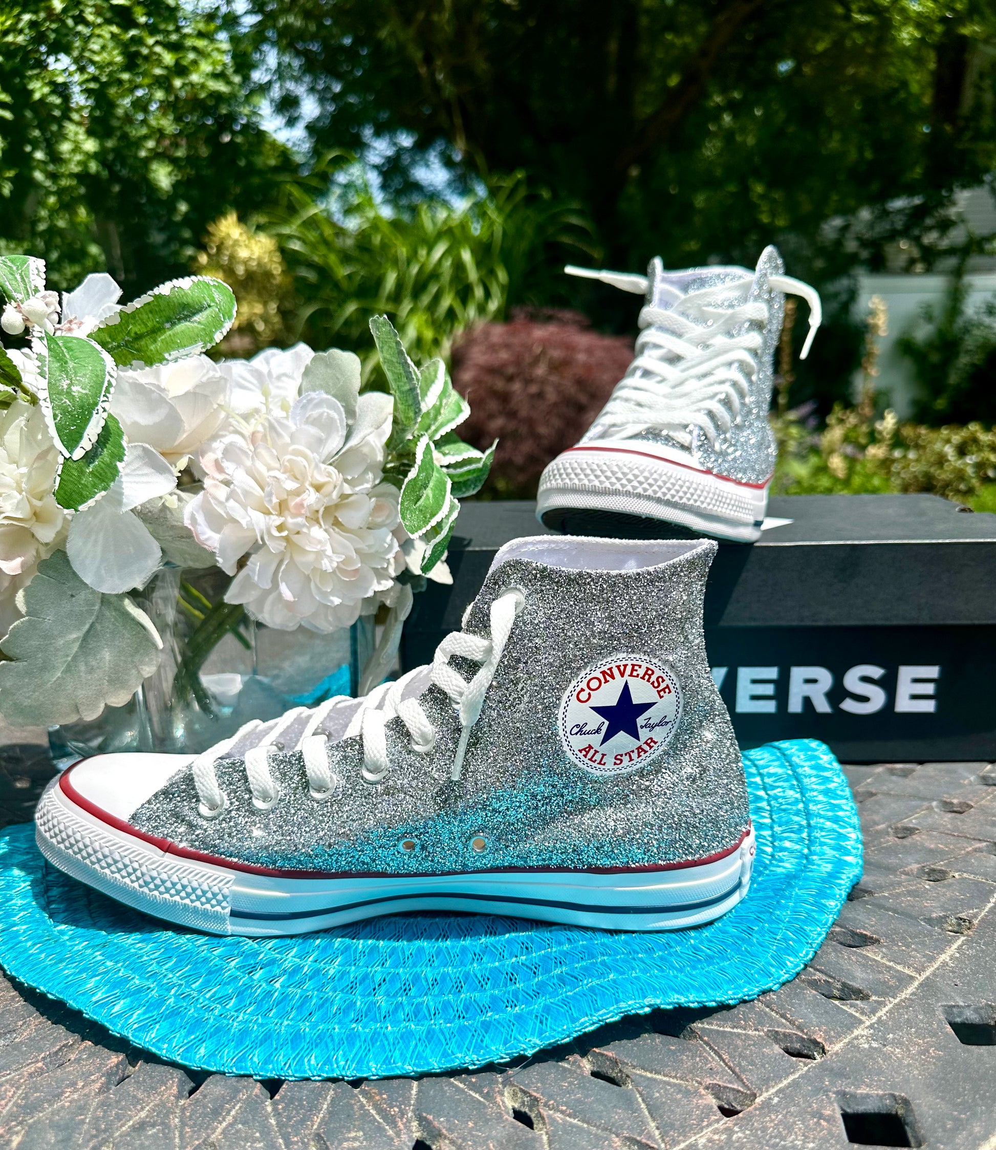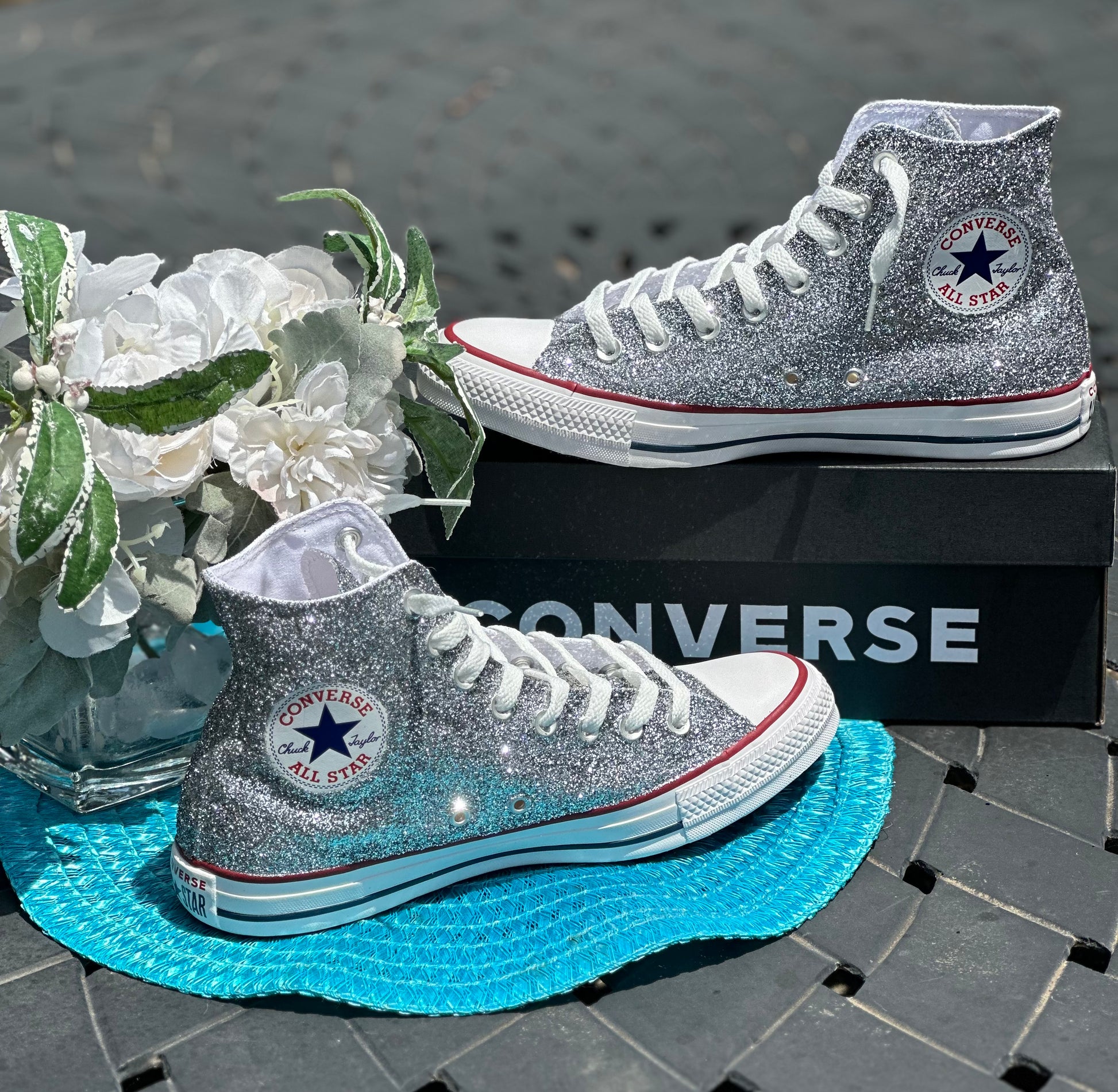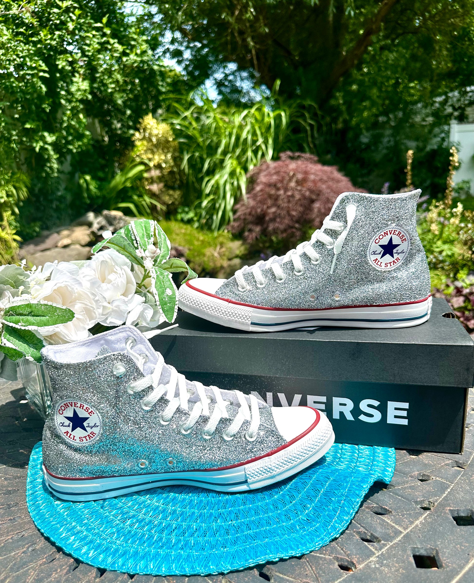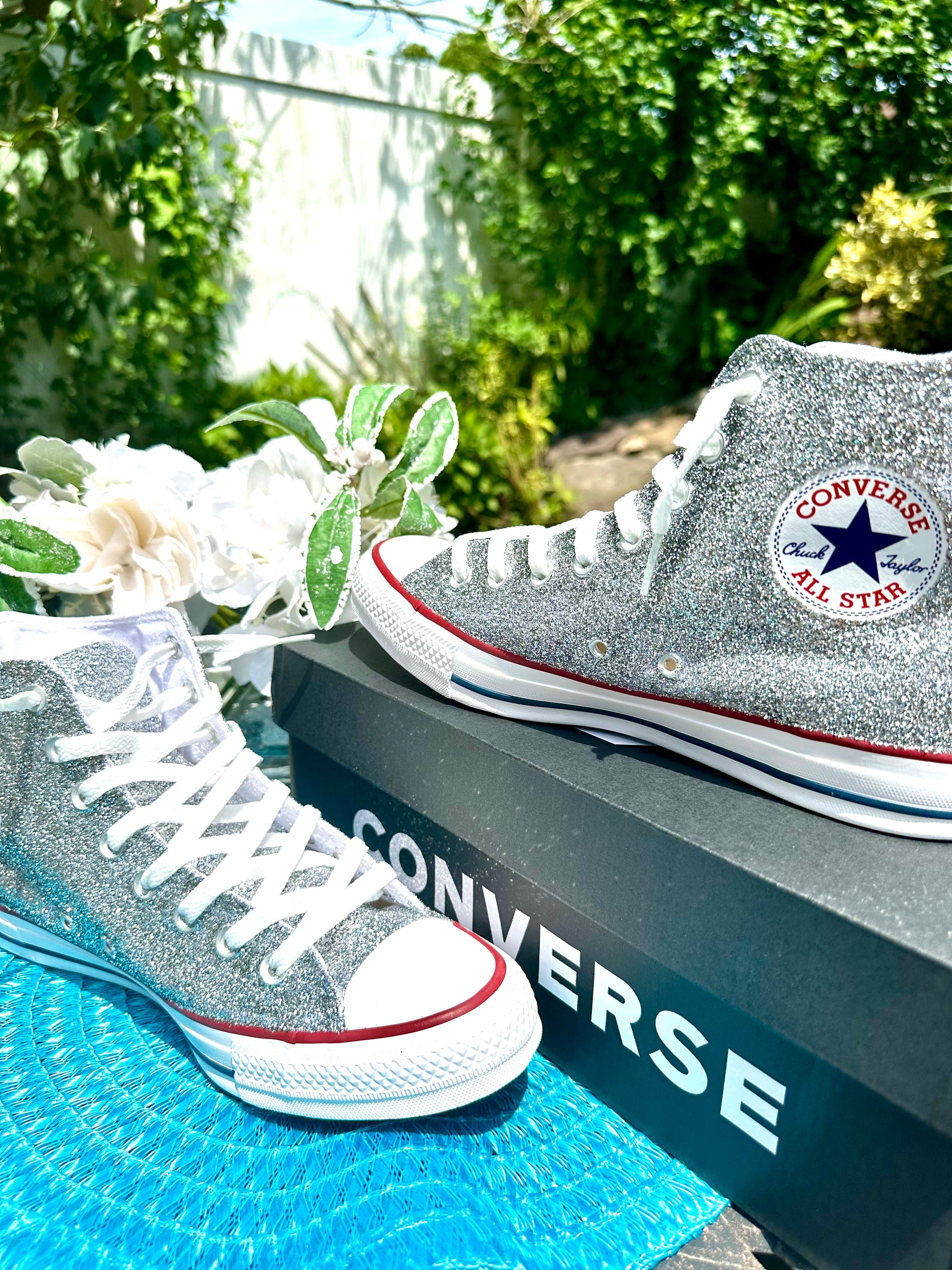 Hand Glittered High Top Converse Chuck All Star sneakers glittered in a gorgeous sparkly silver glitter named 'Oh So Chromatic'. Made to order. Please order your US Women's size.