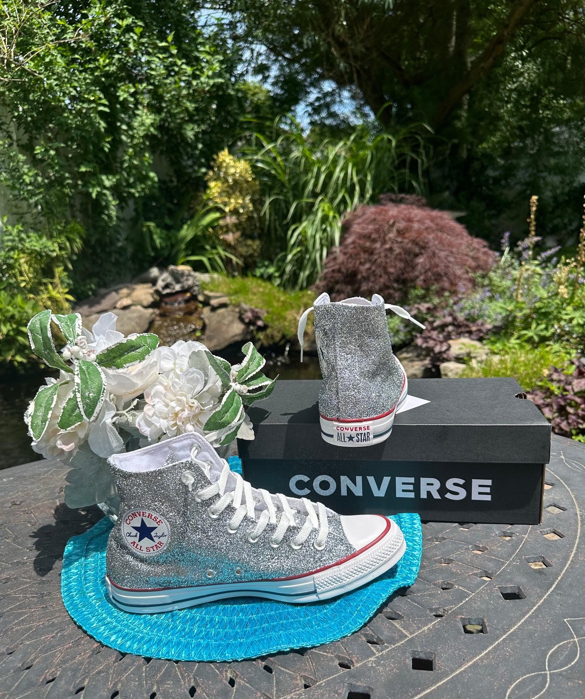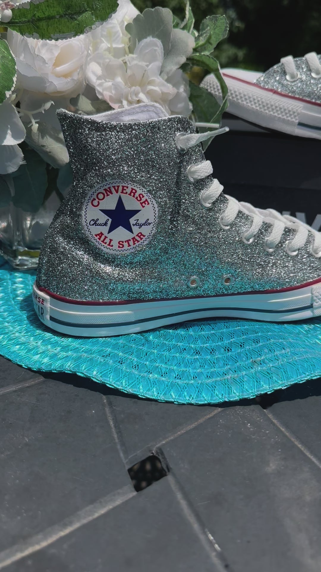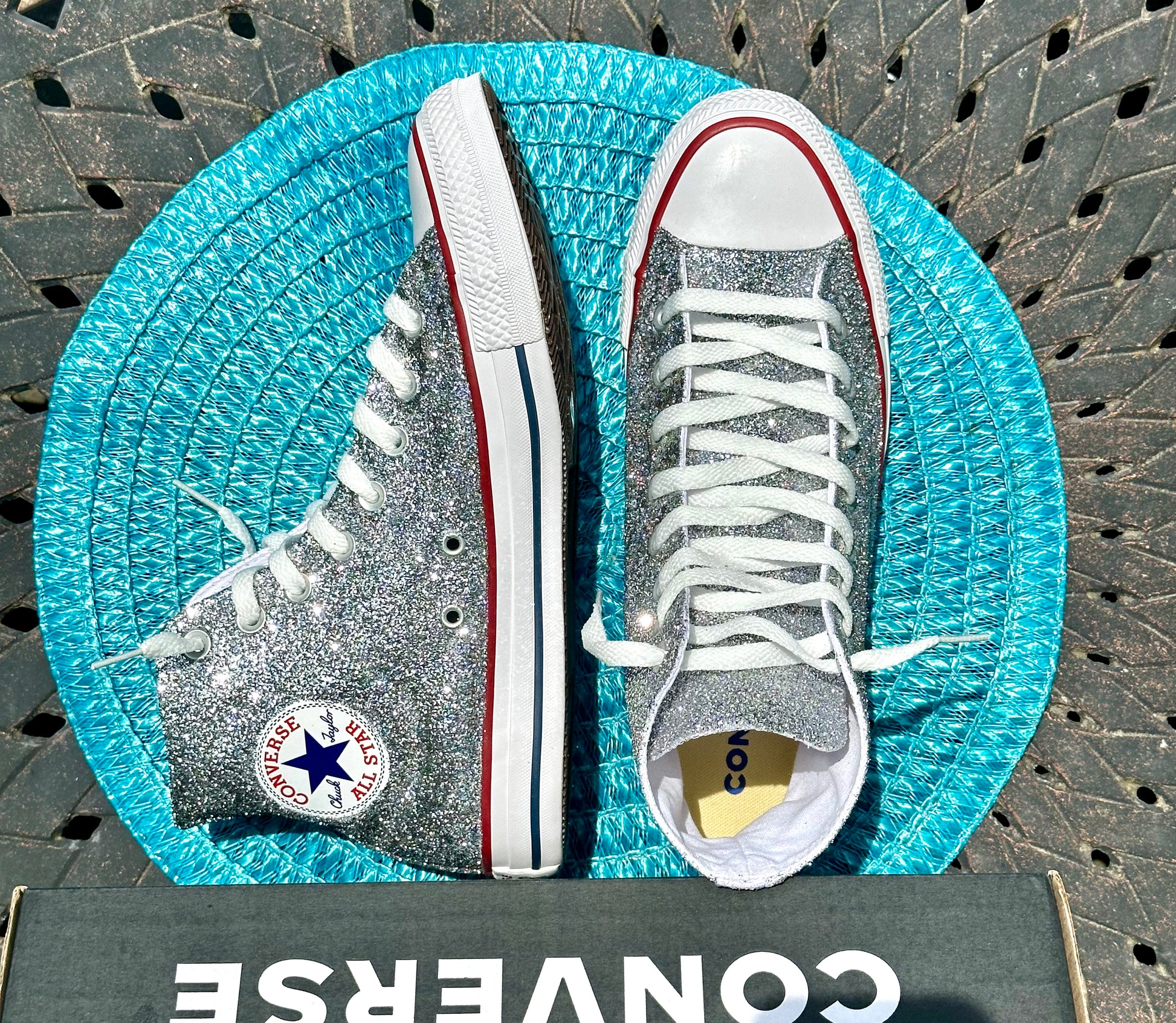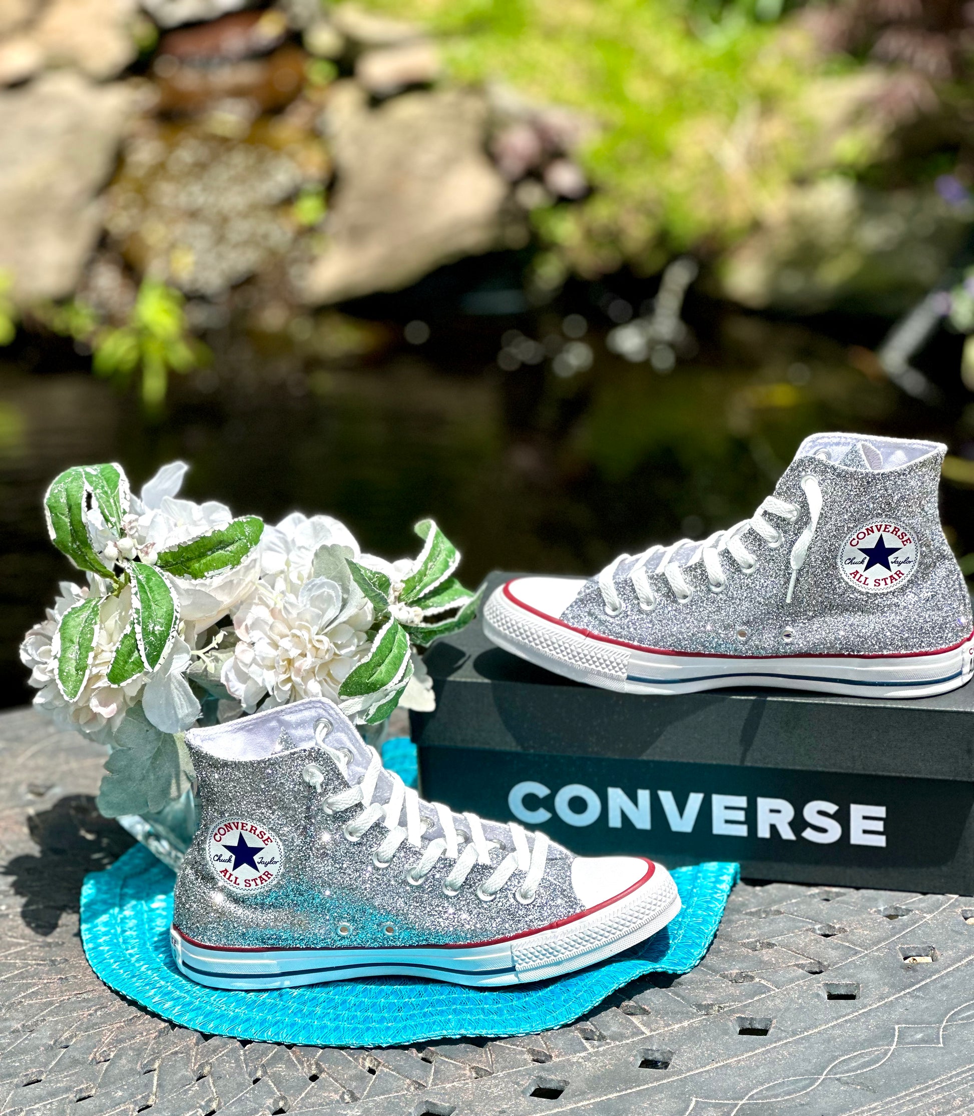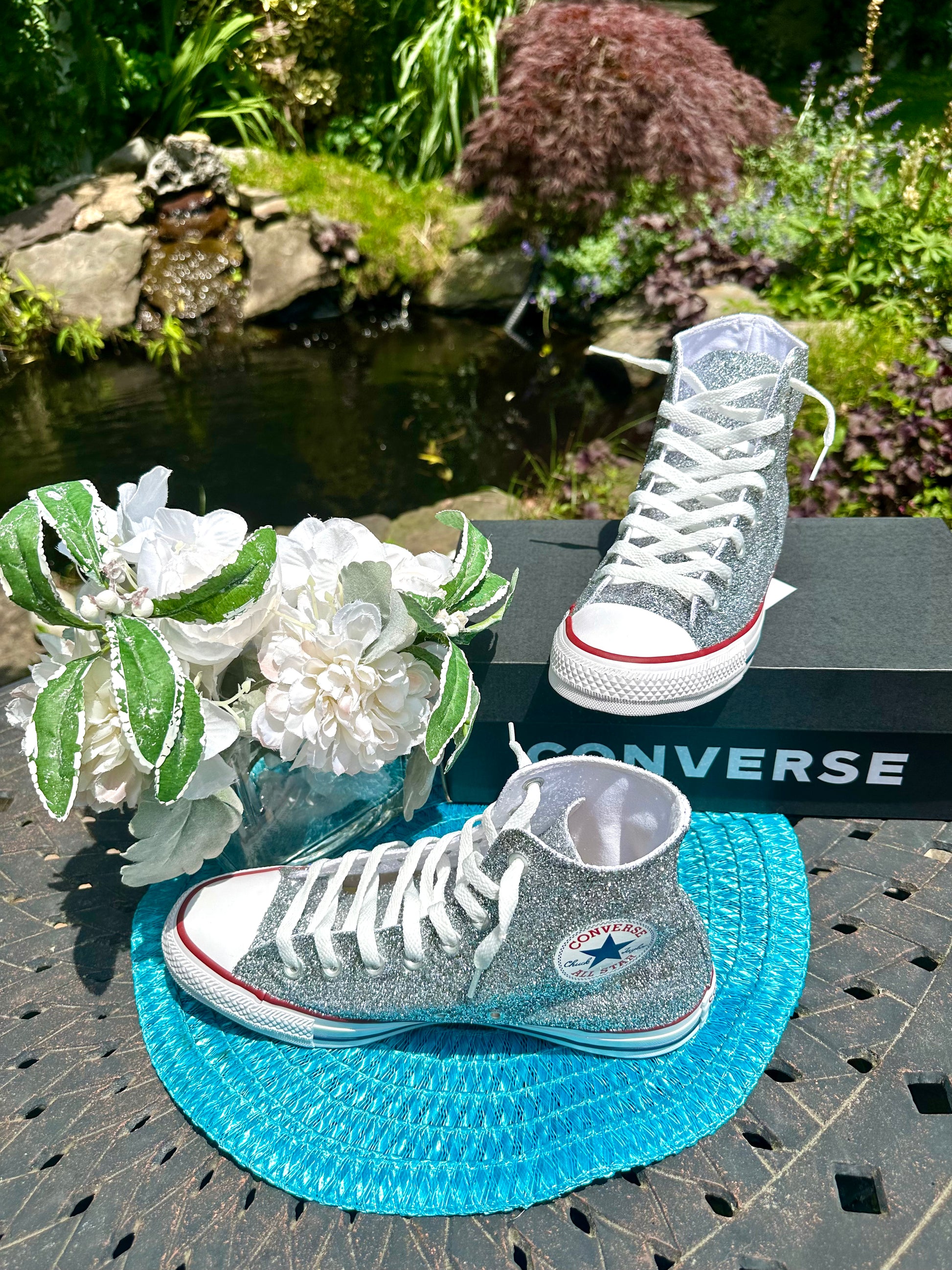 Hand Glittered High Top Converse Chuck All Star sneakers glittered in a gorgeous sparkly silver glitter named 'Oh So Chromatic'. Made to order. Please order your US Women's size.