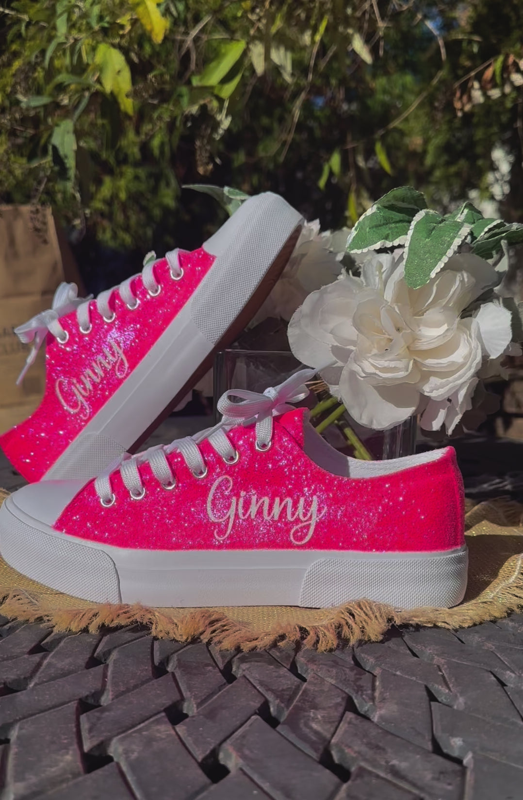 Hot Pink hand glittered unbranded canvas sneakers in a gorgeous 'Sugar Baby' pink. Made to order.