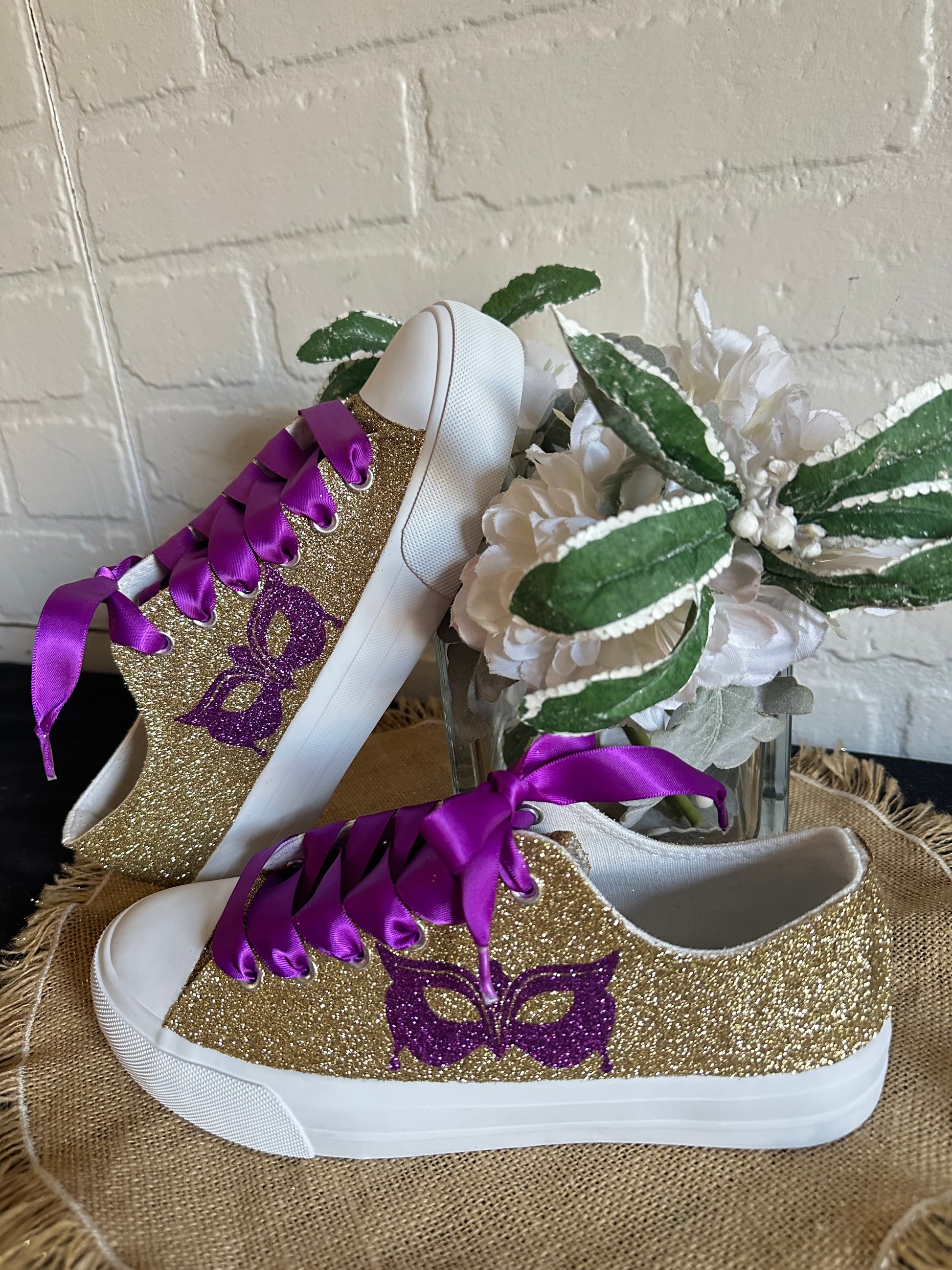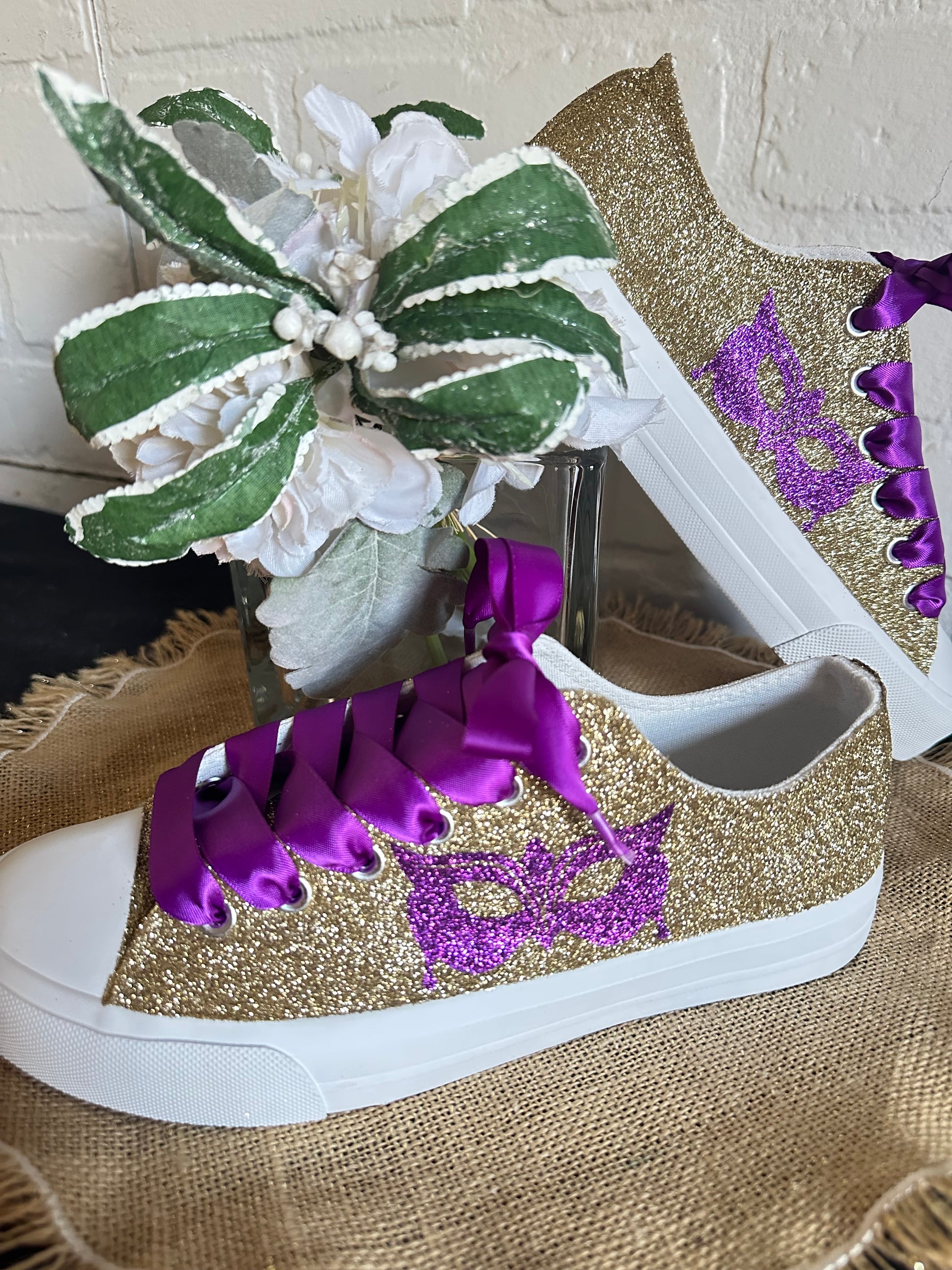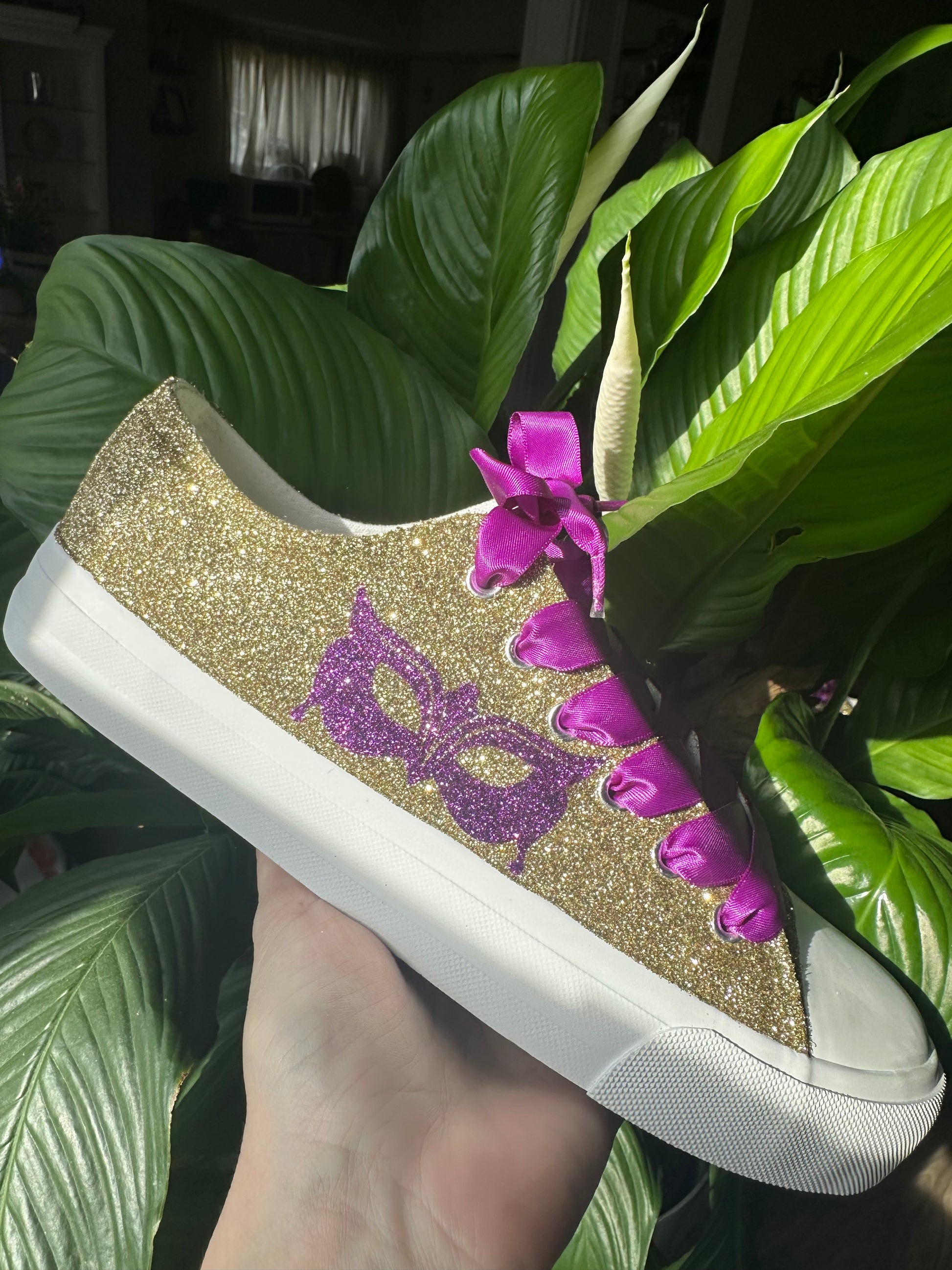 Hand Glittered unbranded canvas sneakers glittered in a gorgeous gold with hand placed purple glitter masquerade mask on the outside of each sneaker. Purple Ribbon Laces included. Made to order.
