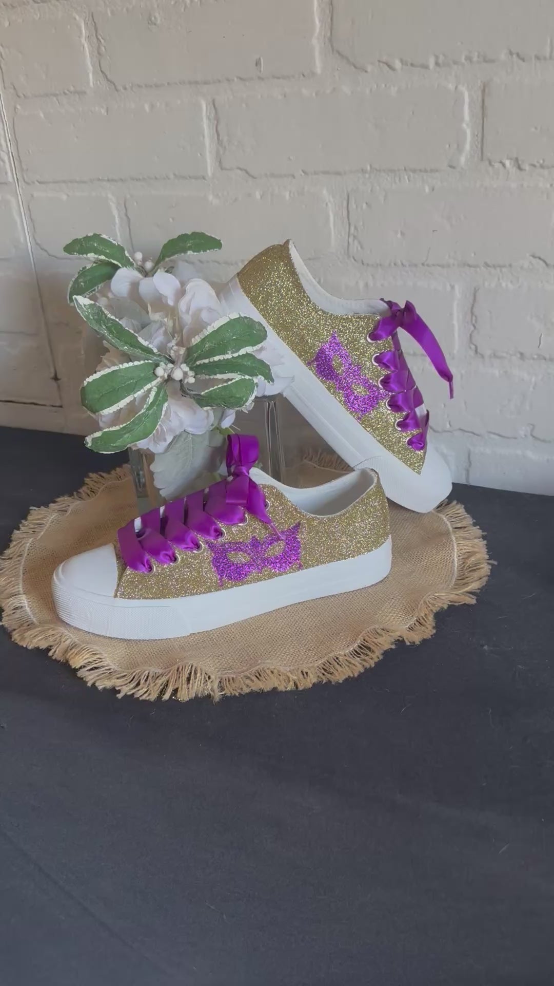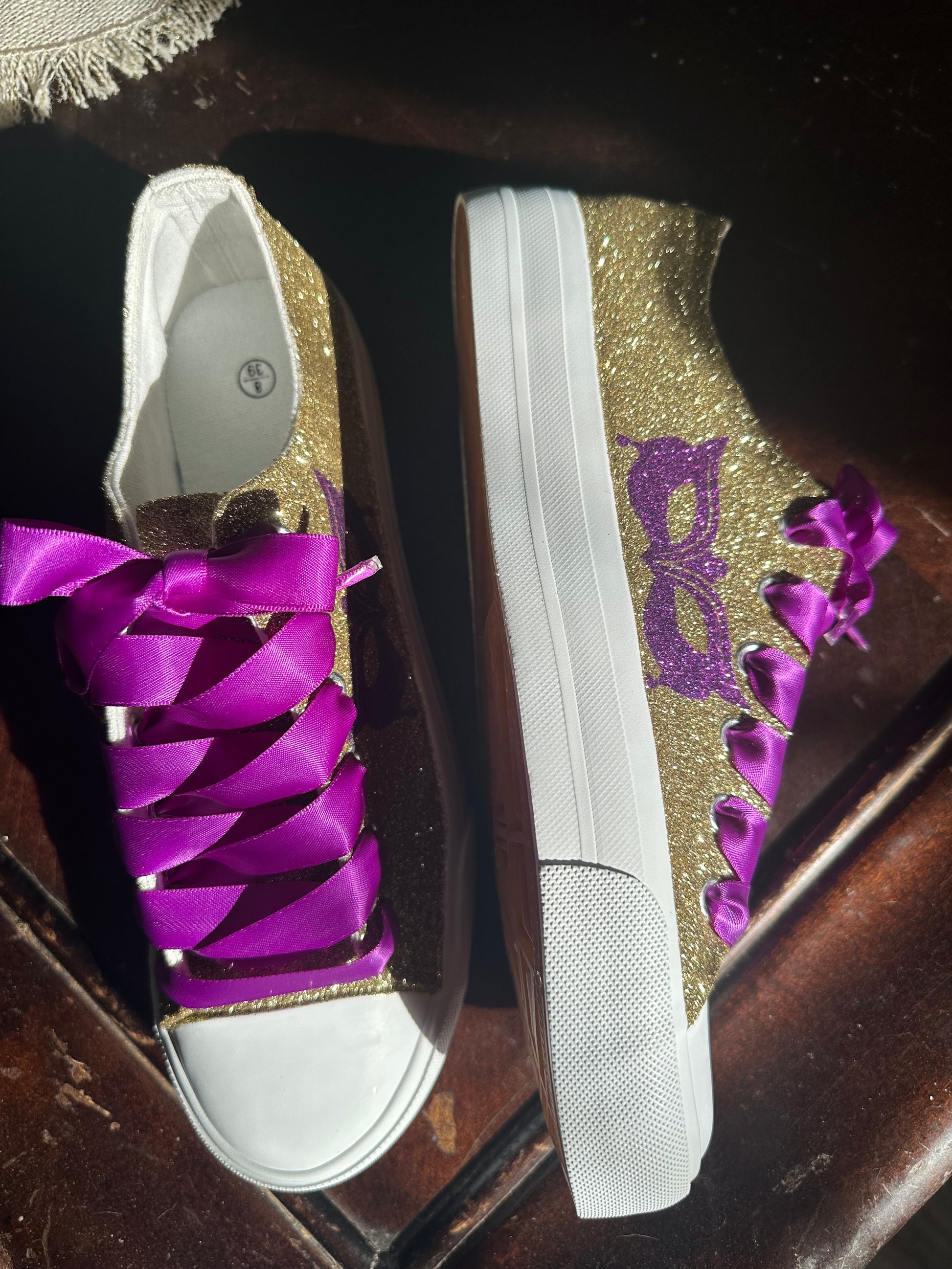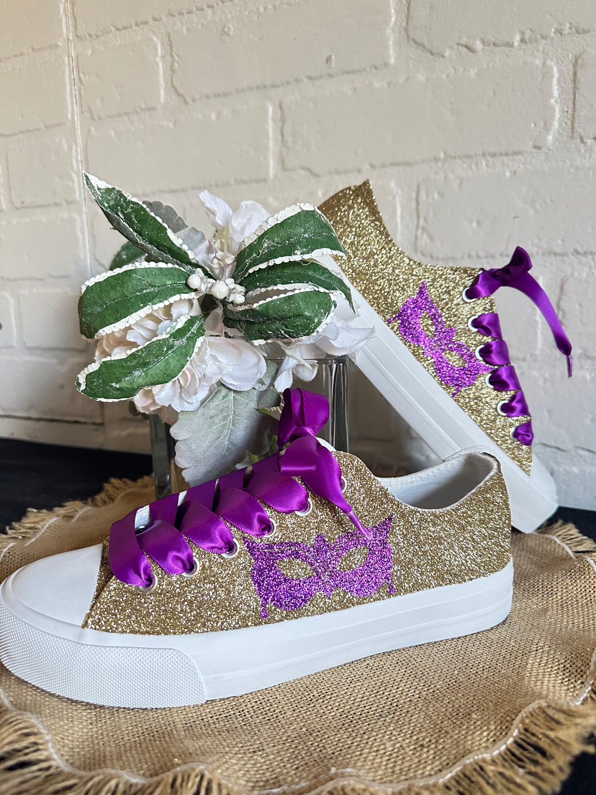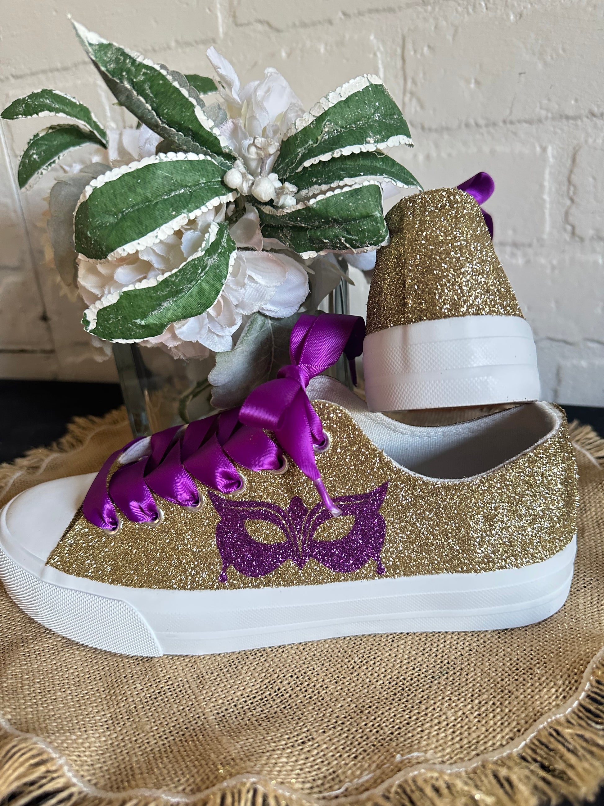 Hand Glittered unbranded canvas sneakers glittered in a gorgeous gold with hand placed purple glitter masquerade mask on the outside of each sneaker. Purple Ribbon Laces included. Made to order.
