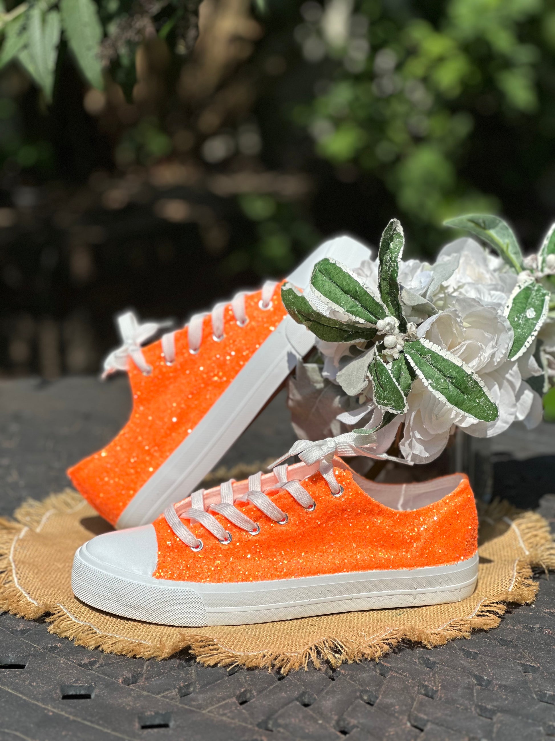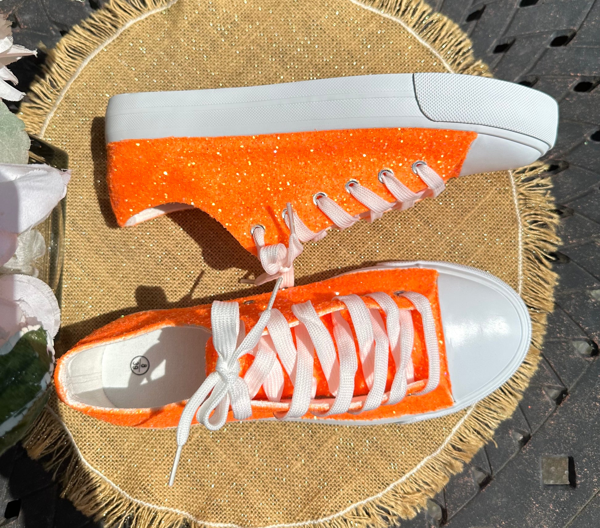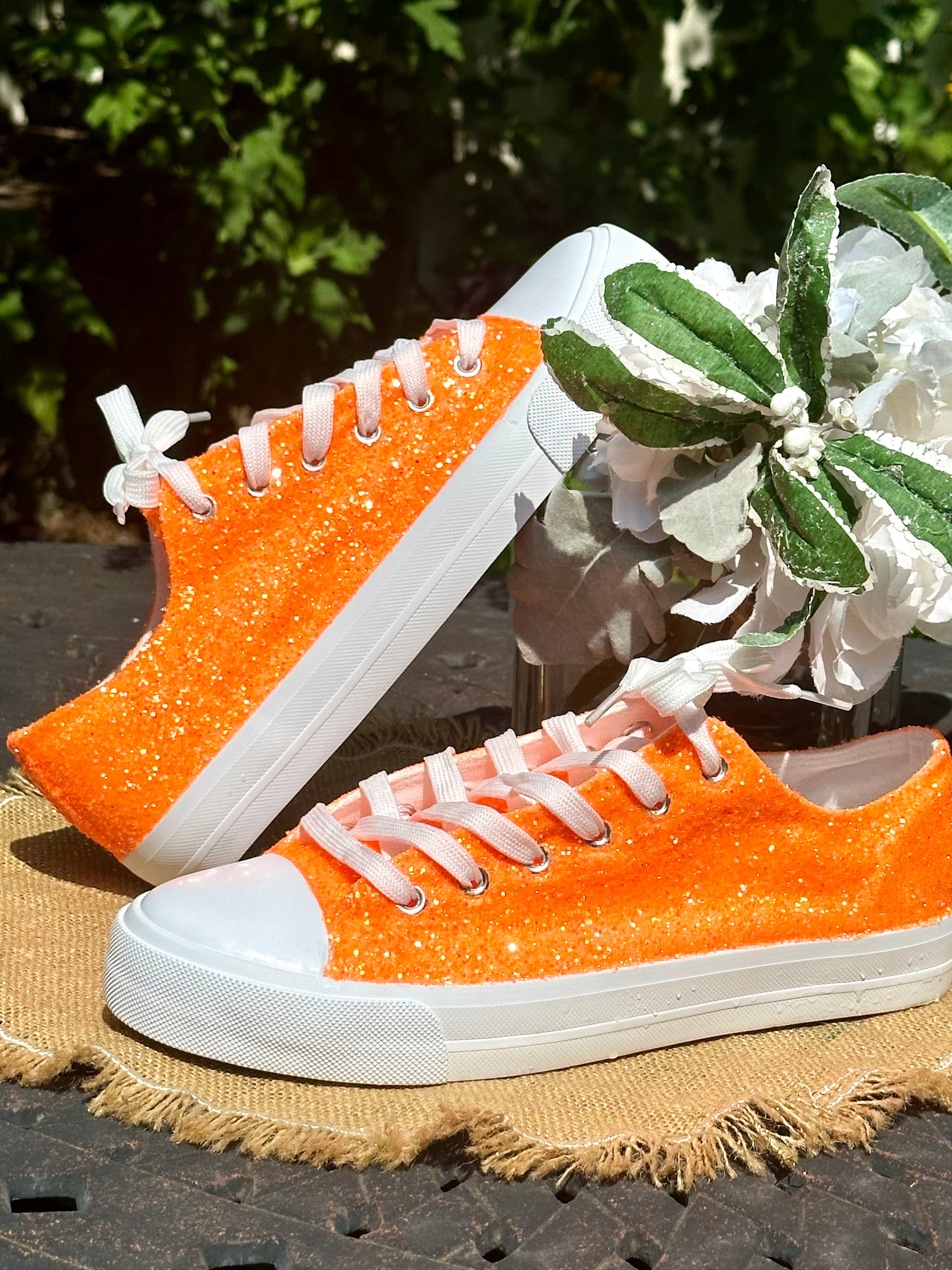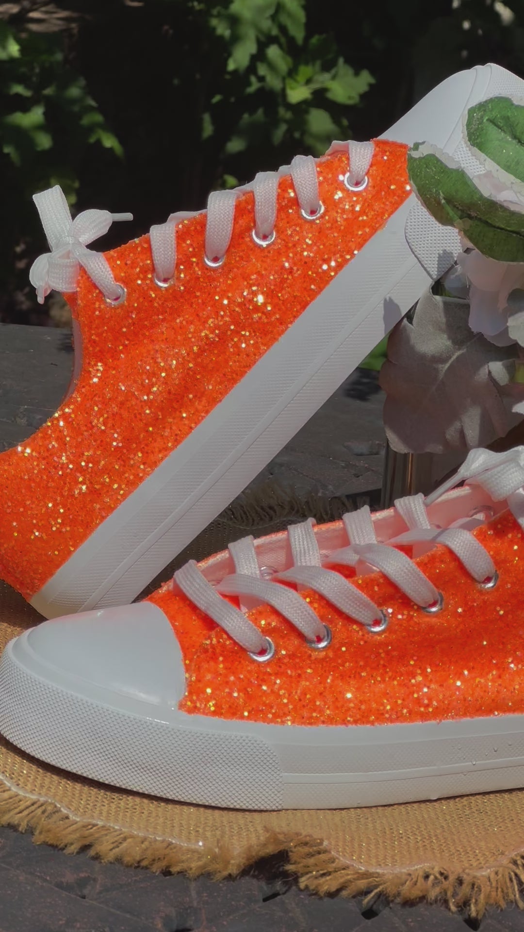 Hand Glittered unbranded canvas sneakers glittered in a gorgeous orange chunky glitter. Made to order.