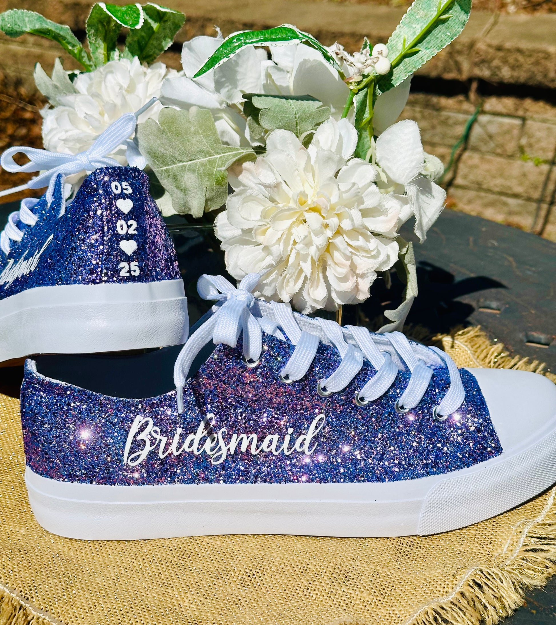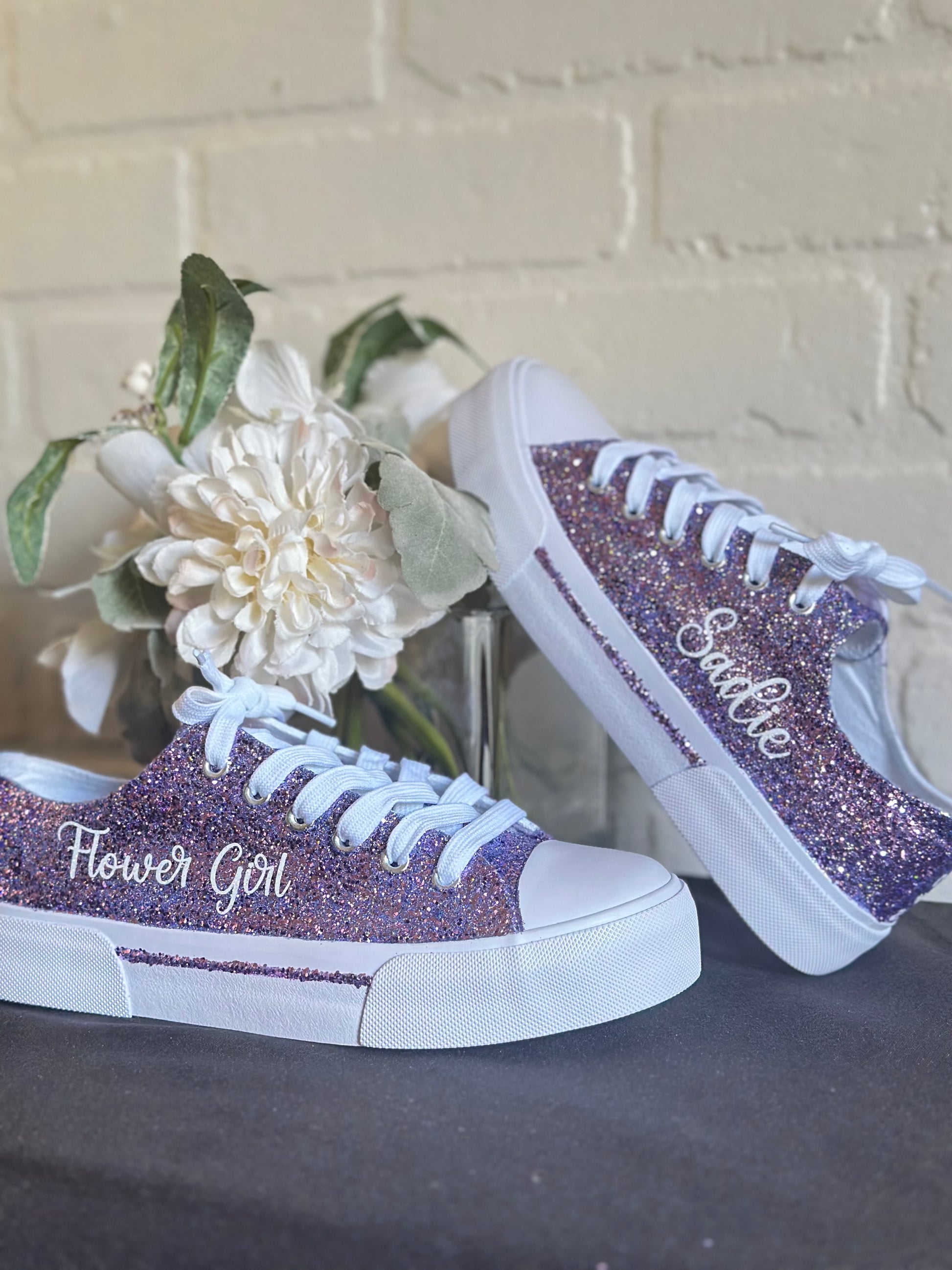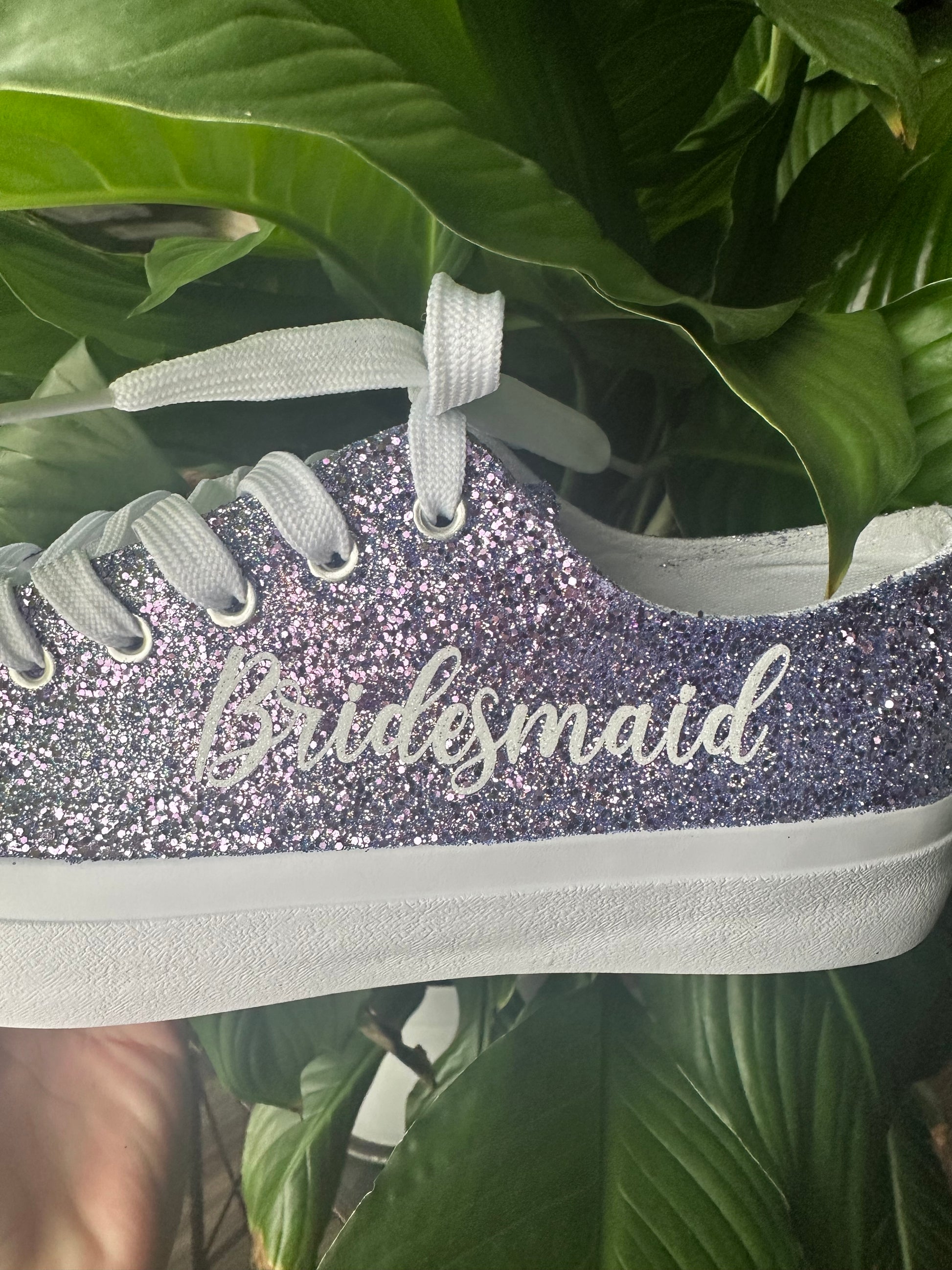 I also create glitter shoes and sneakers for bridal parties and special occasions and color match to your desired color. Kids sizes available upon request. Contact me for a custom quote.