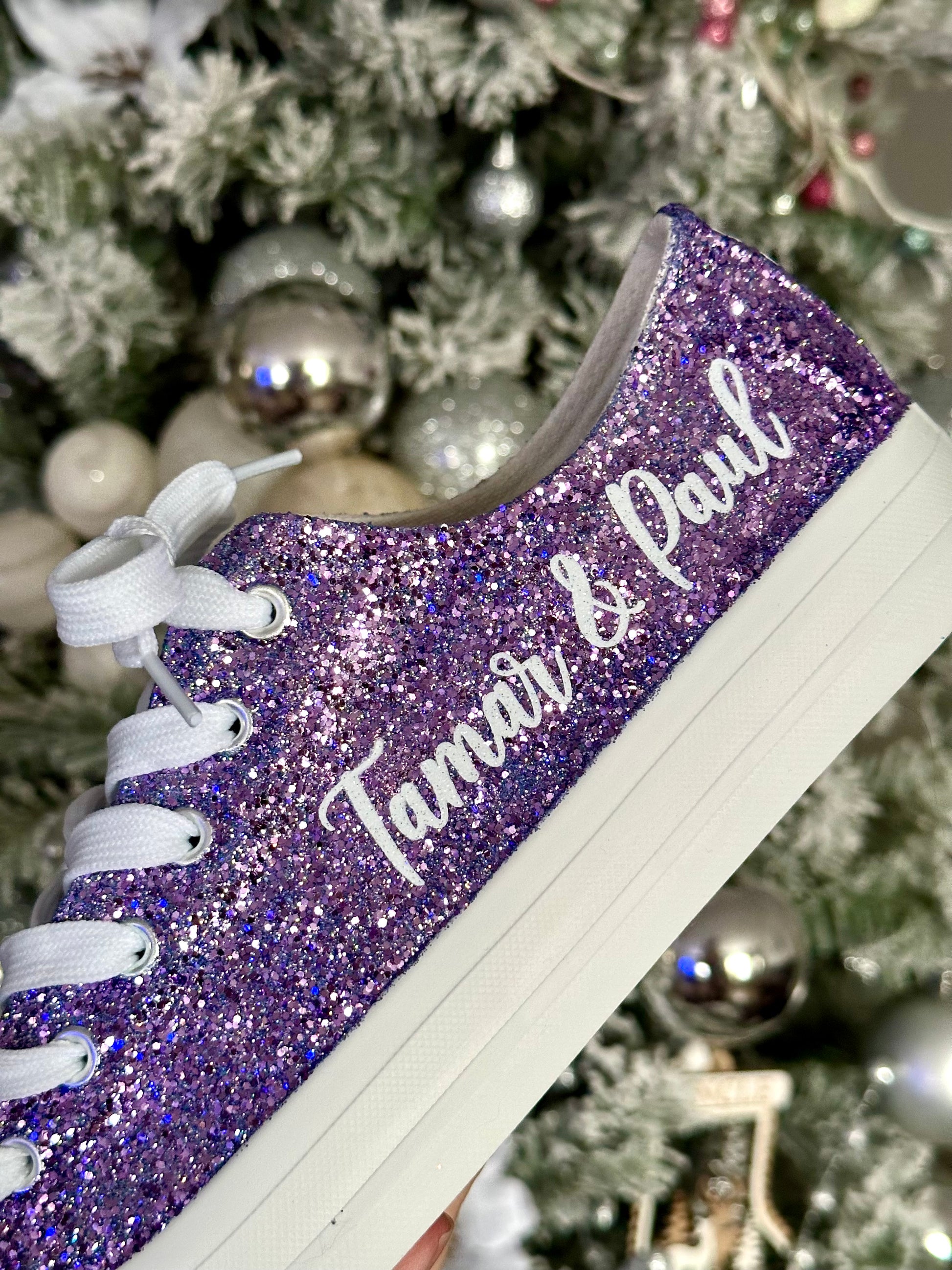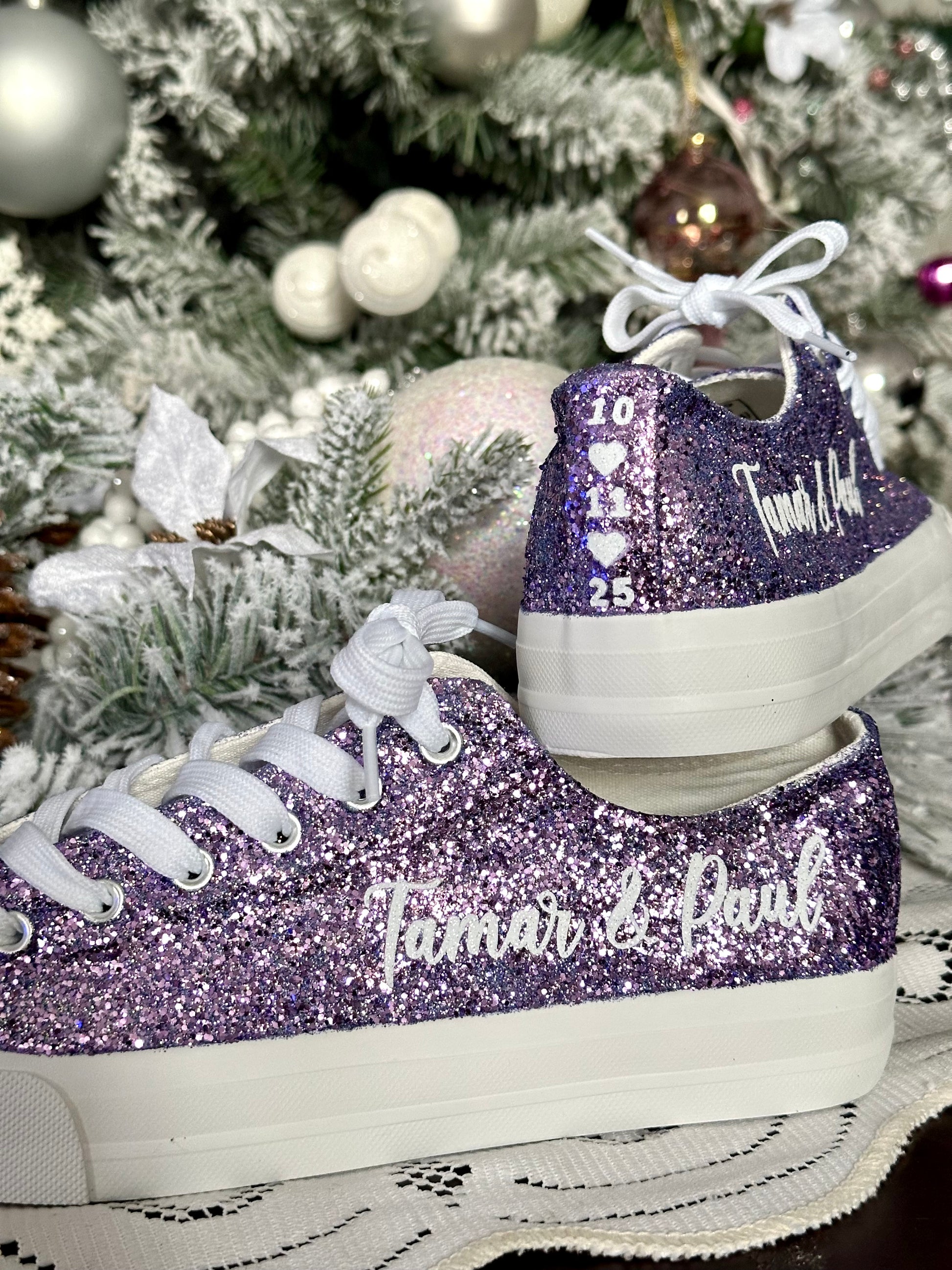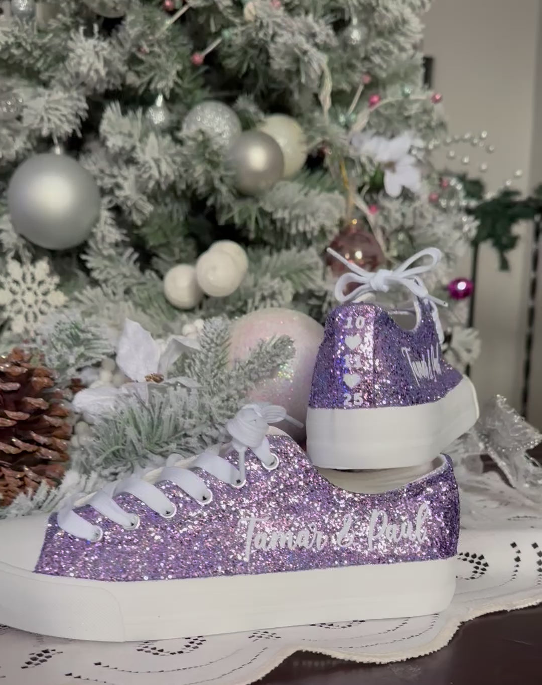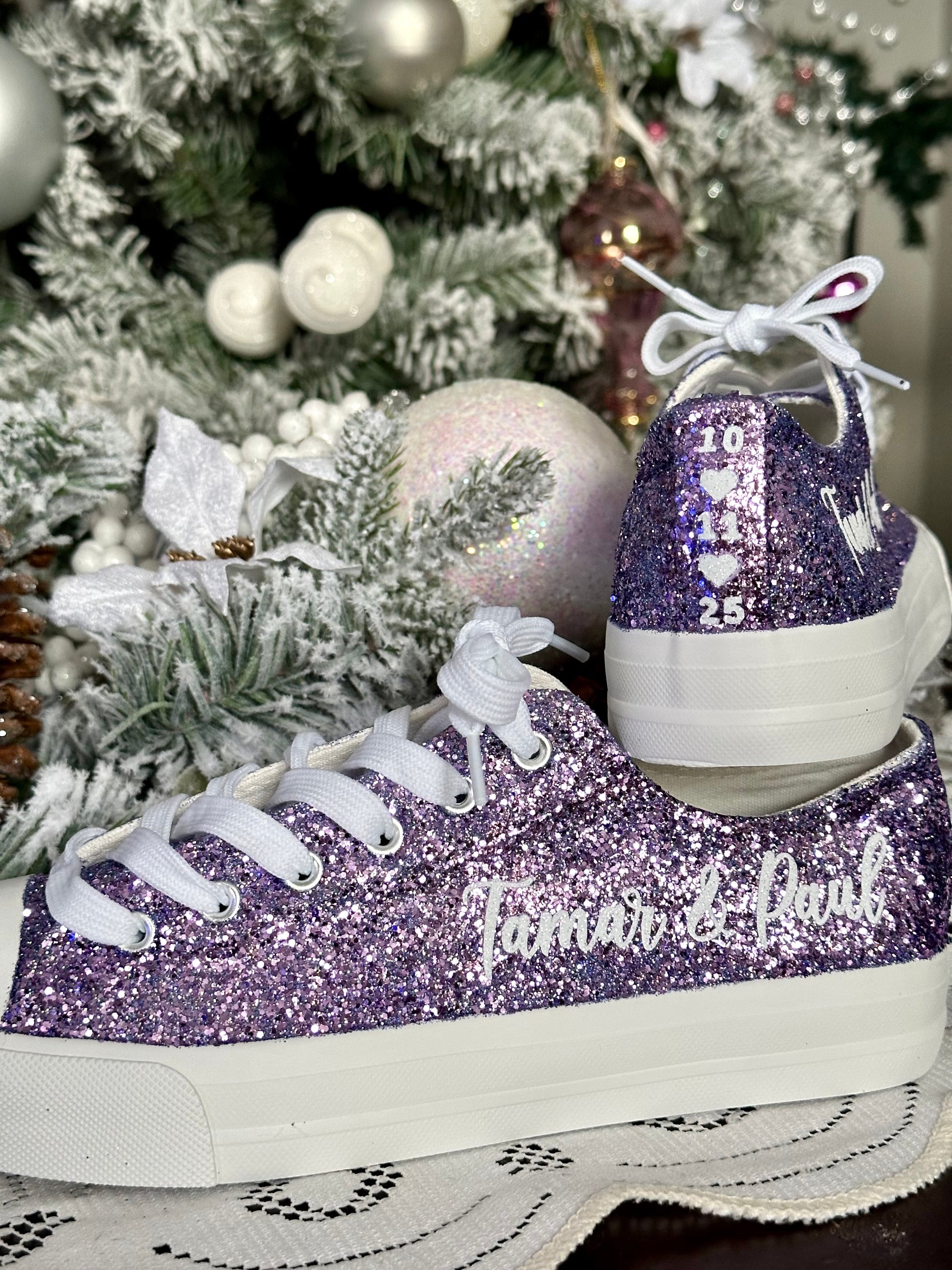 Personalized for your lilac purple wedding and made just for you! These hand glittered unbranded canvas are sneakers glittered in a gorgeous lilac purple called 'Lilac You A Lot' and are perfect for your special wedding day, bridal shower, bachelorette party or wedding weekend.
