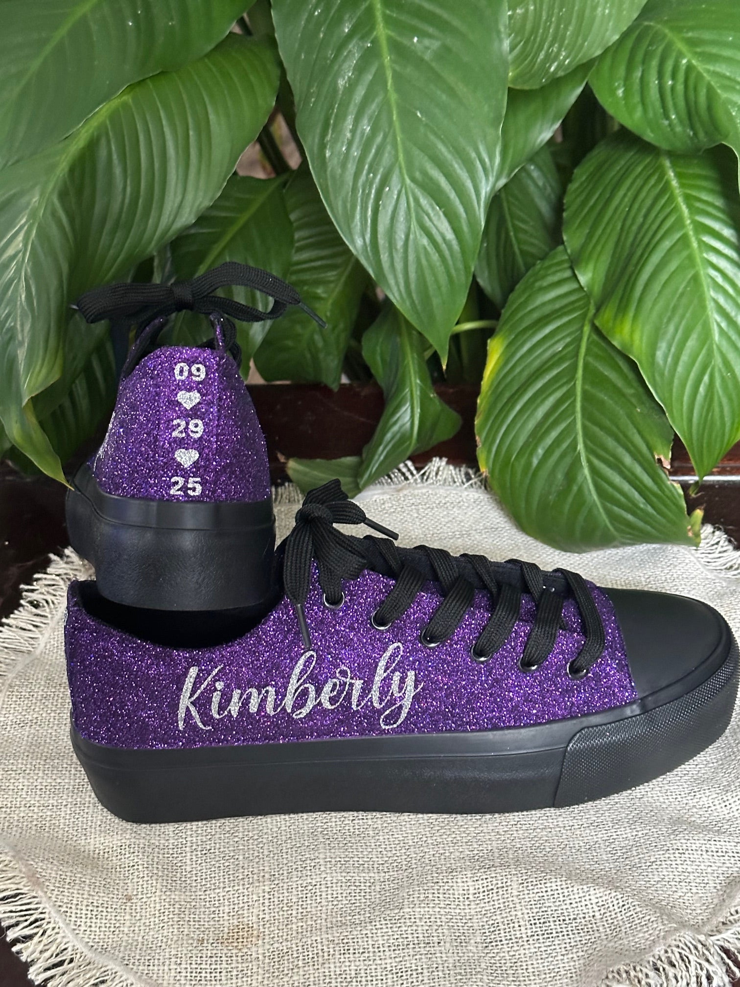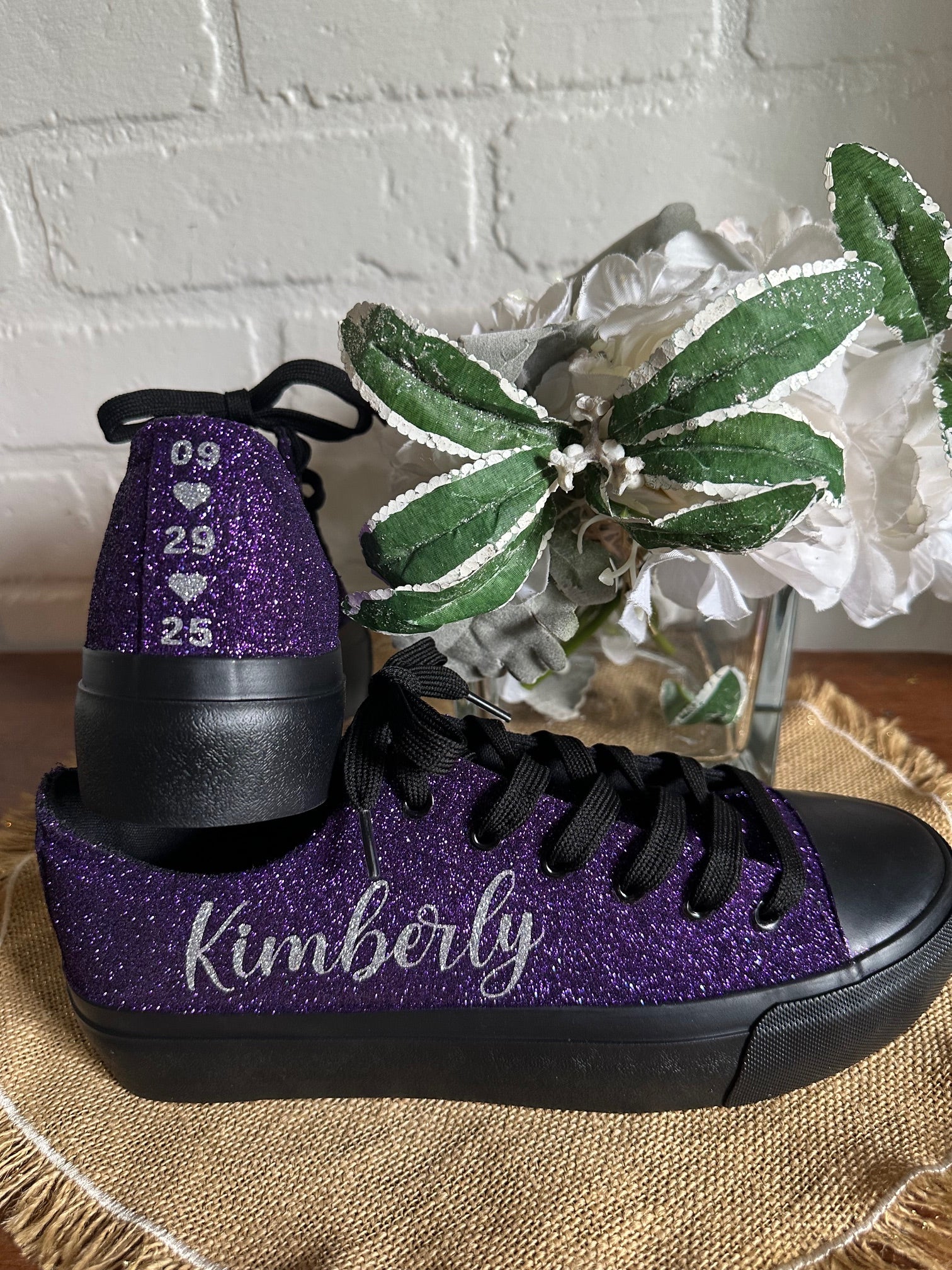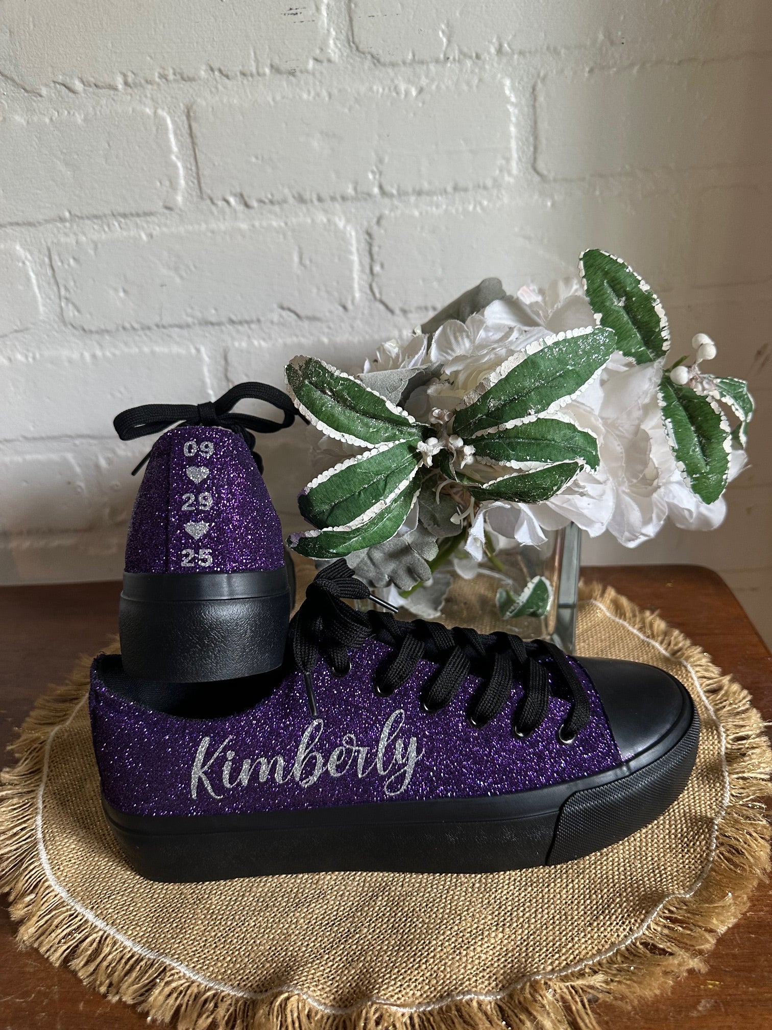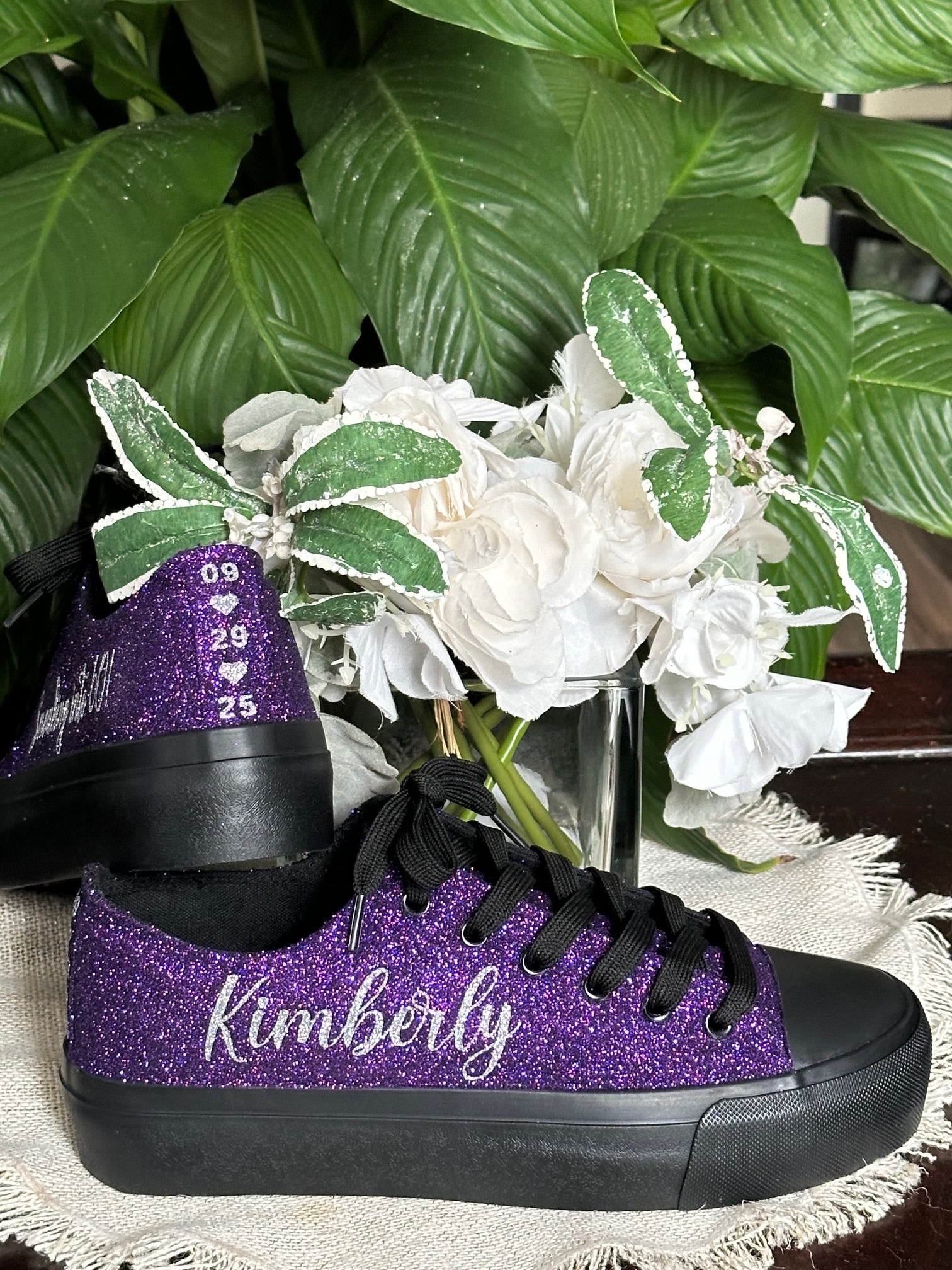 Hand Glittered unbranded canvas sneakers glittered in a gorgeous plum purple on a black sneaker base. Black sole, black laces. Made to order and several other glitter color options are available.