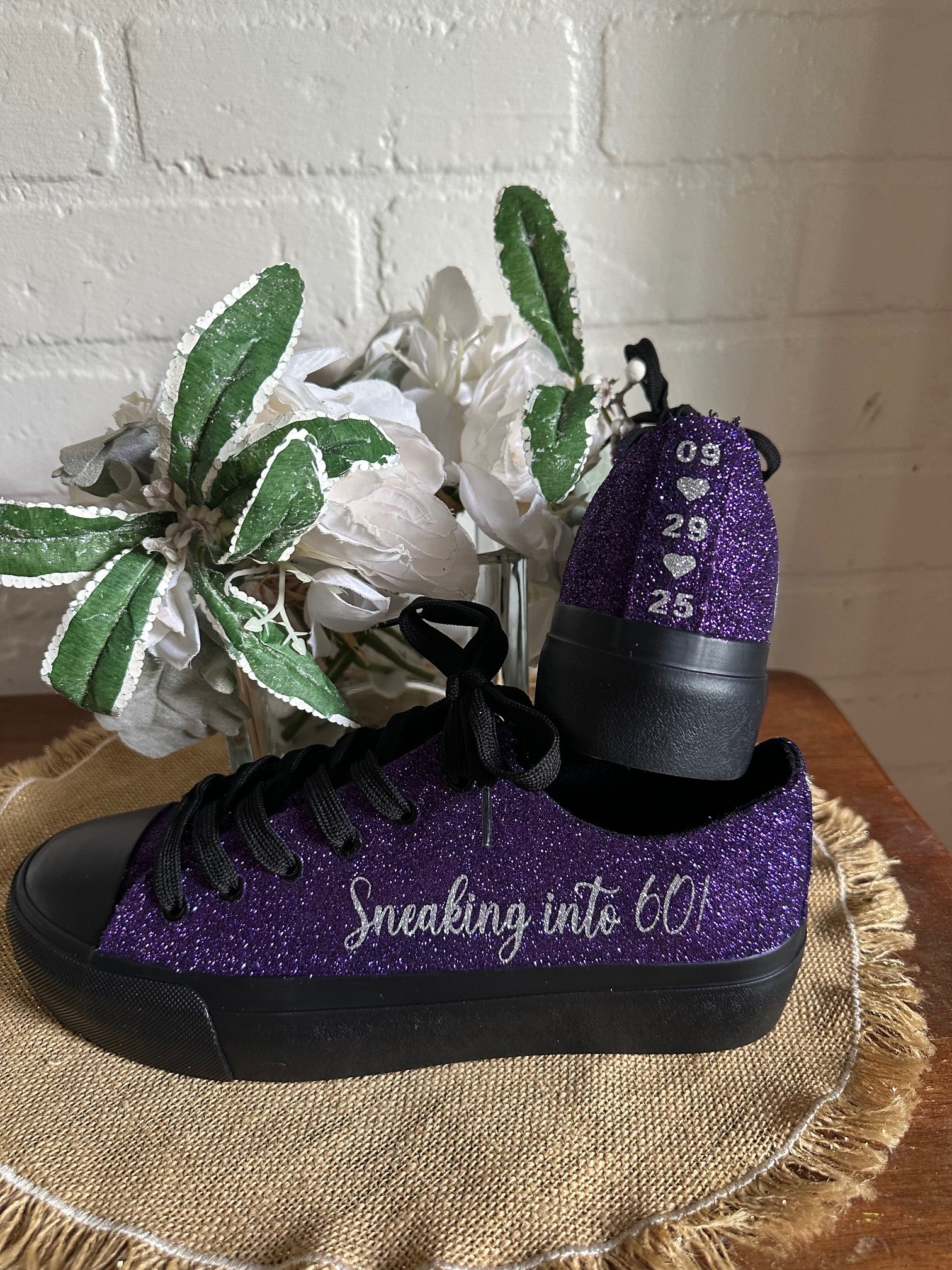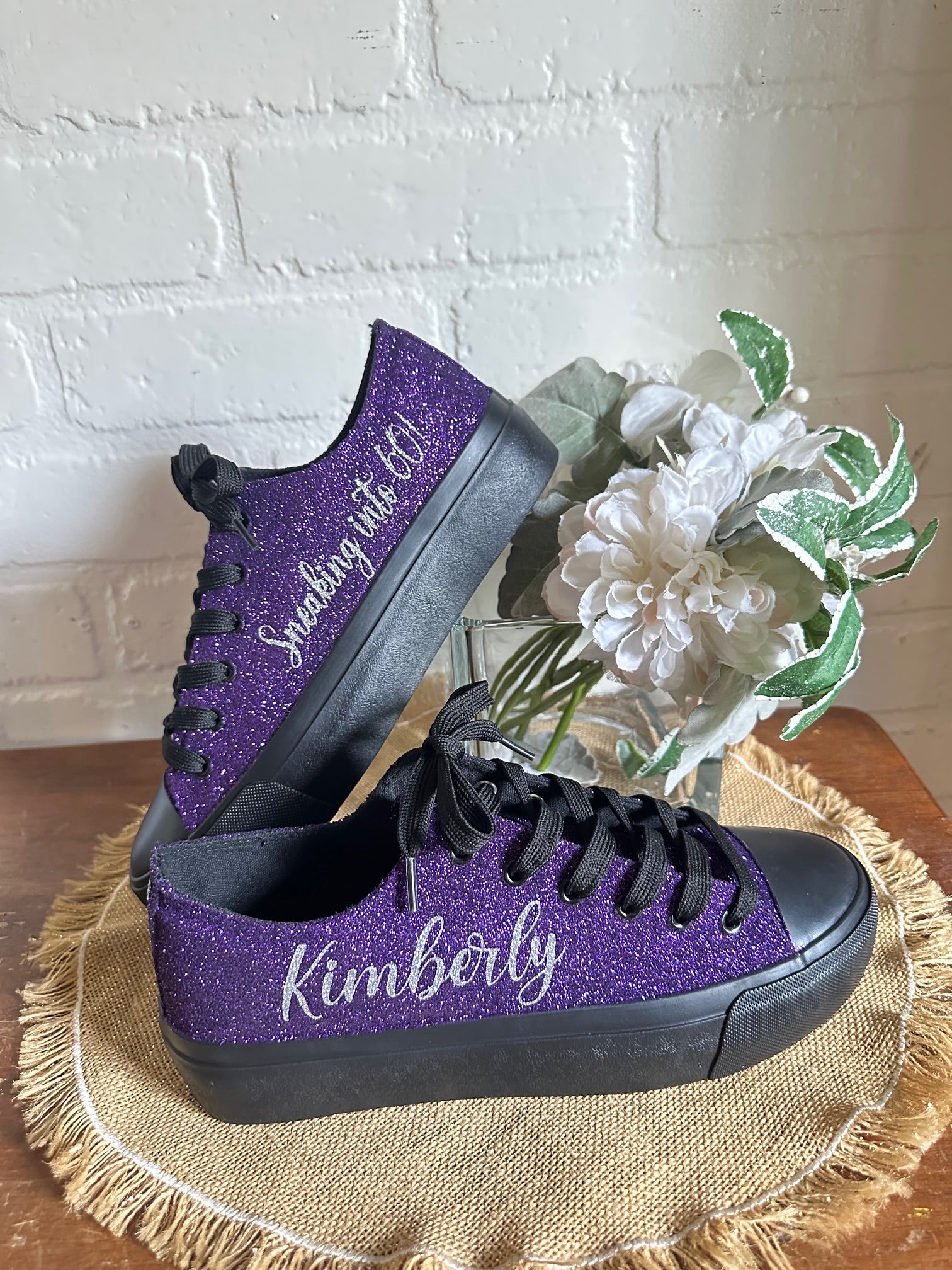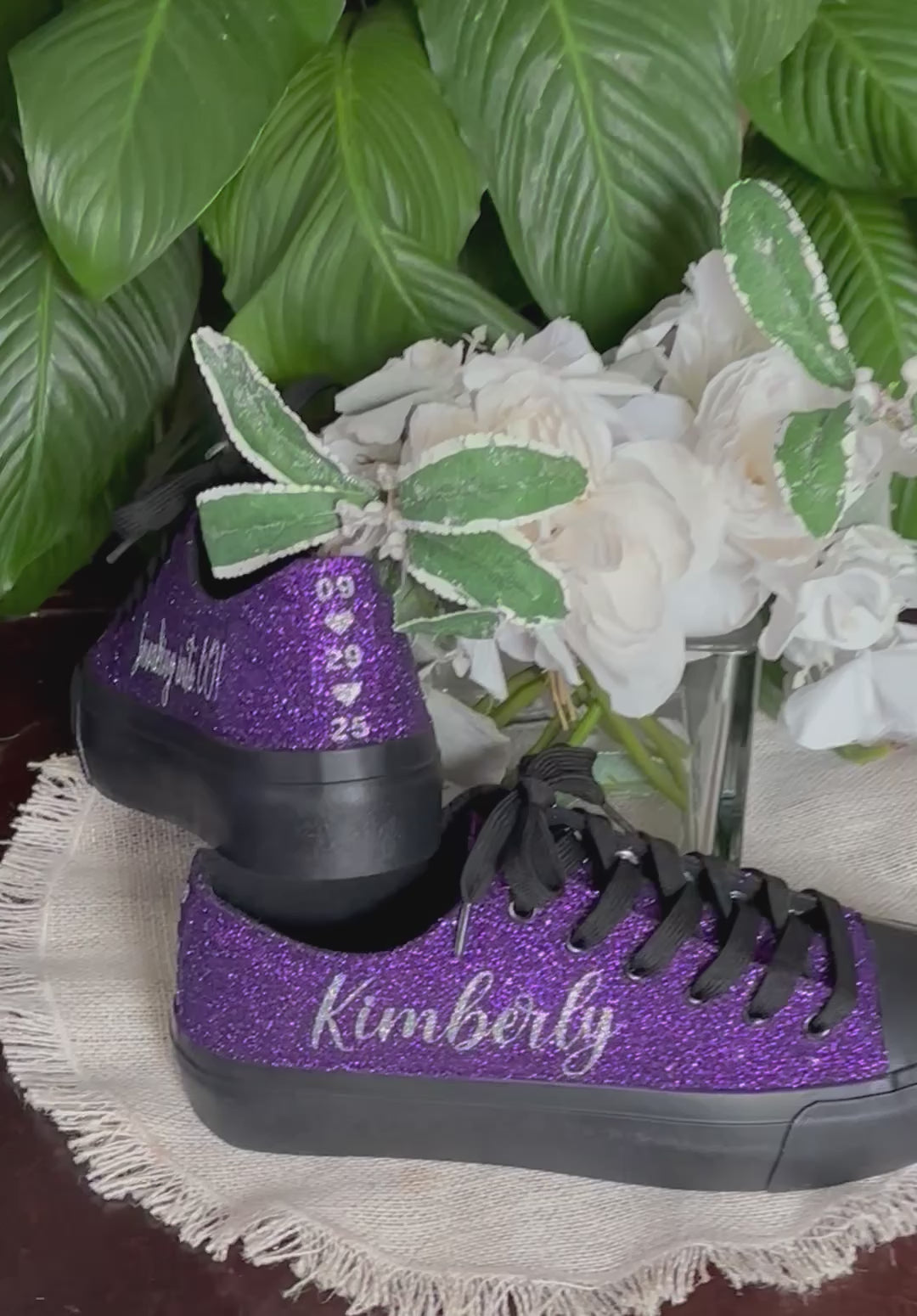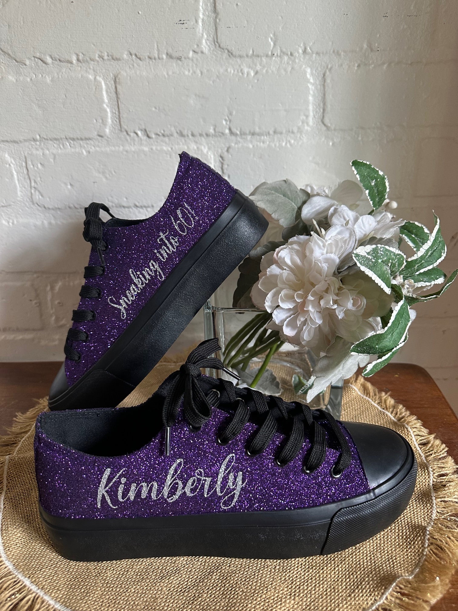 Hand Glittered unbranded canvas sneakers glittered in a gorgeous plum purple on a black sneaker base. Black sole, black laces. Made to order and several other glitter color options are available.