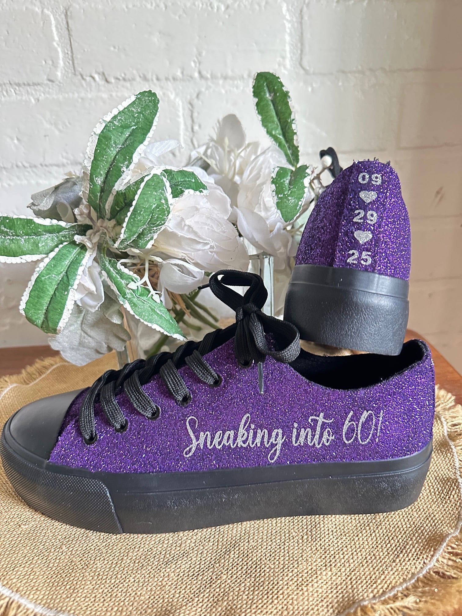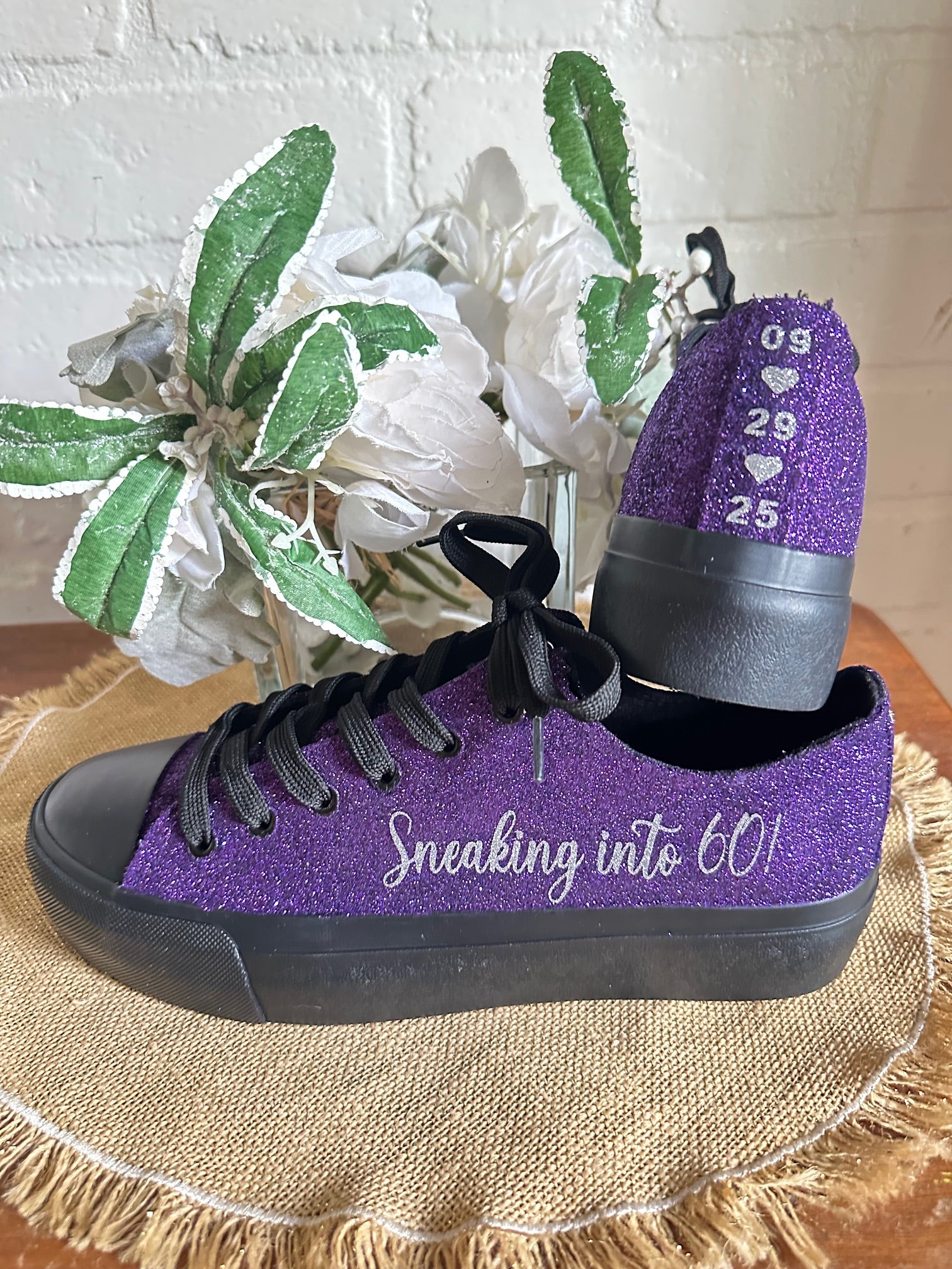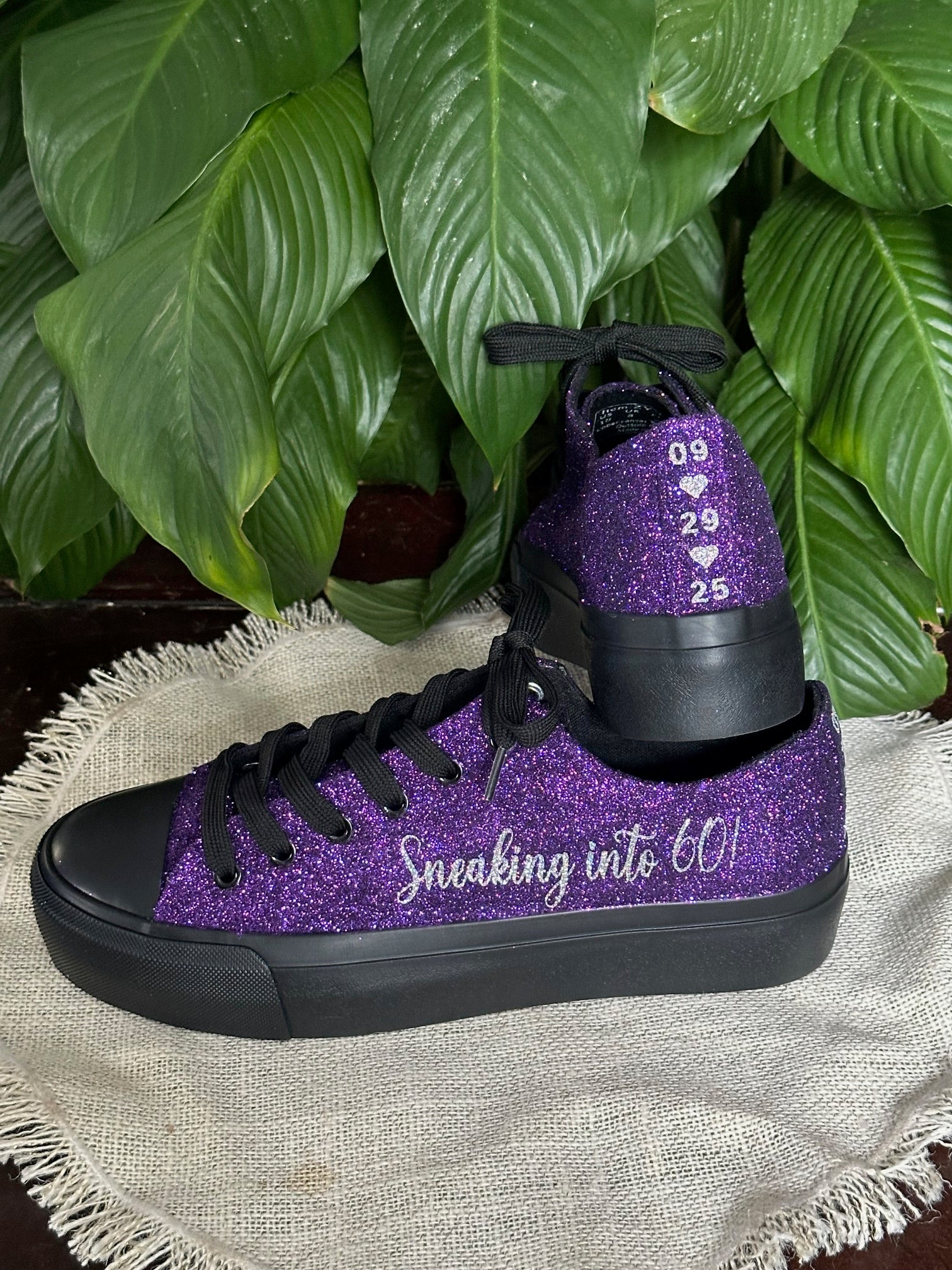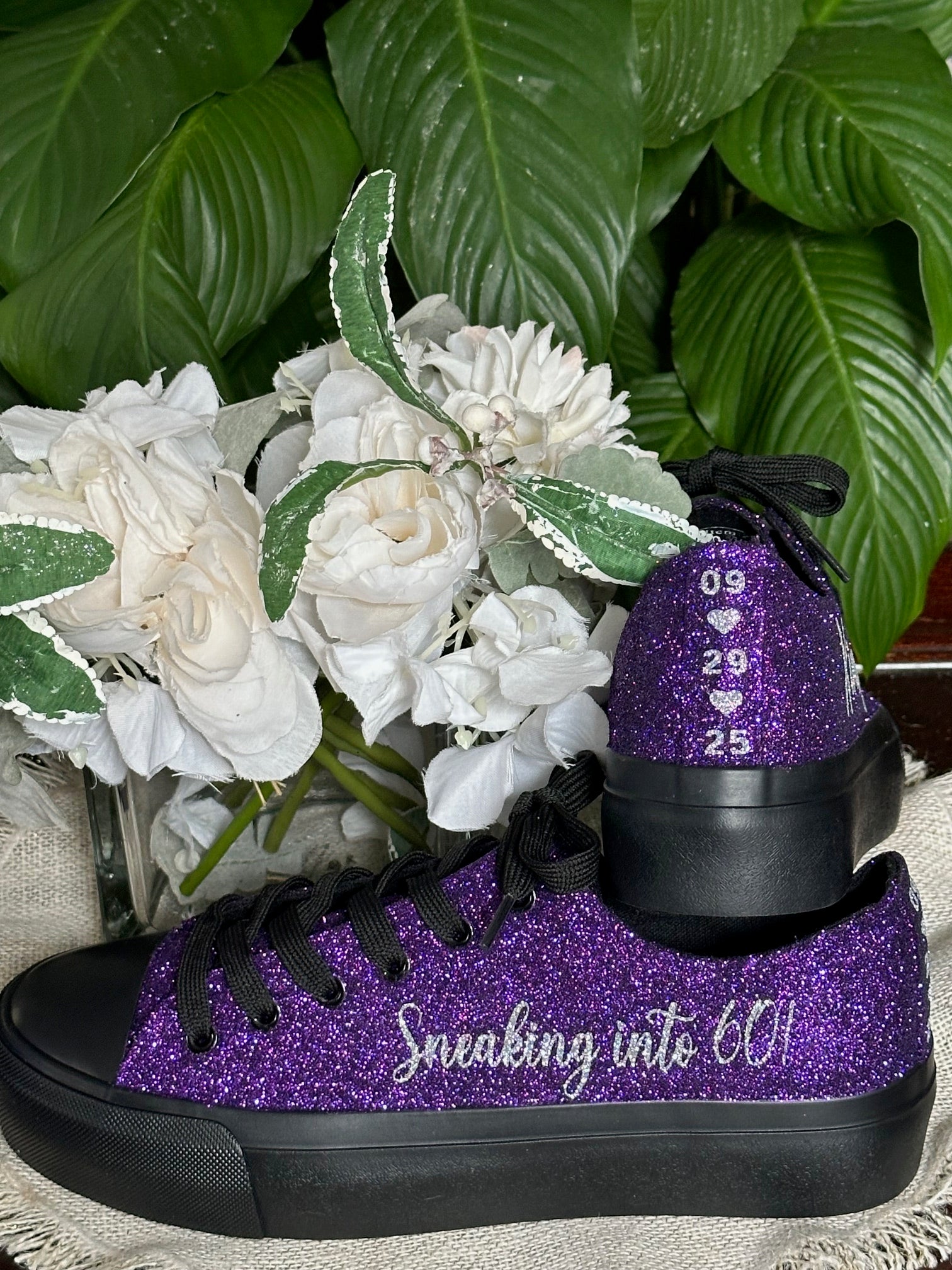 Hand Glittered unbranded canvas sneakers glittered in a gorgeous plum purple on a black sneaker base. Black sole, black laces. Made to order and several other glitter color options are available.