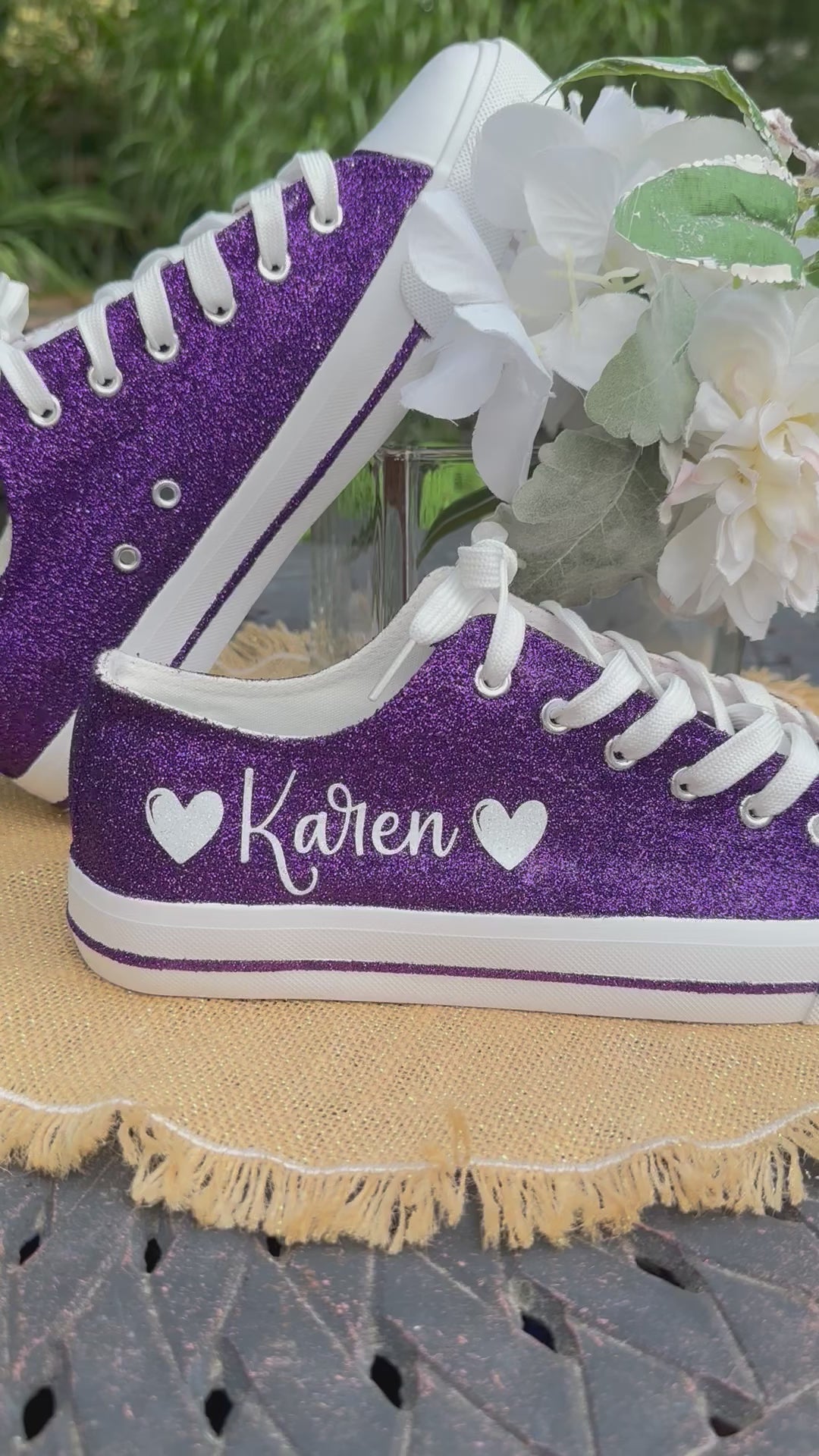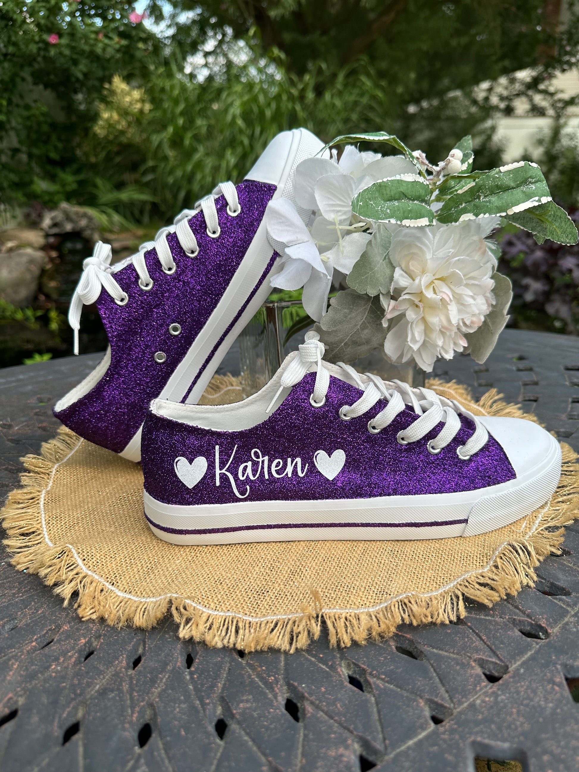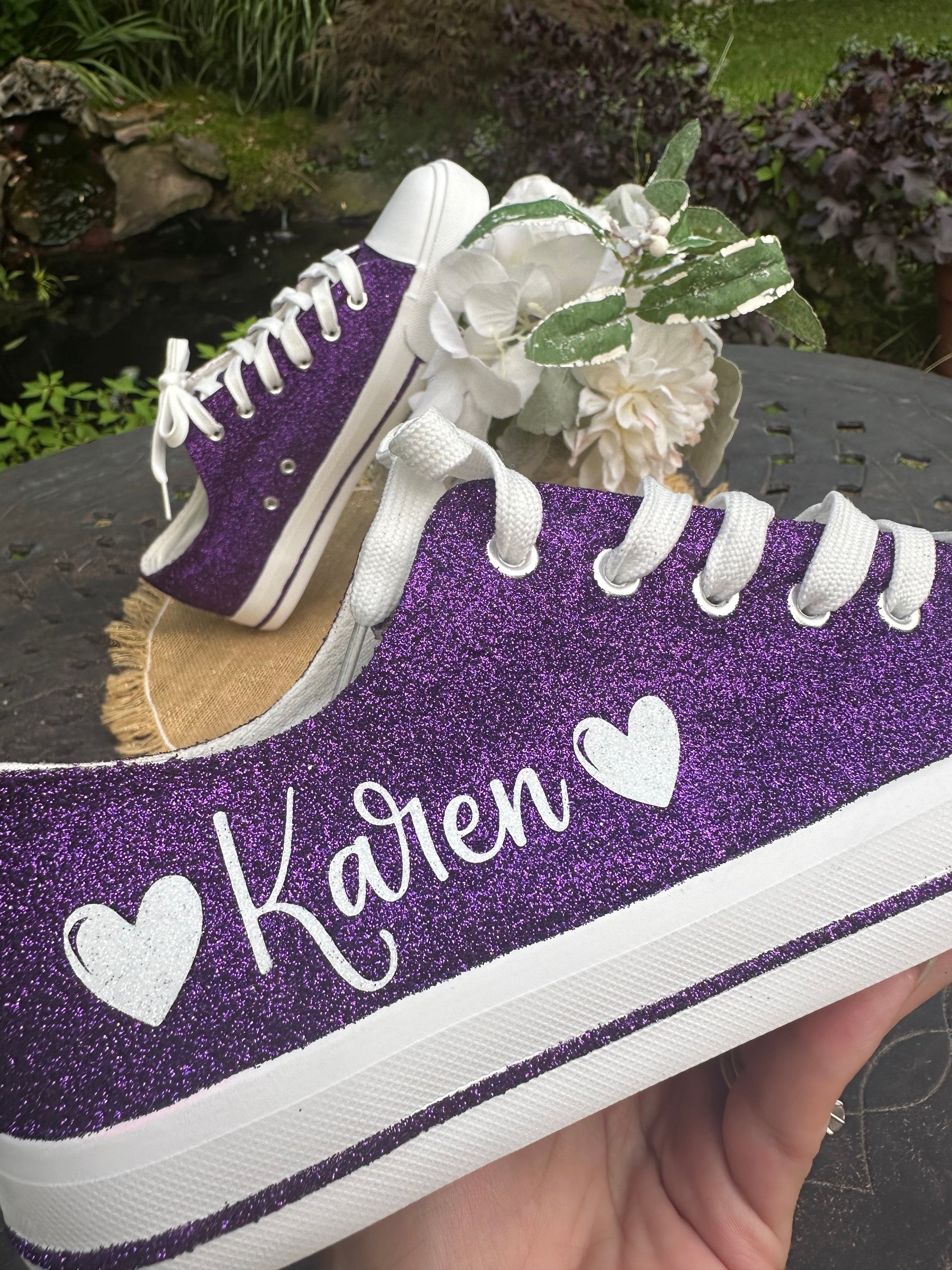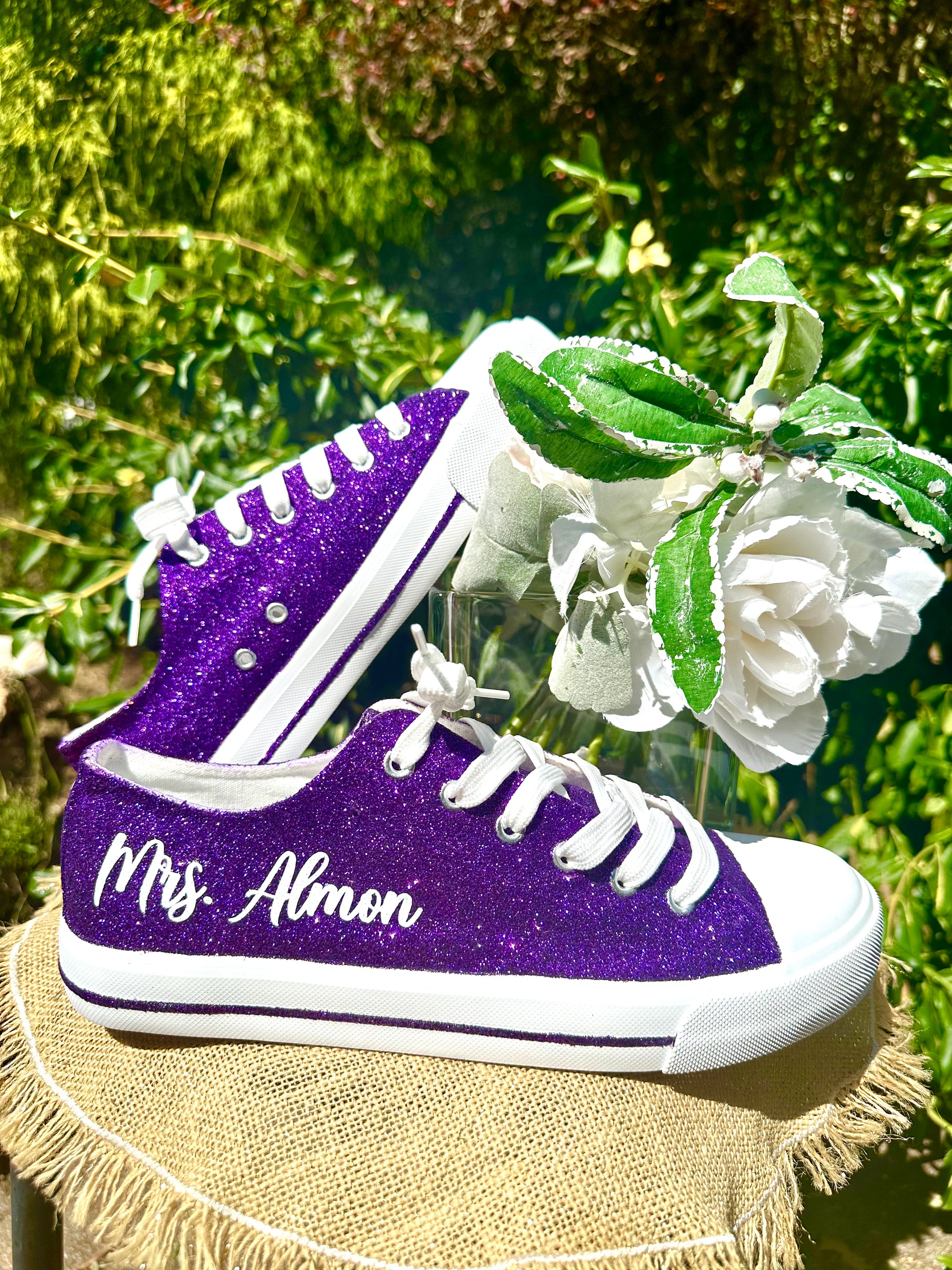Hand Glittered unbranded canvas sneakers glittered in a gorgeous plum purple personalized just for you. Made to order.