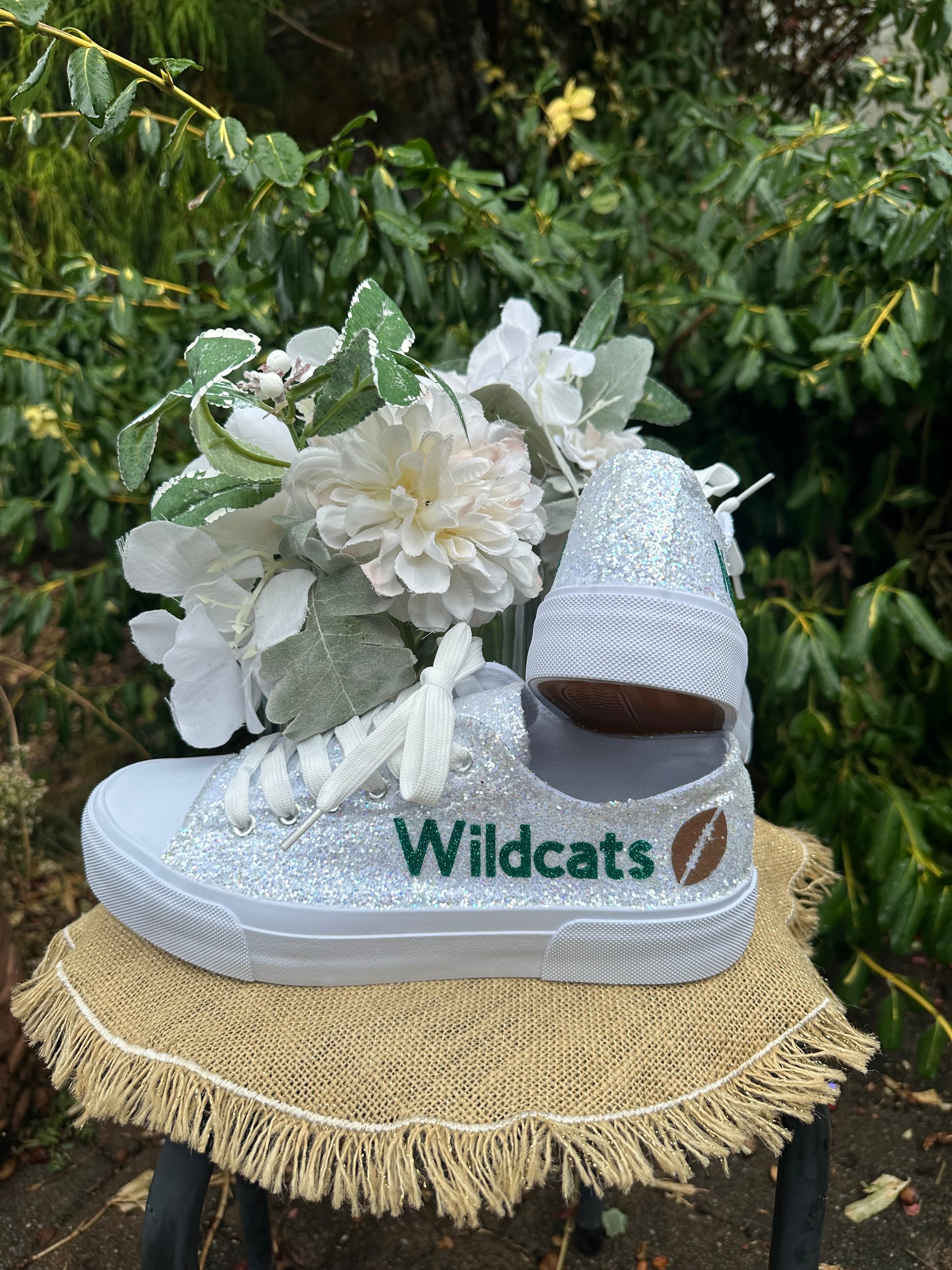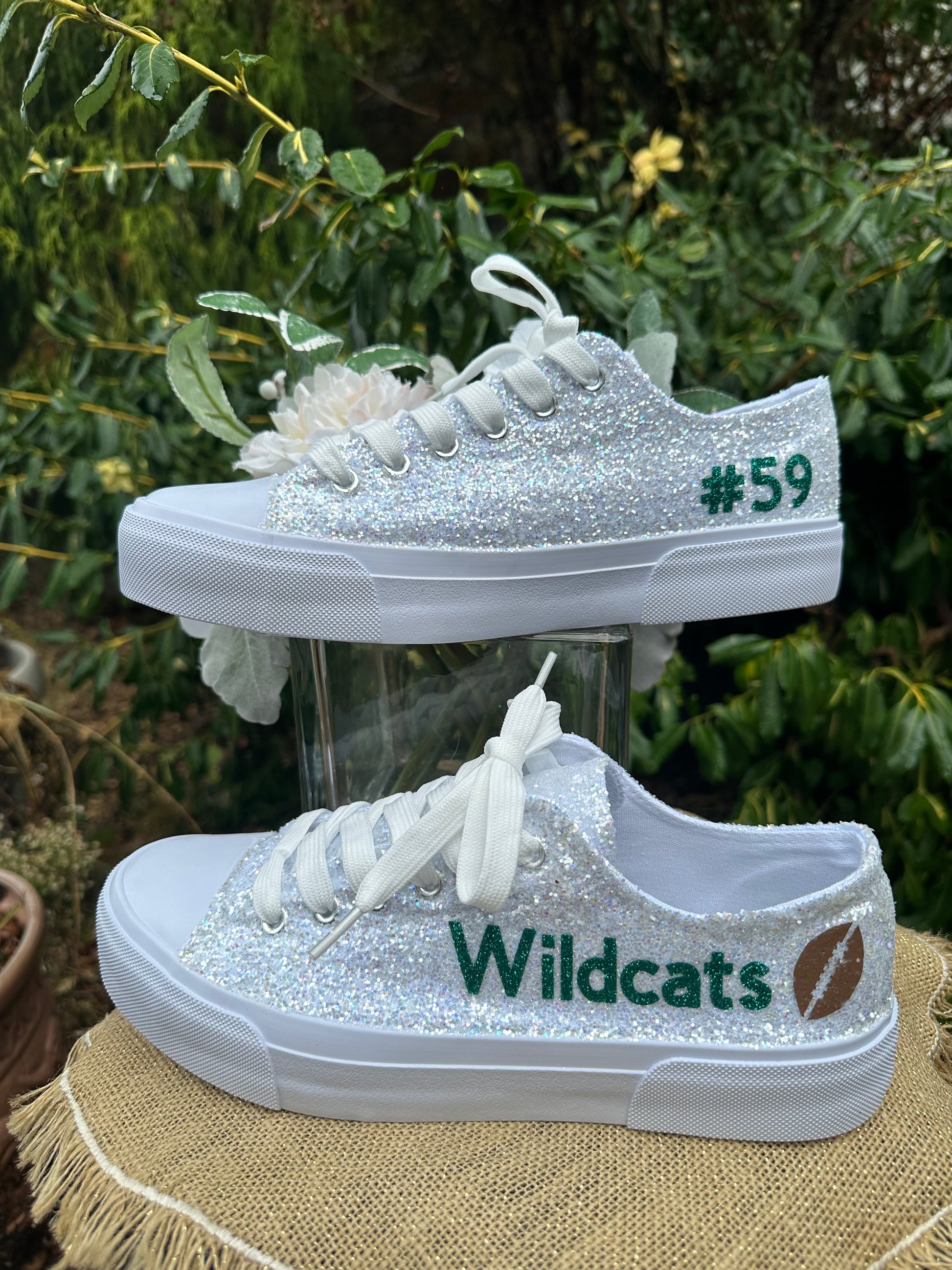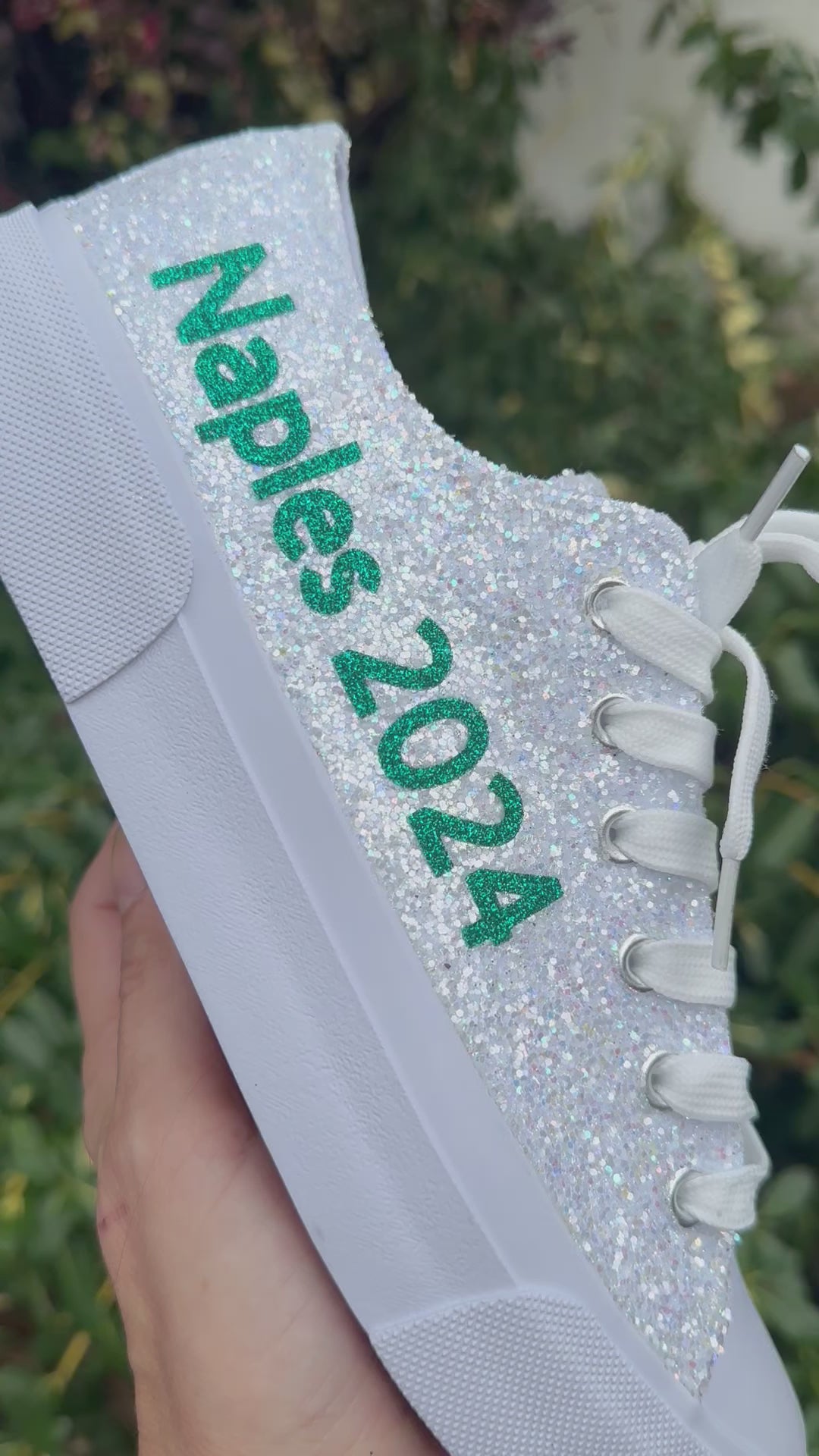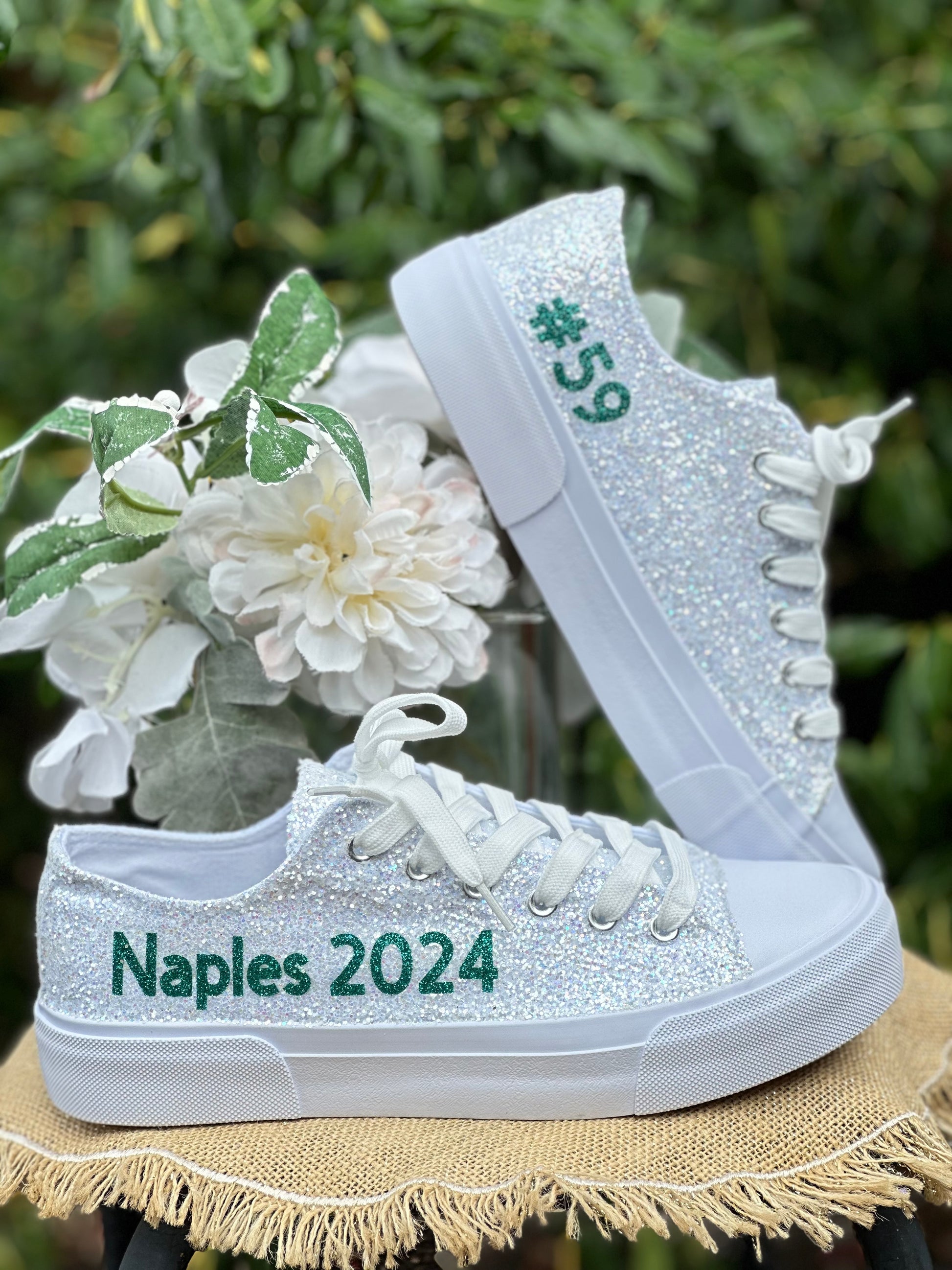 Personalization is added in emerald green glitter to include name on the outside of each sneaker and date down the back as shown. Please include custom info in the order notes. Should you desire different placement or color options, please send us a message.