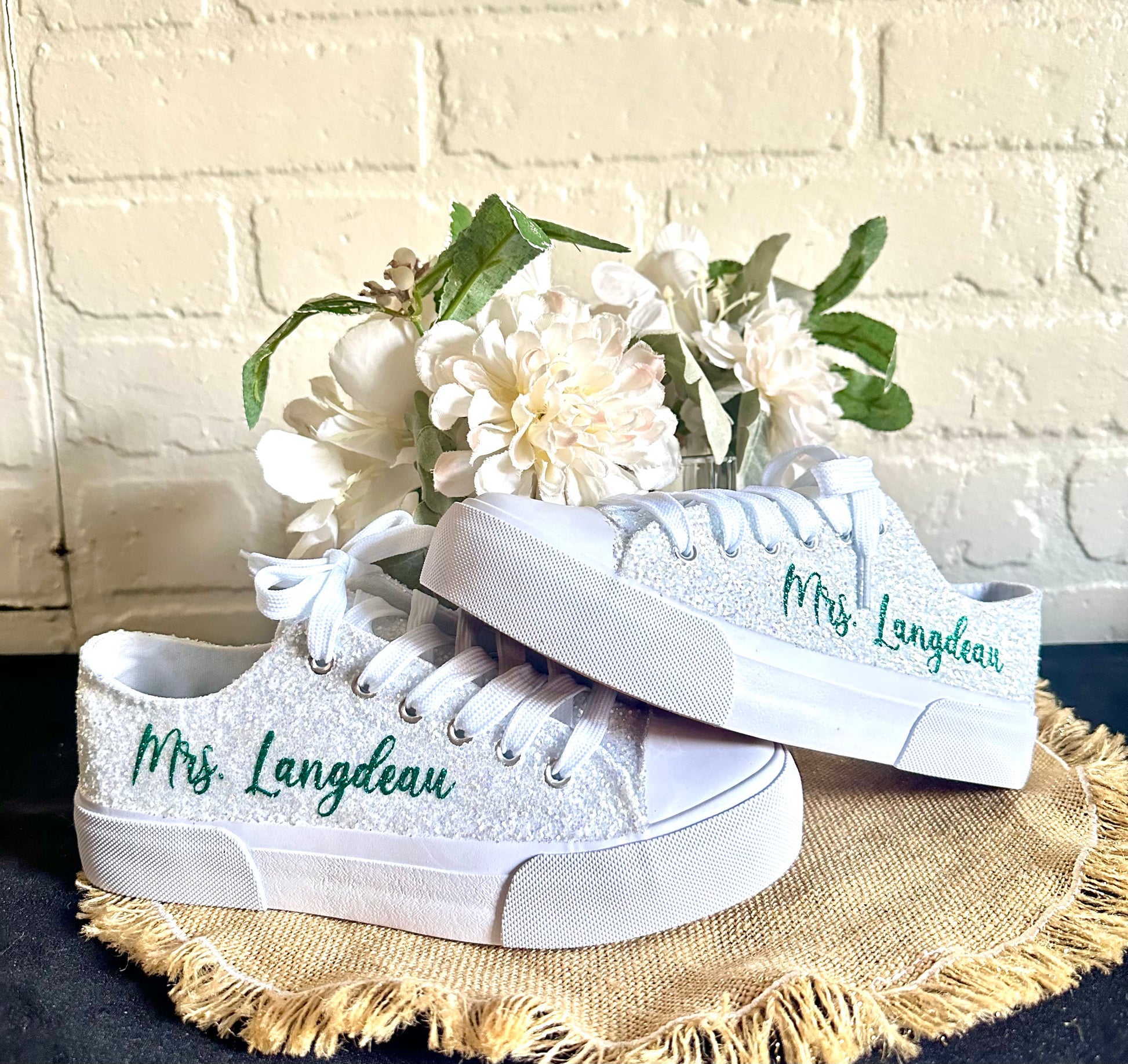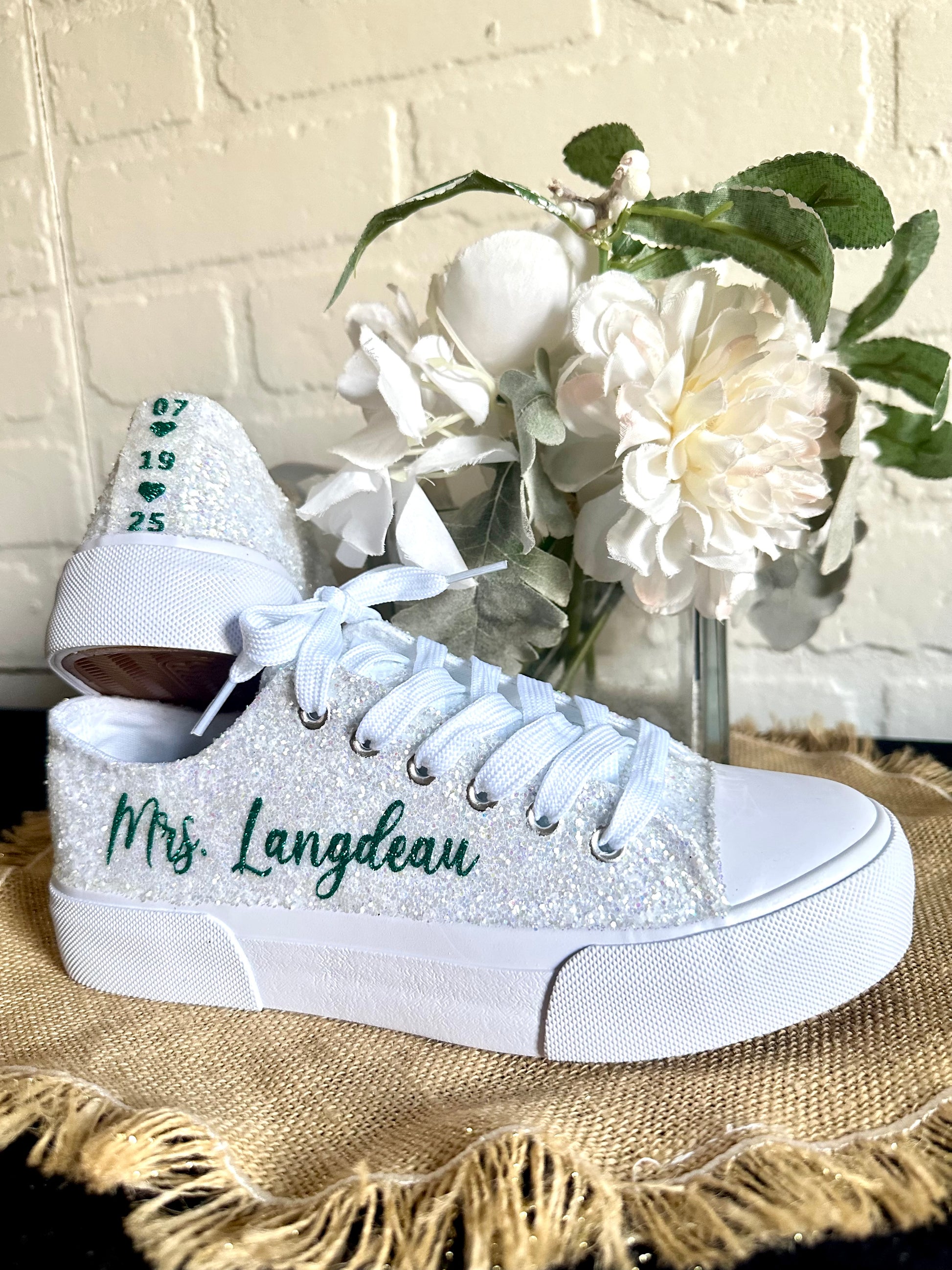 Personalized White Glitter Bride Sneakers with Emerald Green Writing