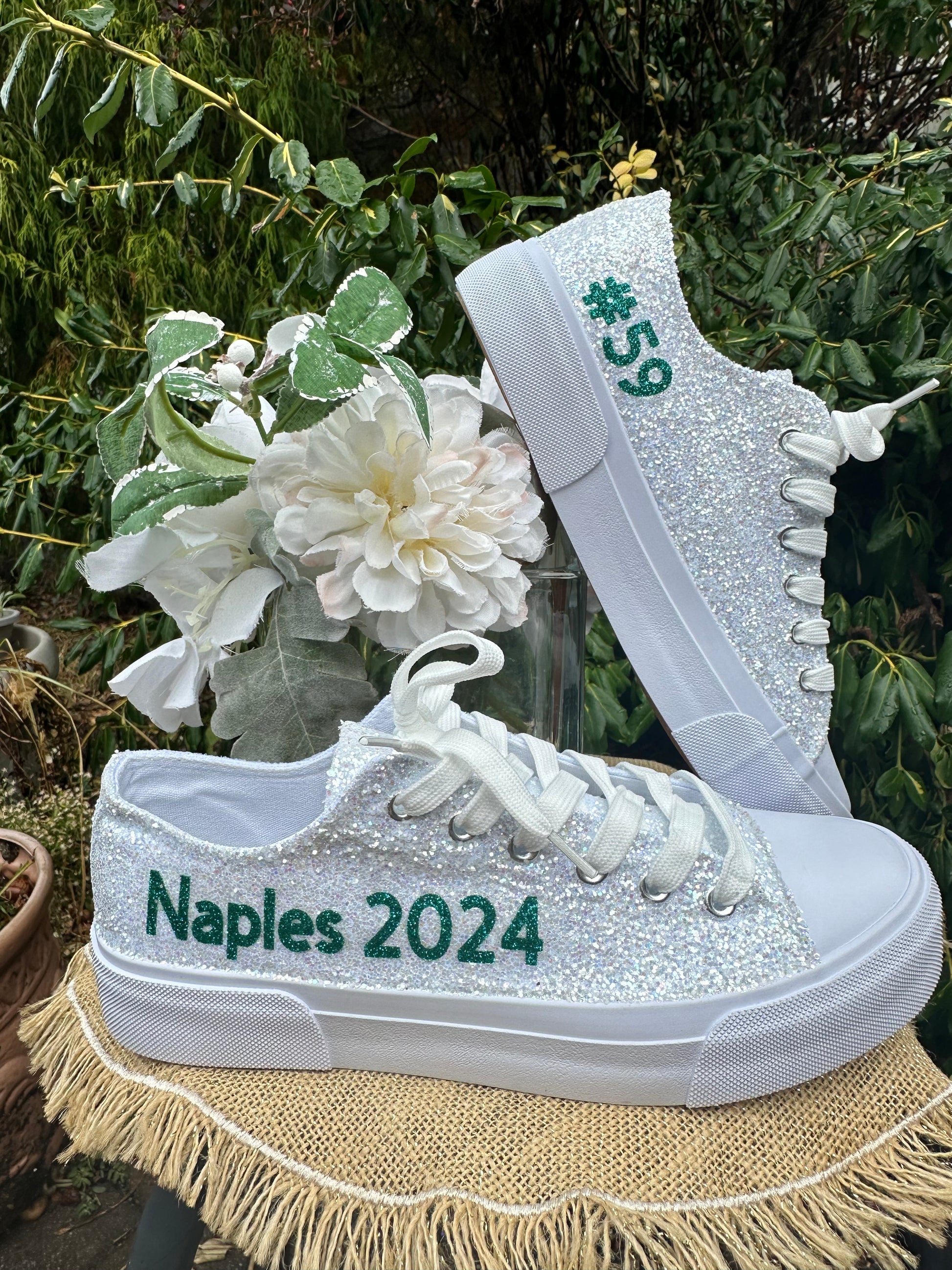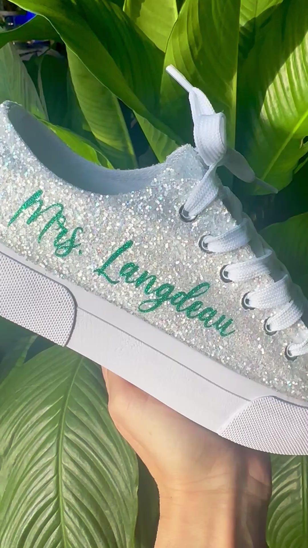 Hand Glittered unbranded canvas sneakers glittered in a gorgeous chunky white mix called *bungalow* with emerald green glitter personalization of your choice. Made to order.