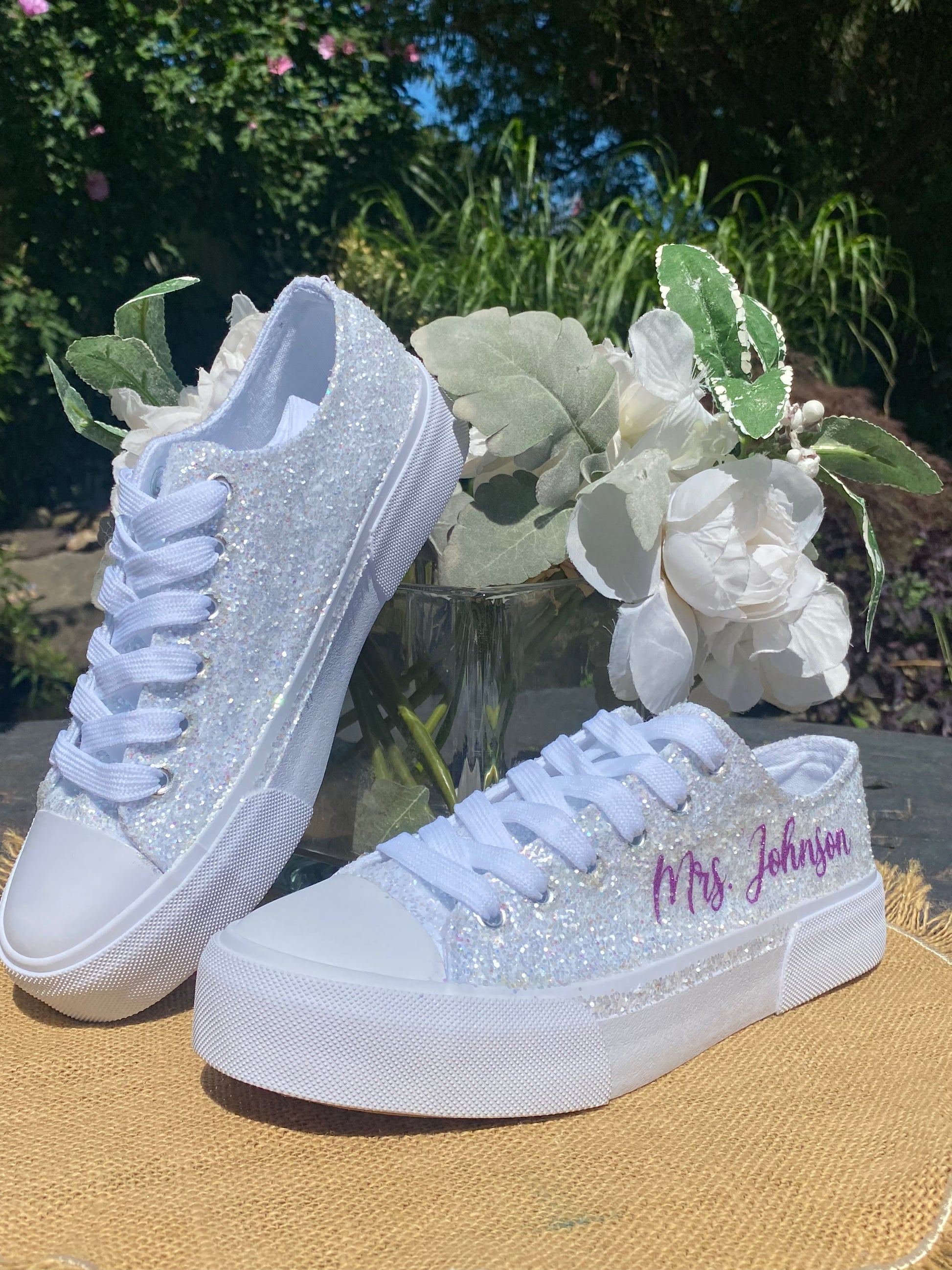 Personalized White Glitter Bride Sneakers with Purple Writing