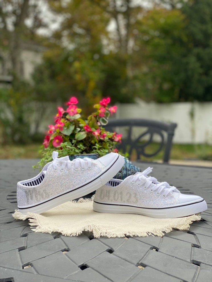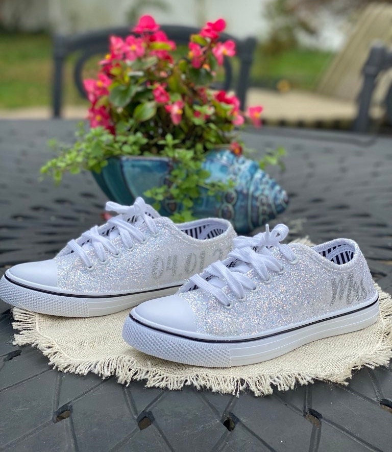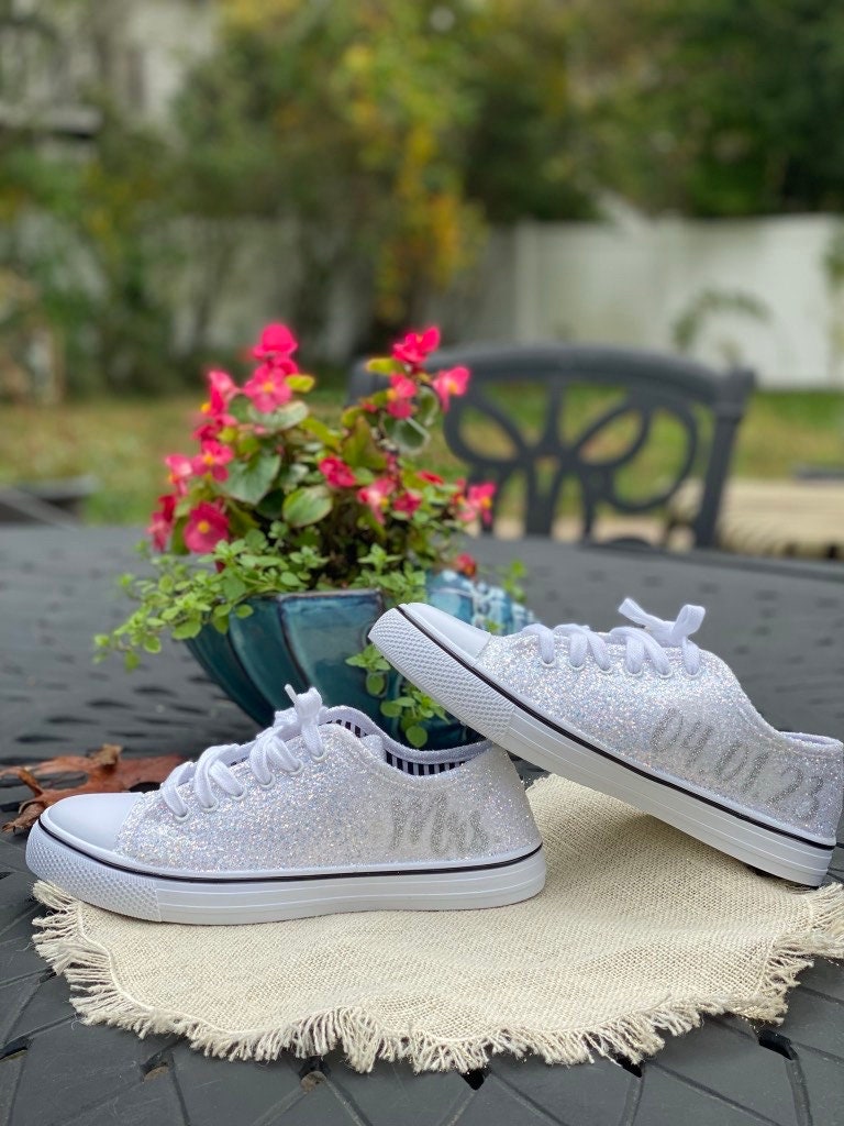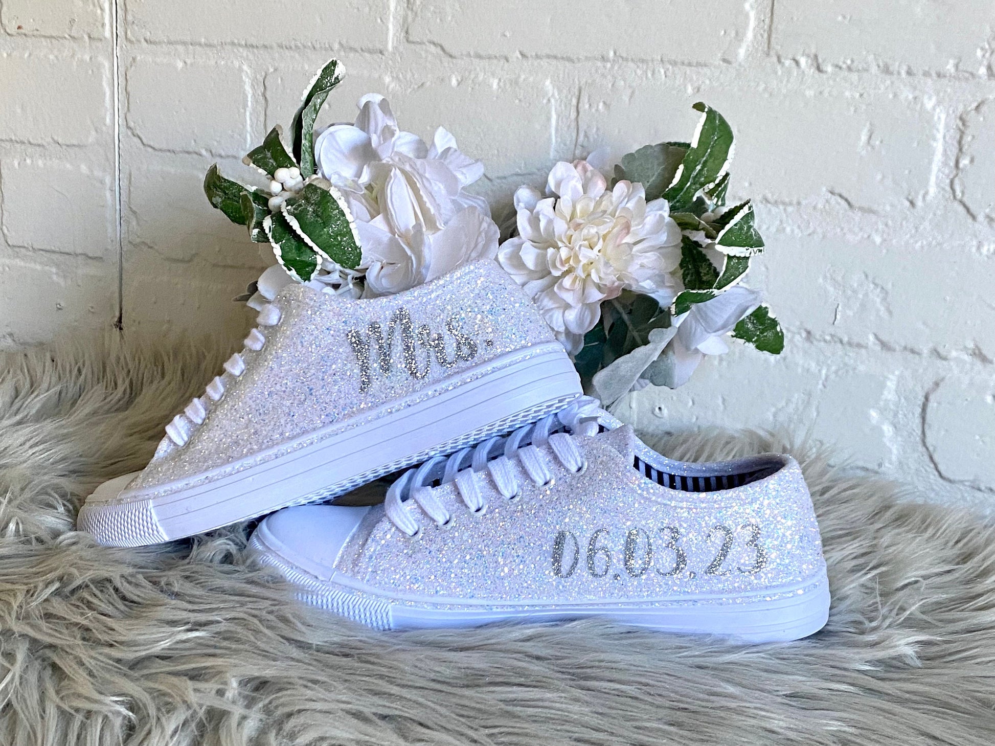 Hand Glittered unbranded canvas sneakers glittered in a gorgeous chunky white mix called *bungalow* with silver glitter personalization "Mrs." with your wedding date unless otherwise specified.