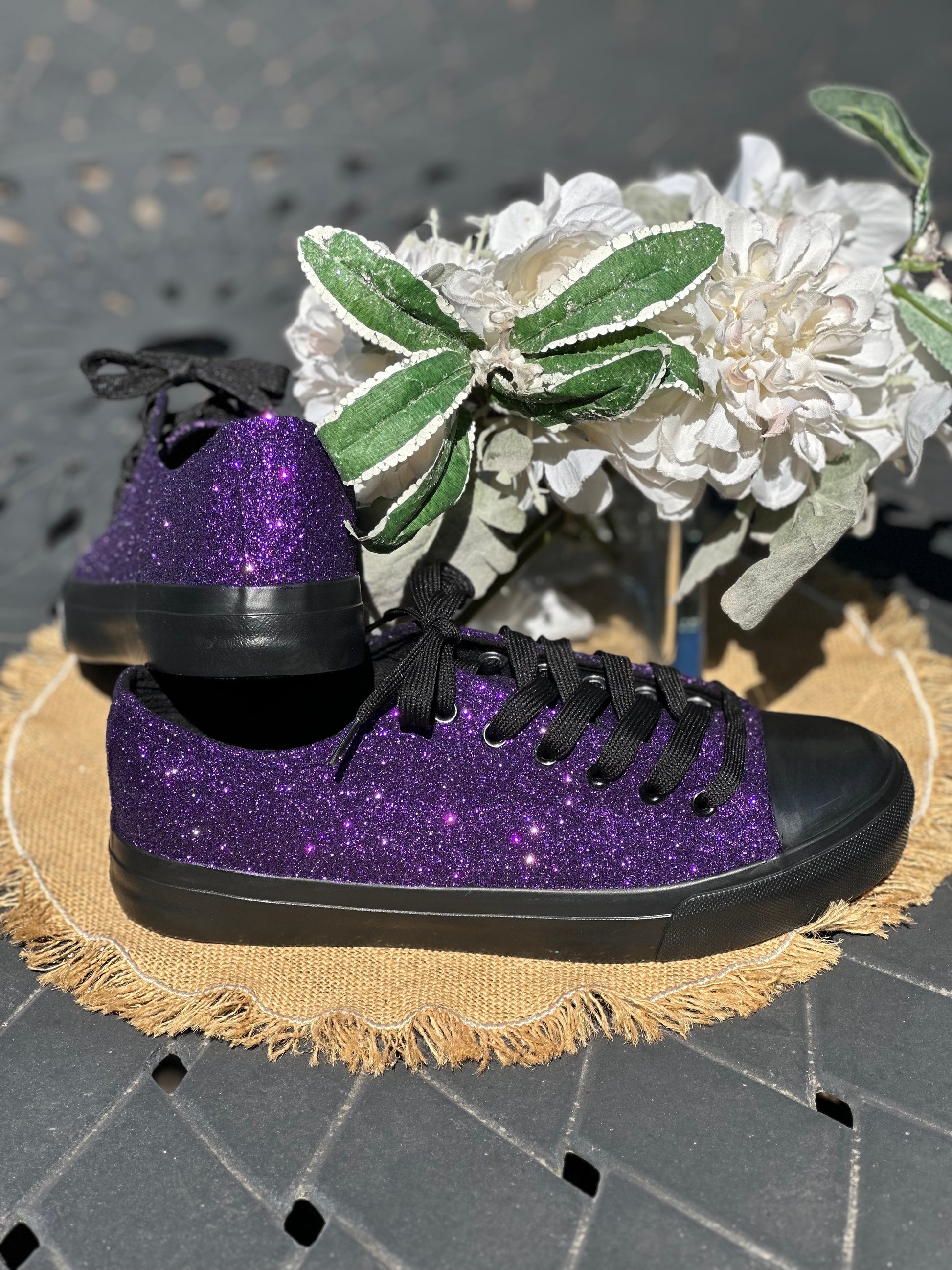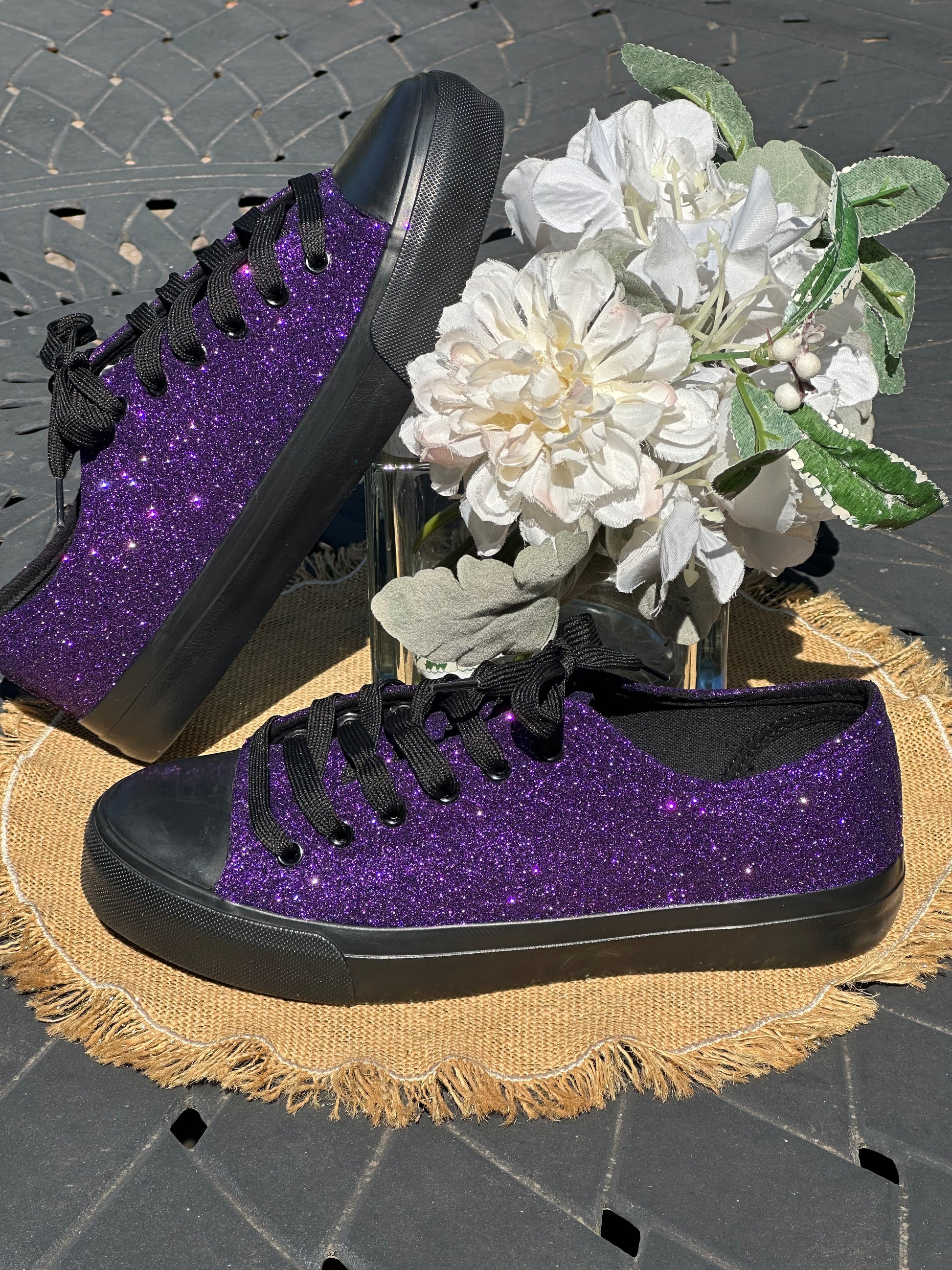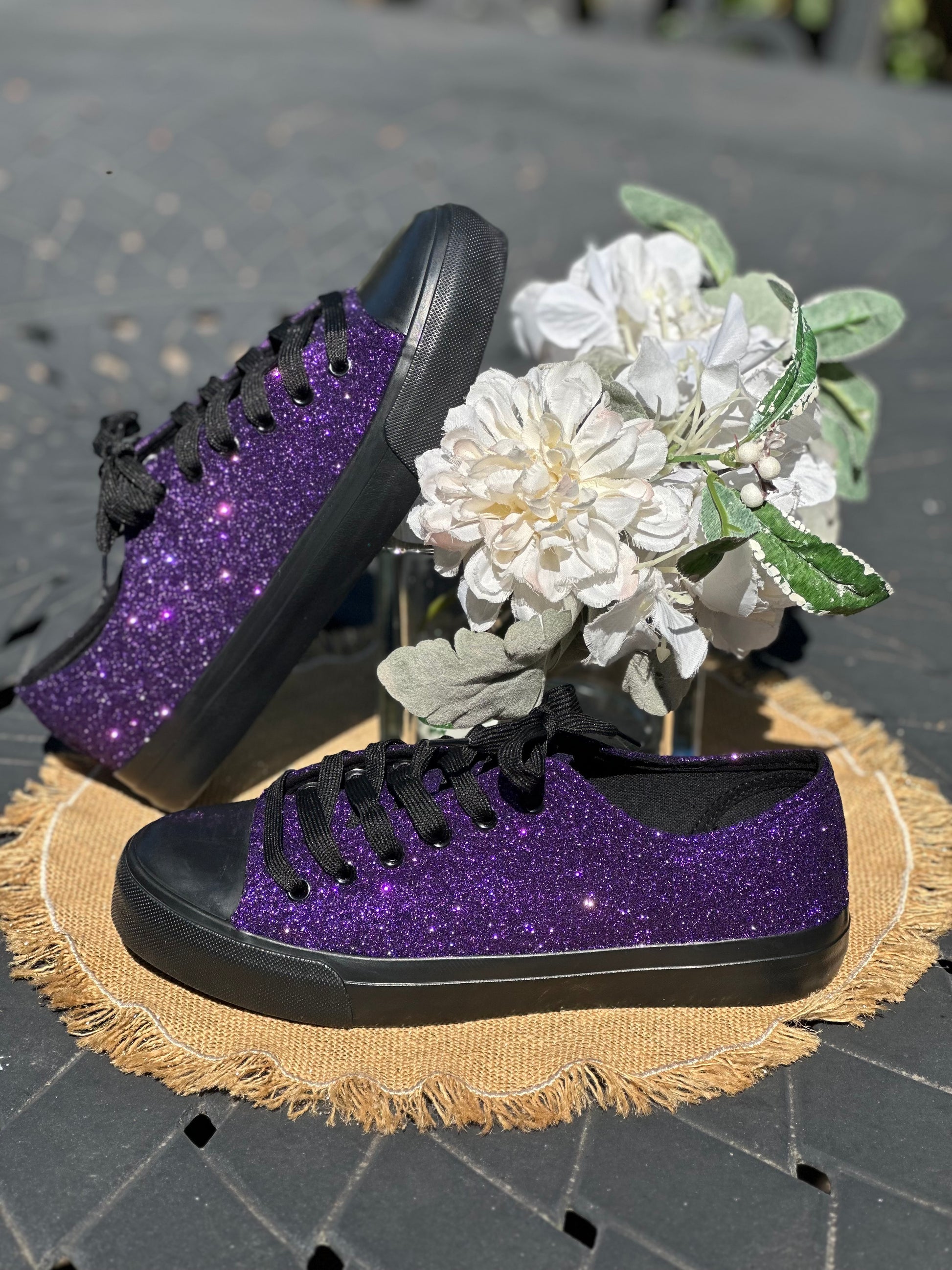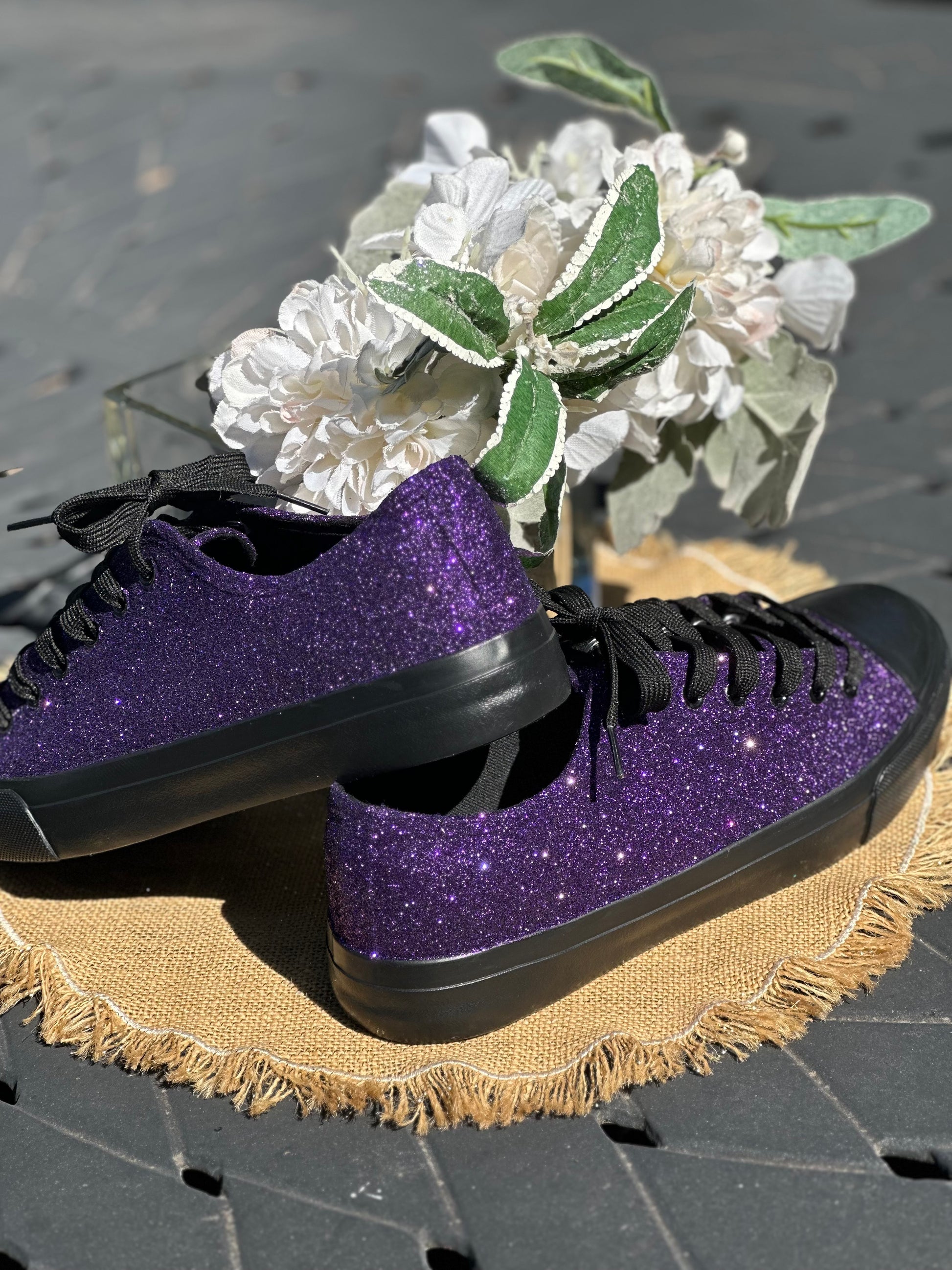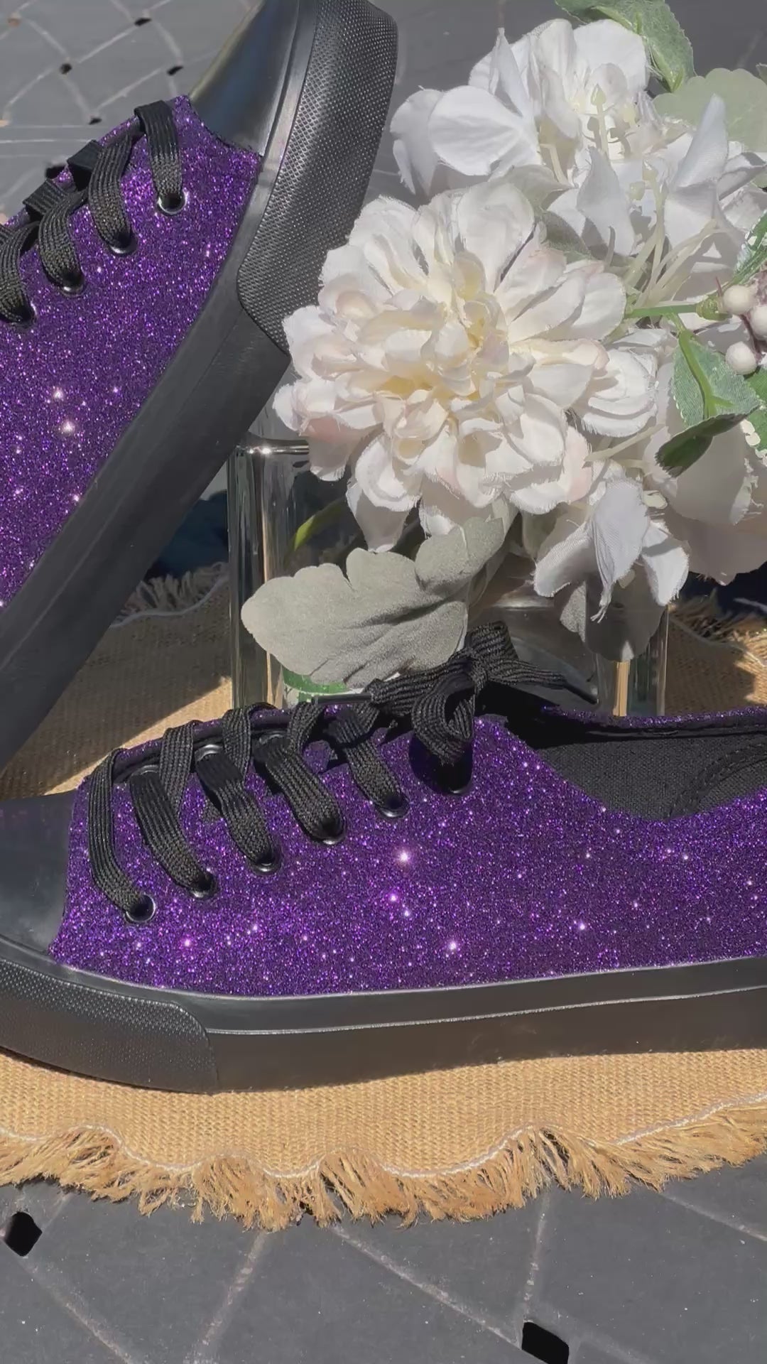 Hand Glittered unbranded canvas sneakers glittered in a gorgeous plum purple on a black sneaker base. Black sole, black laces. Made to order and several other glitter color options are available.