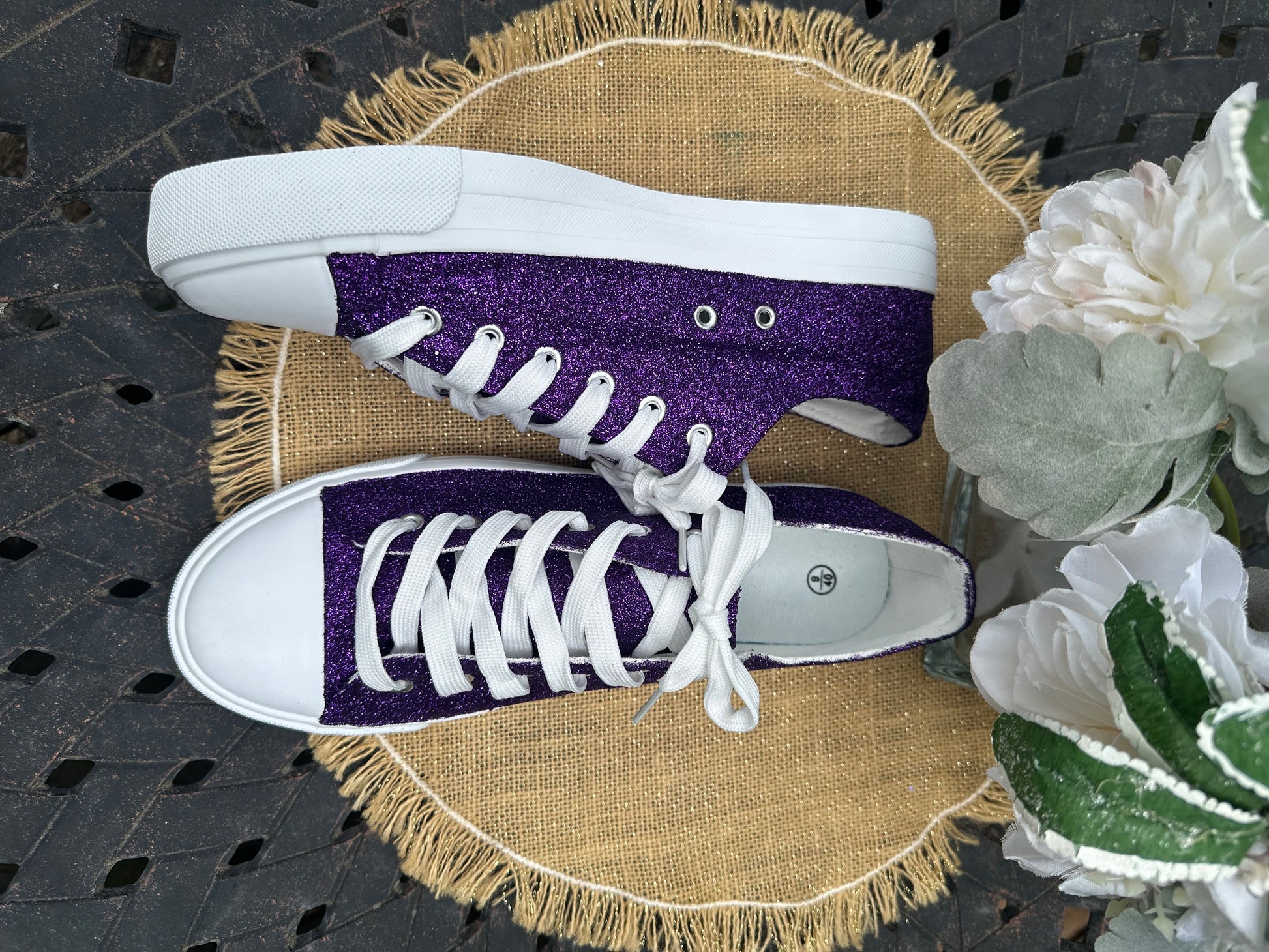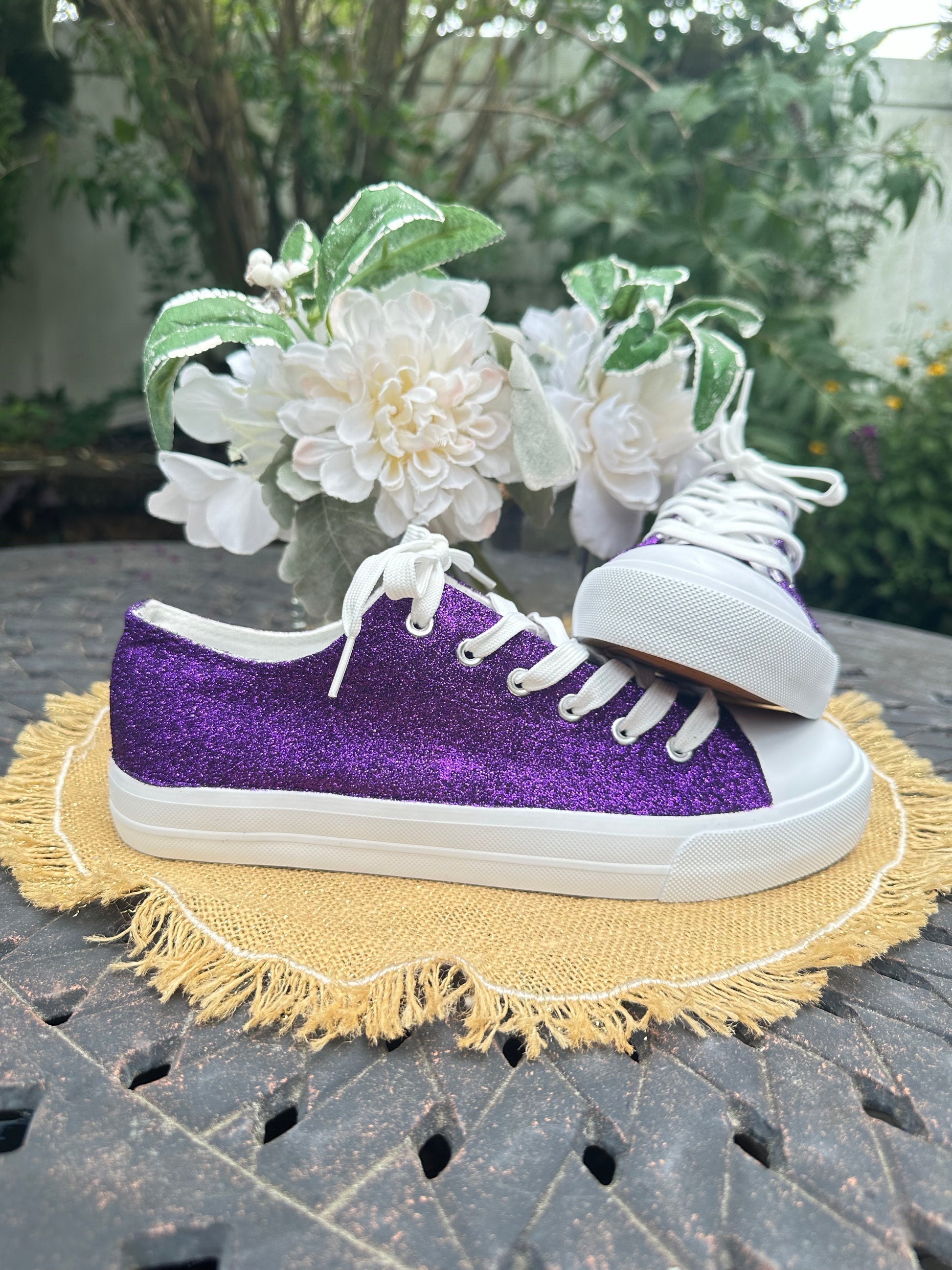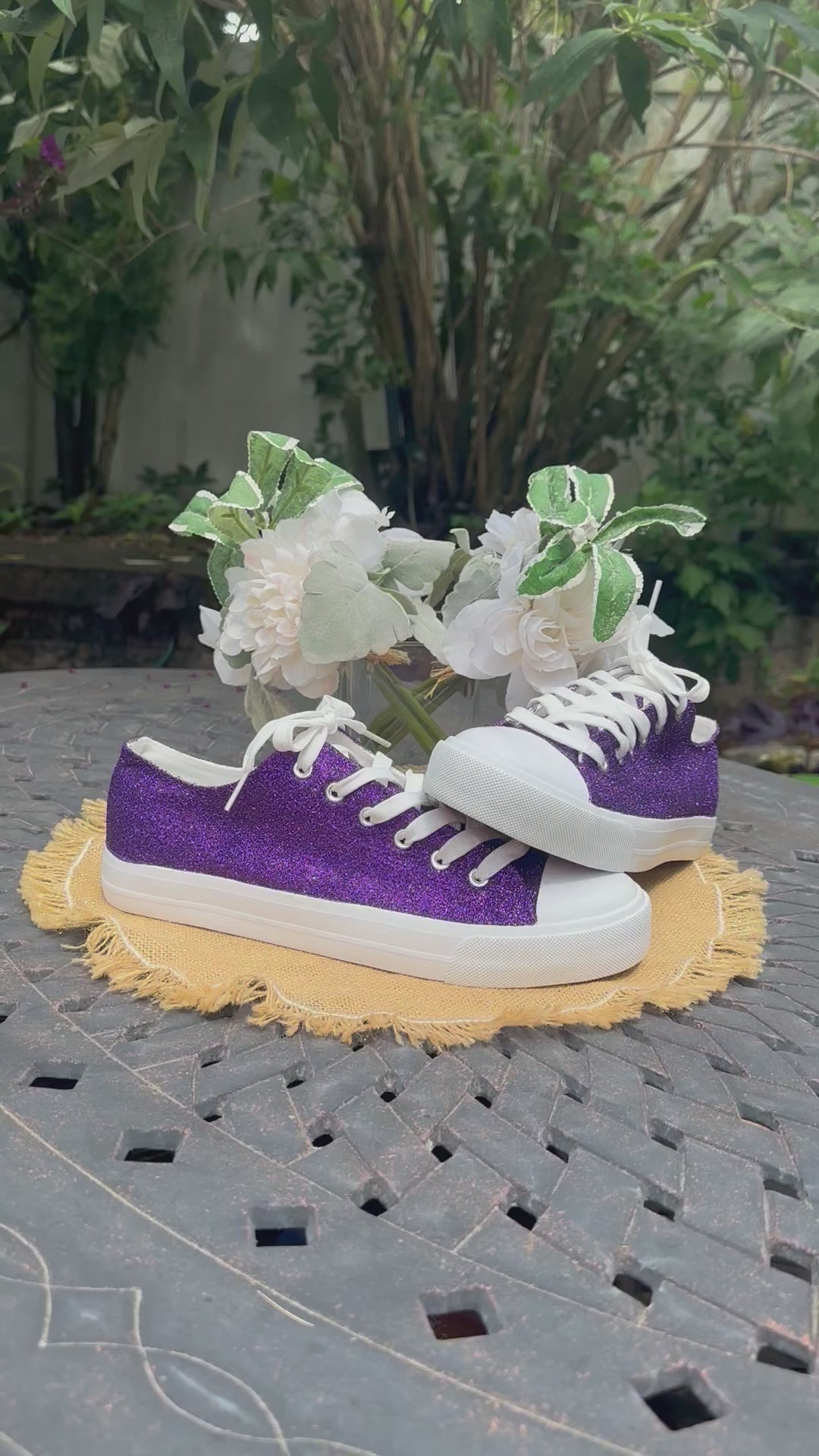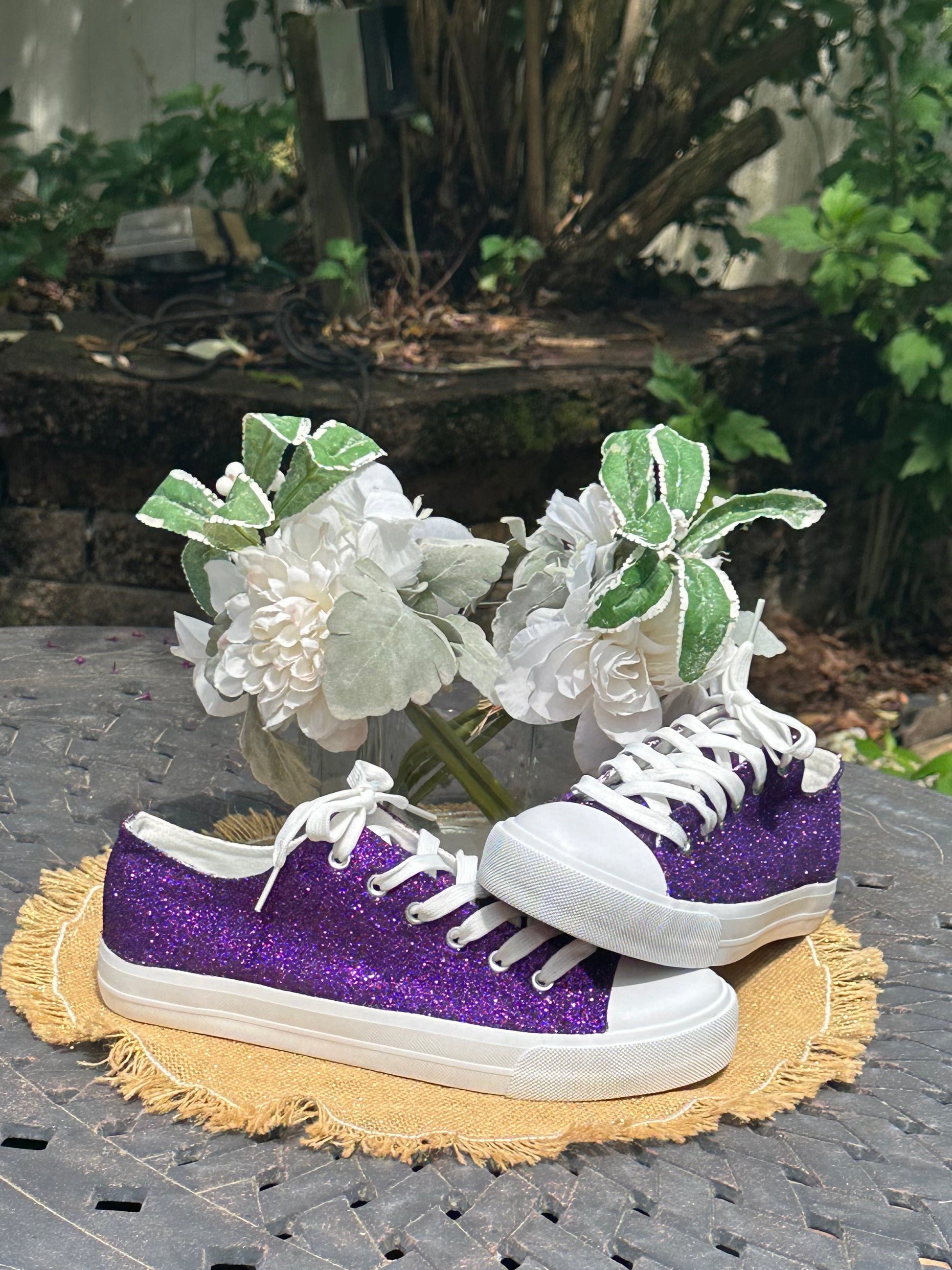 Hand Glittered unbranded canvas sneakers glittered in a gorgeous plum purple. Made to order.