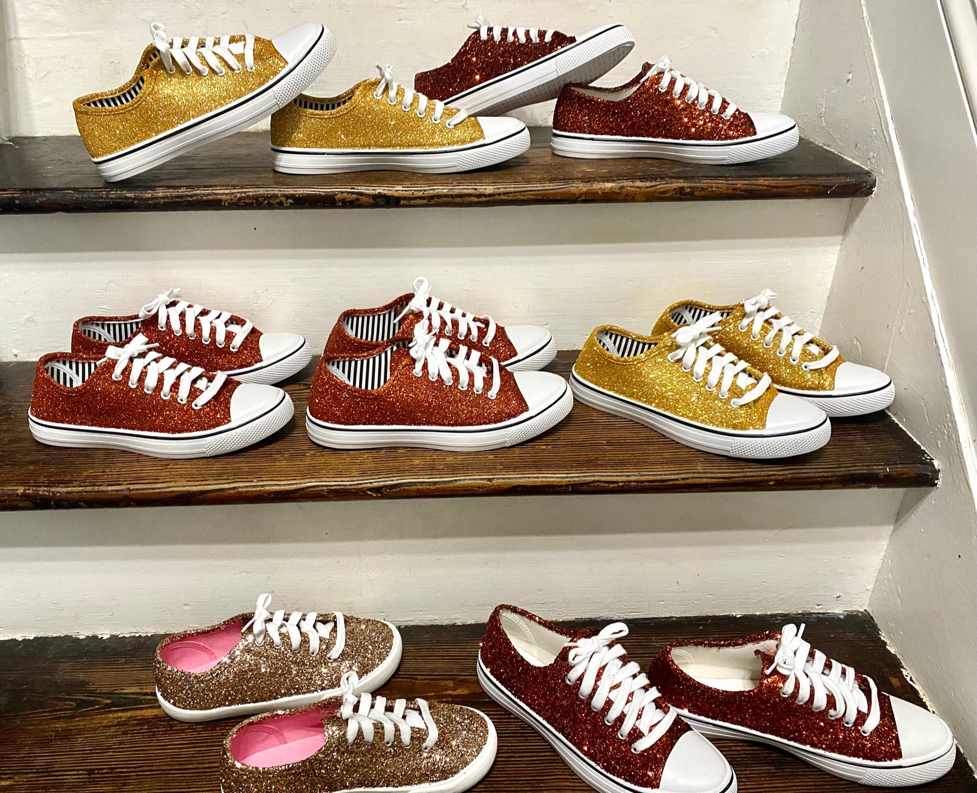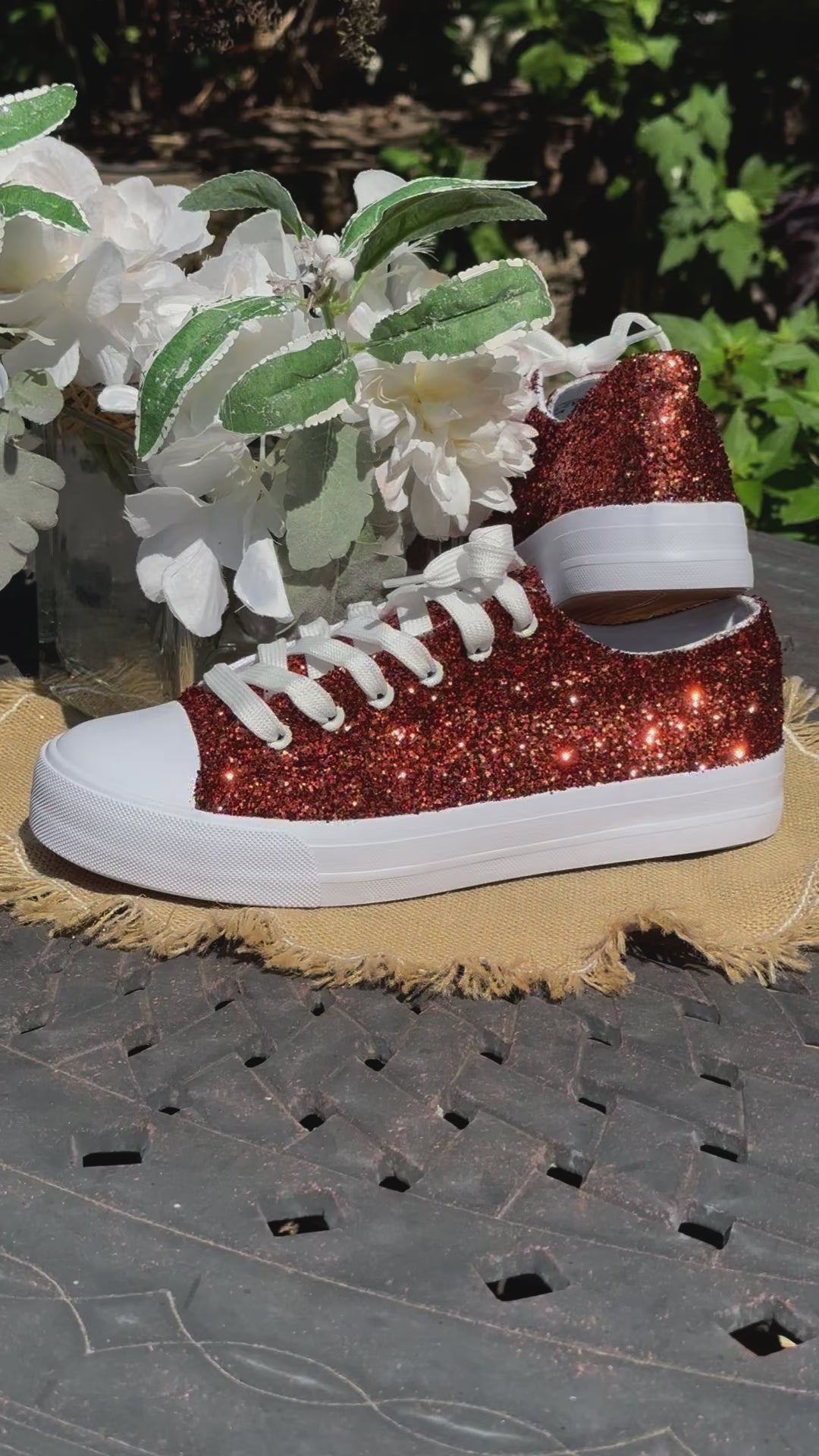 Glitter is high quality and heat set for minimal glitter loss and lasting quality, though, you may see glitter shedding the first time you wear/try on your shoes. Although we aim to remove every loose piece of glitter prior to shipment, the shipping process s well as putting them on and adjusting the laces can disrupt the glitter and cause some to flake. This is normal for the first wear or two.