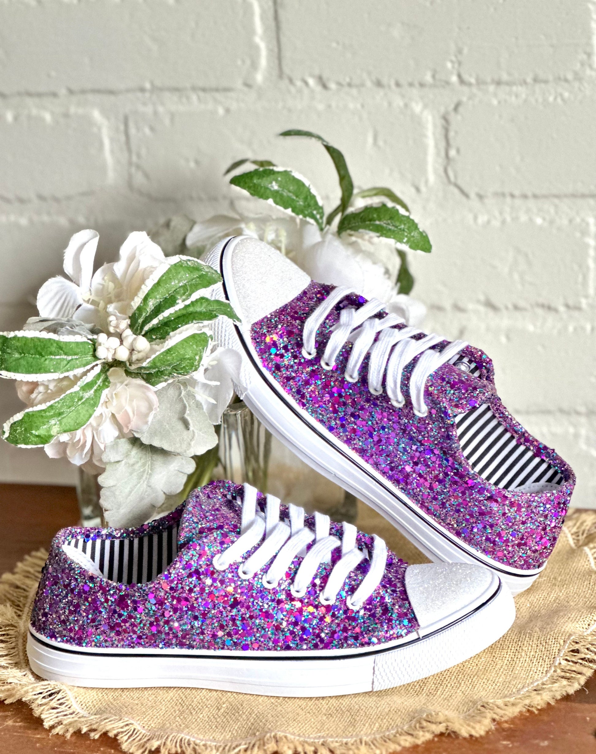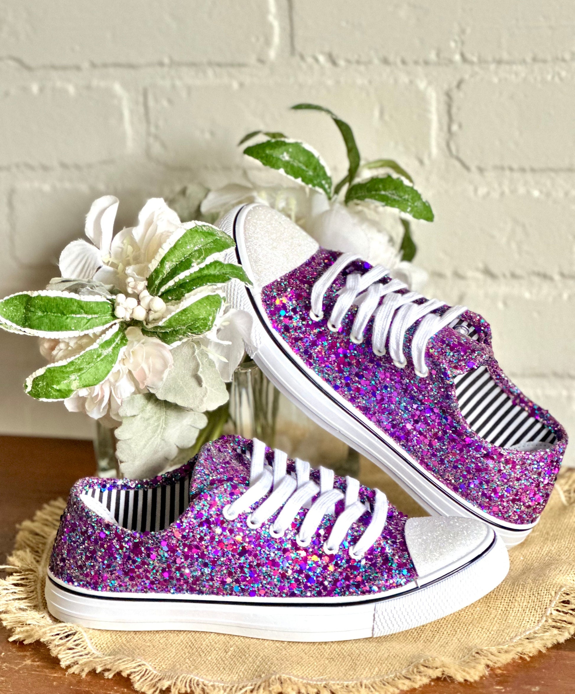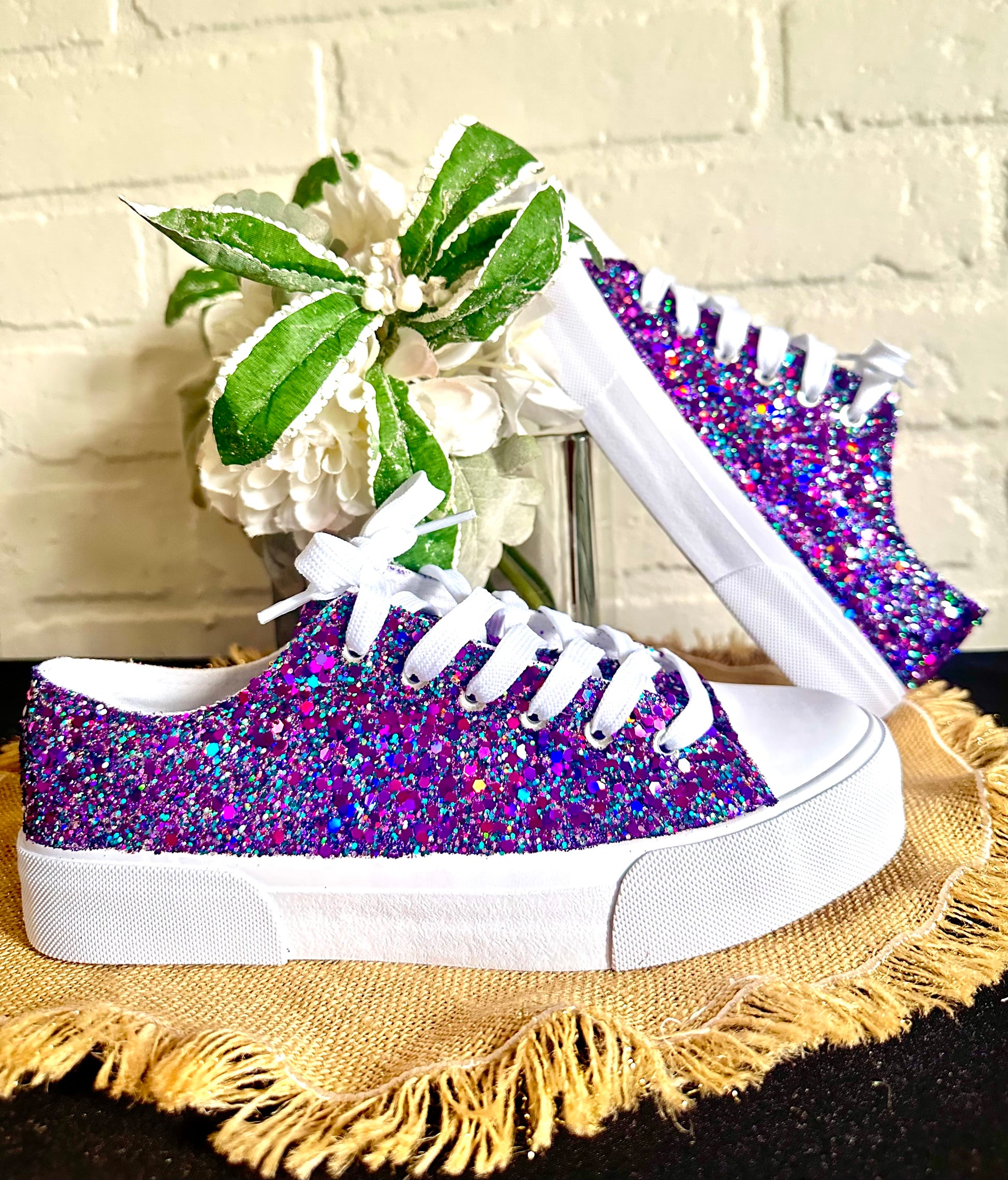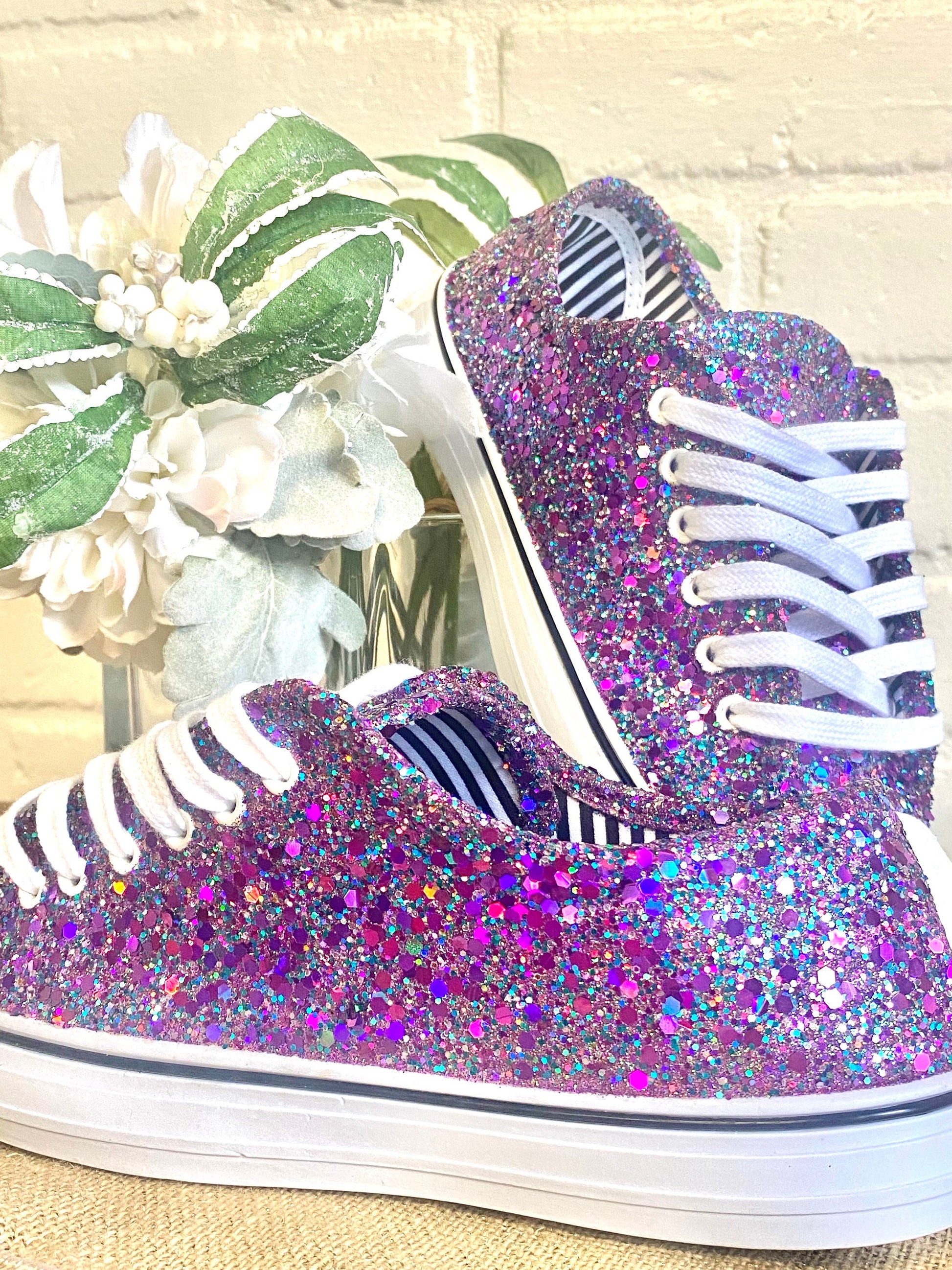 Hand Glittered unbranded canvas sneakers glittered in a gorgeous purple, teal, silver chunky glitter mix. Made to order.