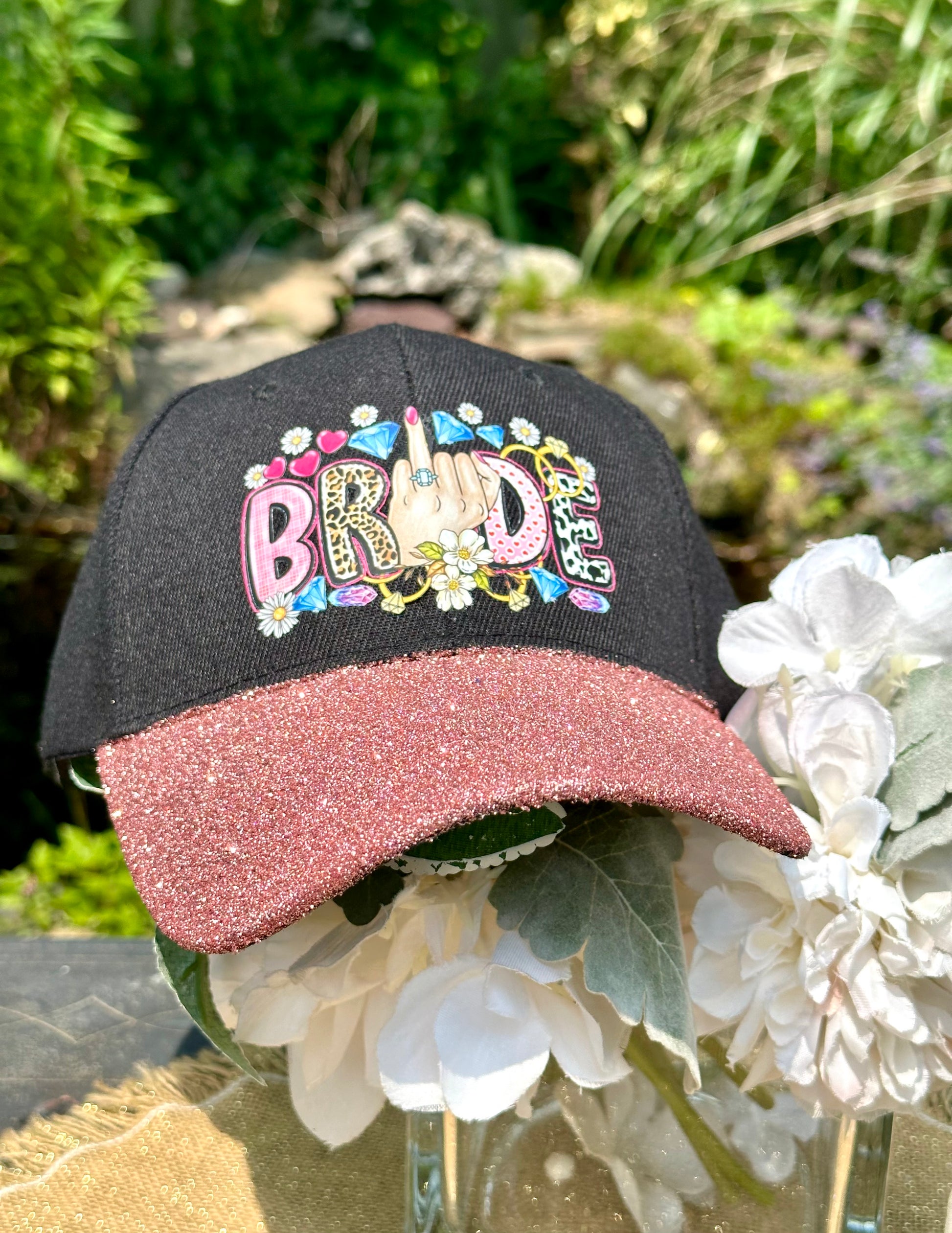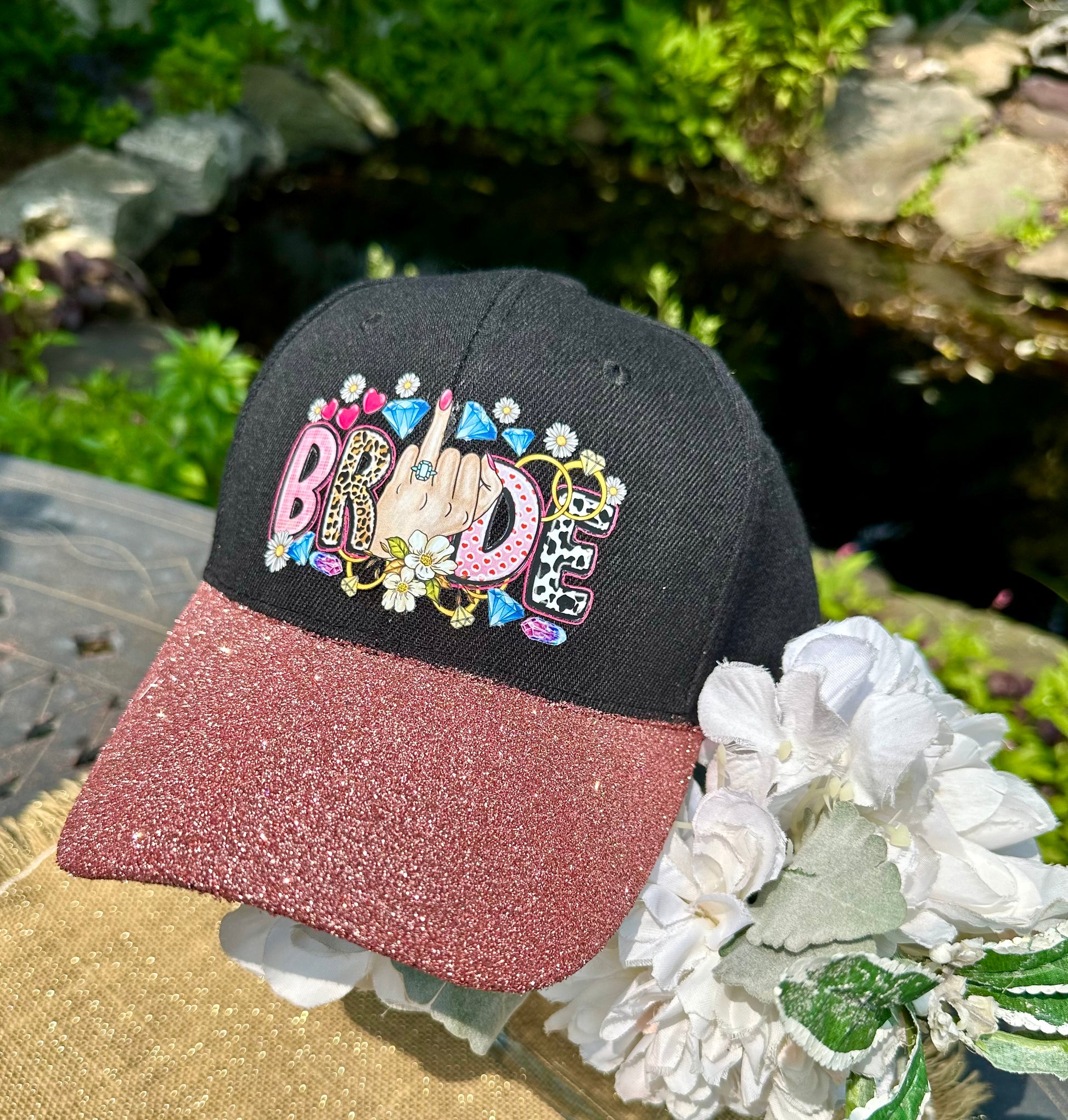 -“Bride” design with flowers, crystals and diamonds on a black base hat