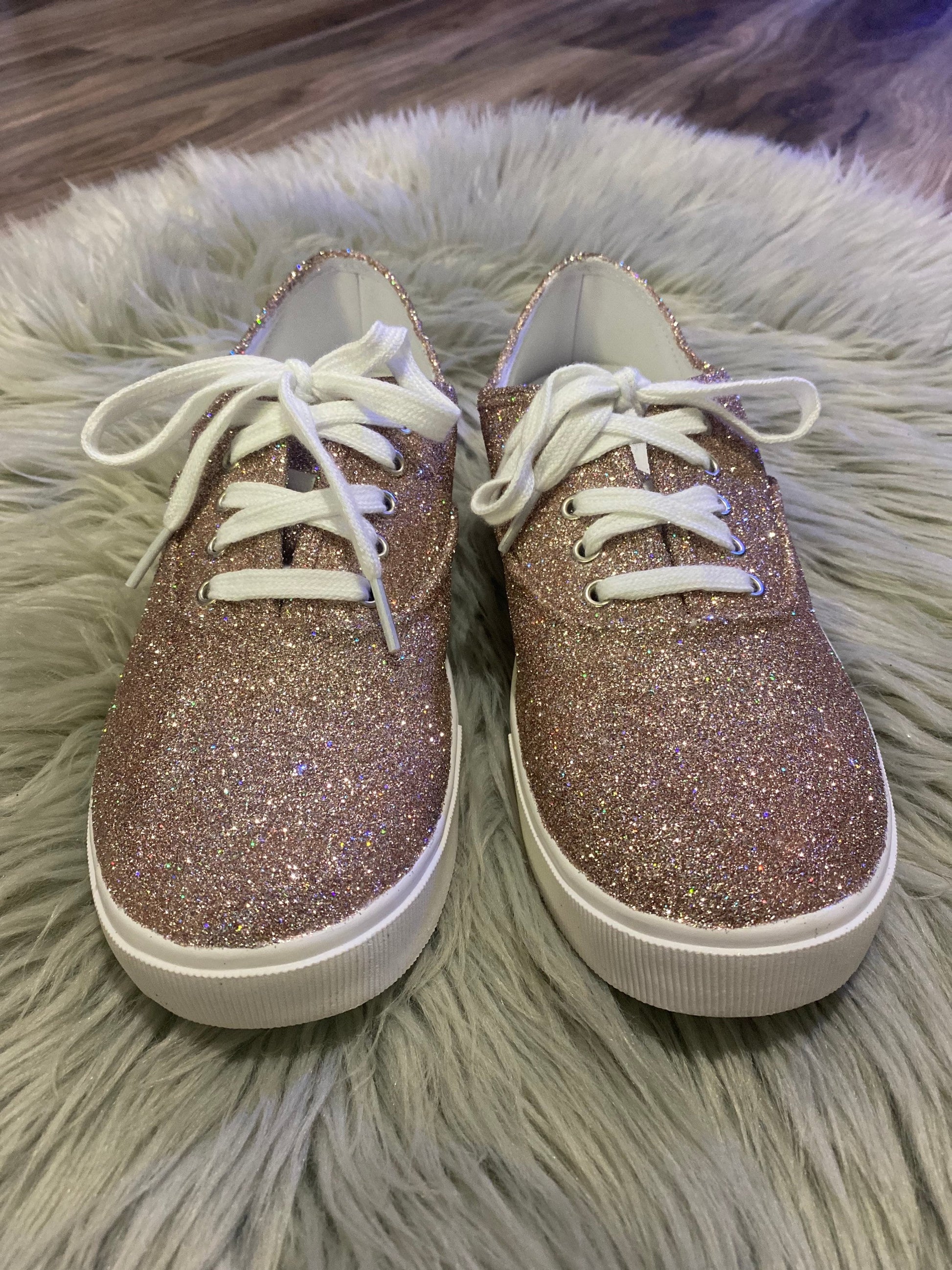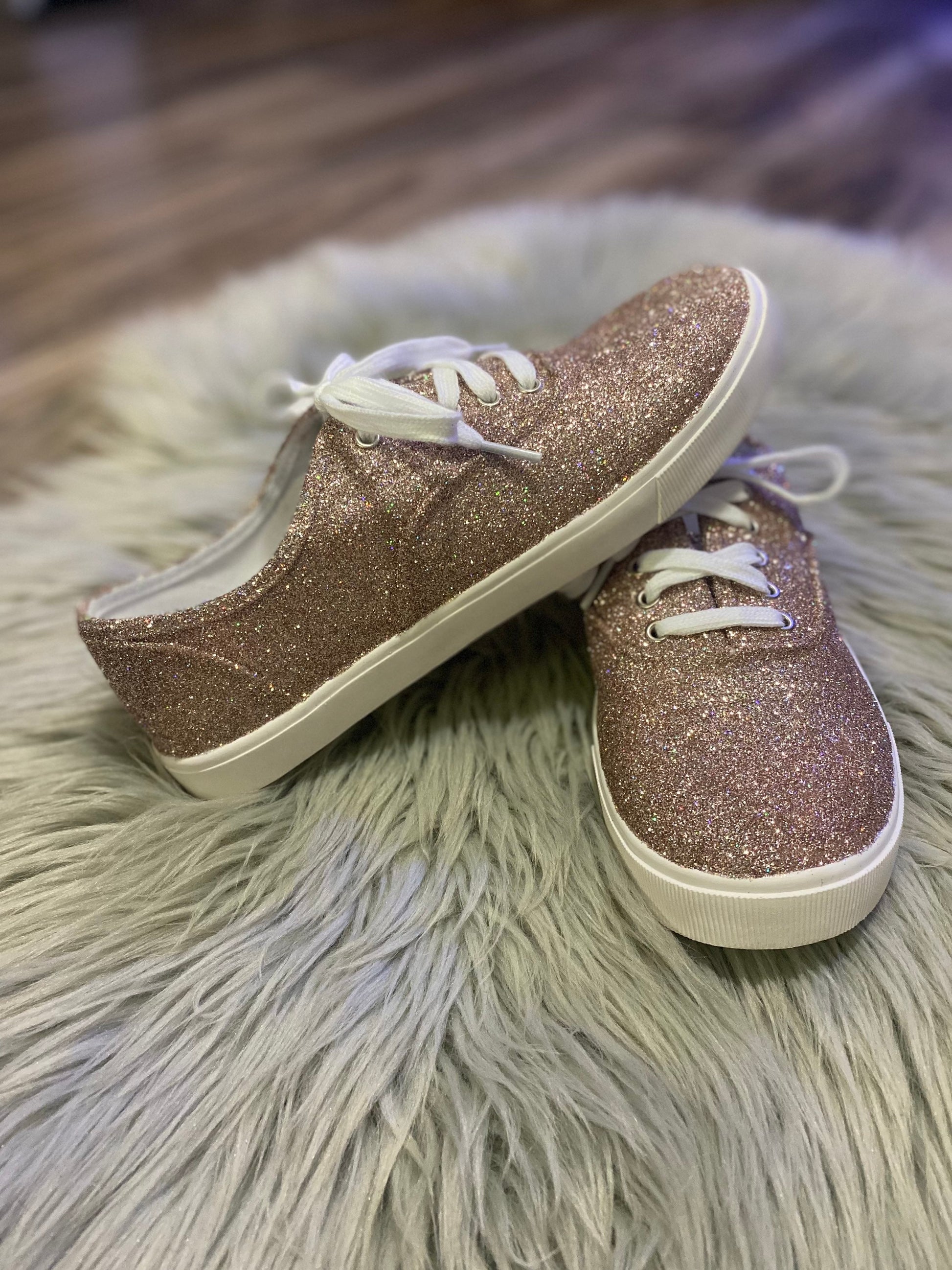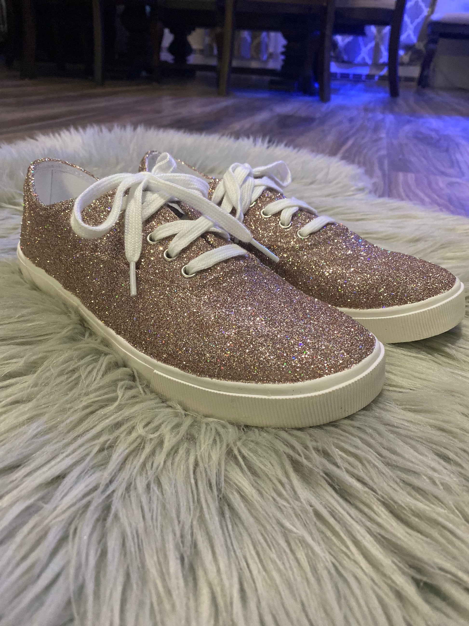 Hand Glittered unbranded canvas sneakers glittered in a gorgeous rose gold holographic glitter. Made to order. Ribbon laces not included.