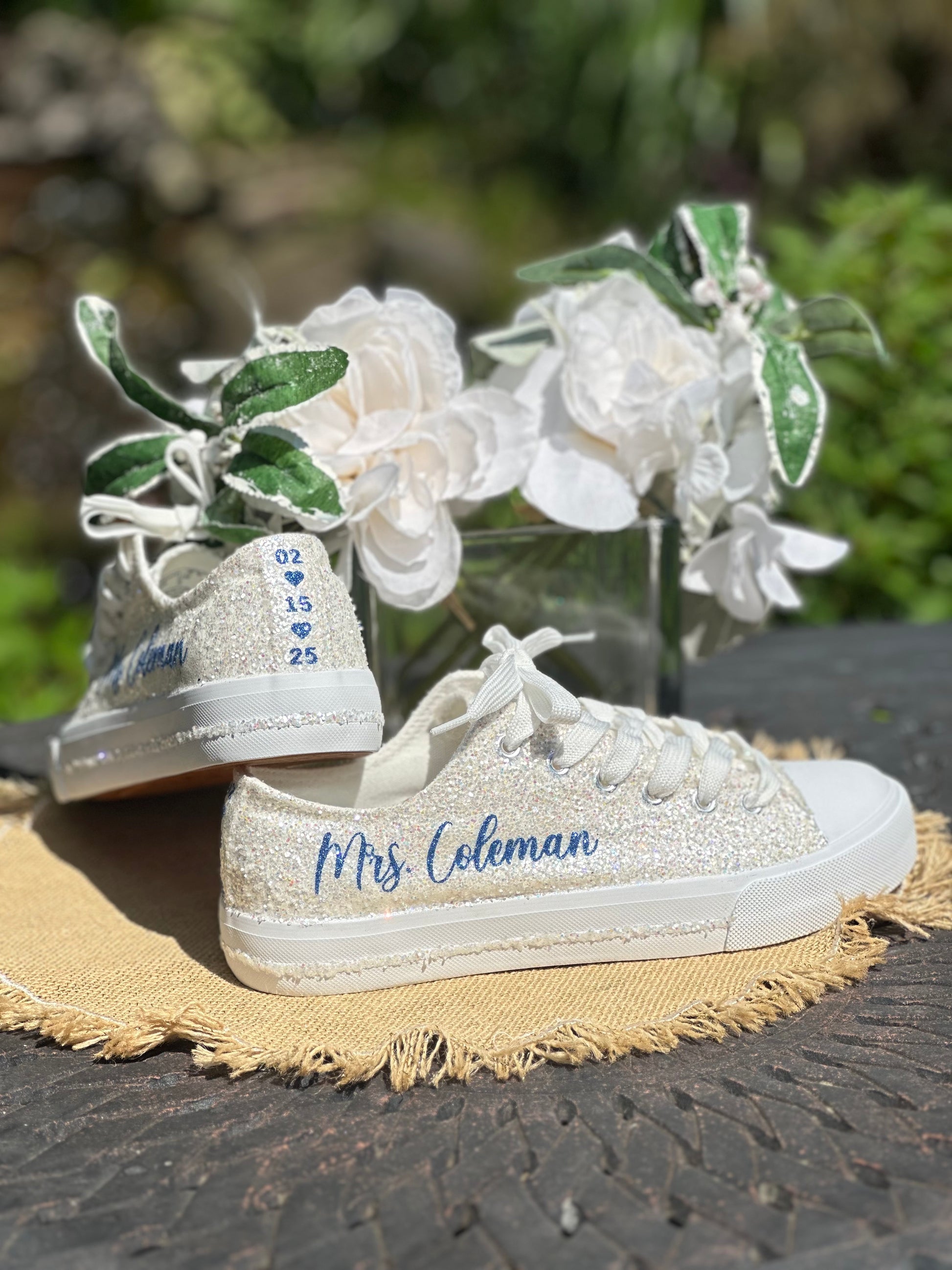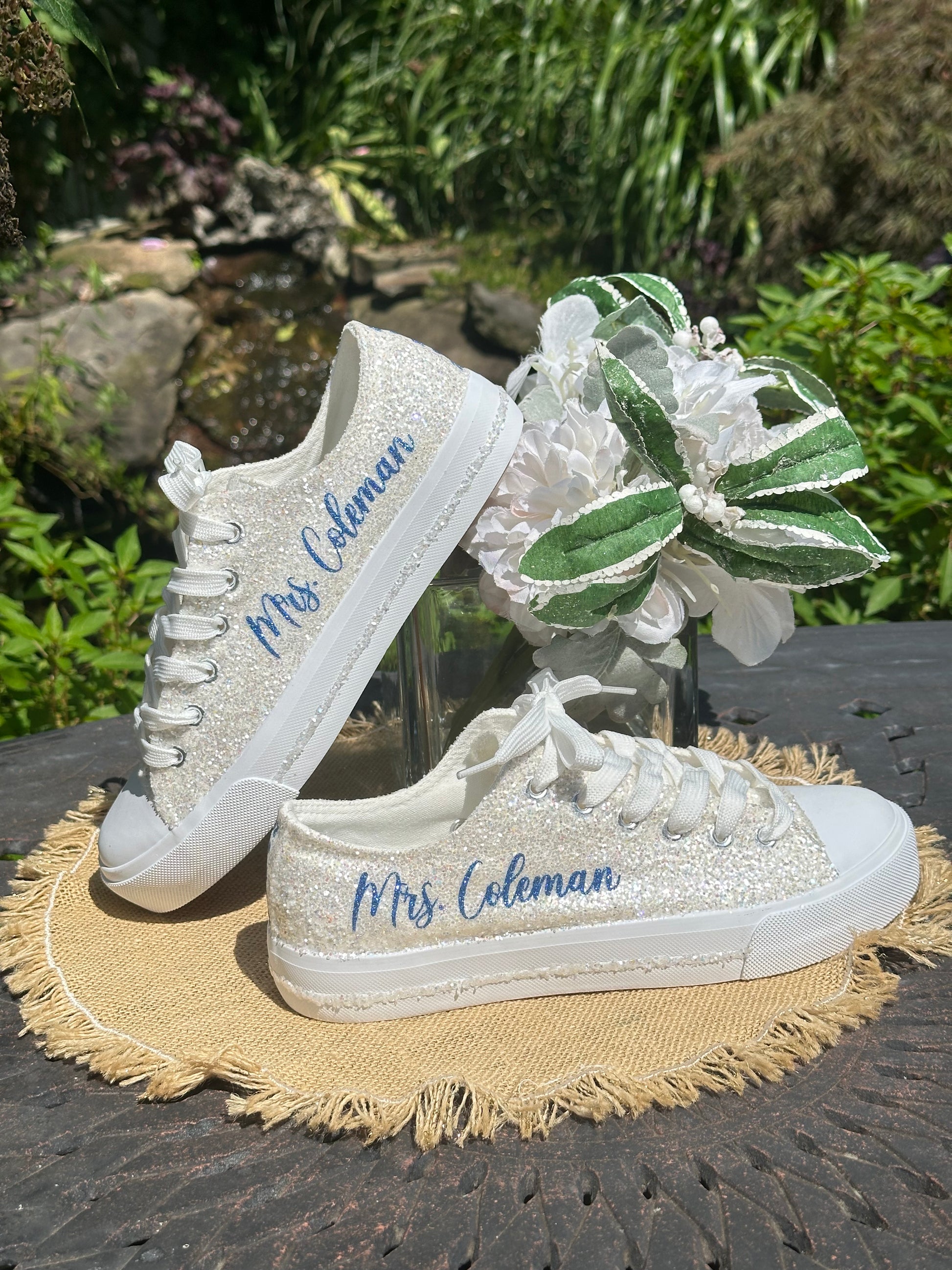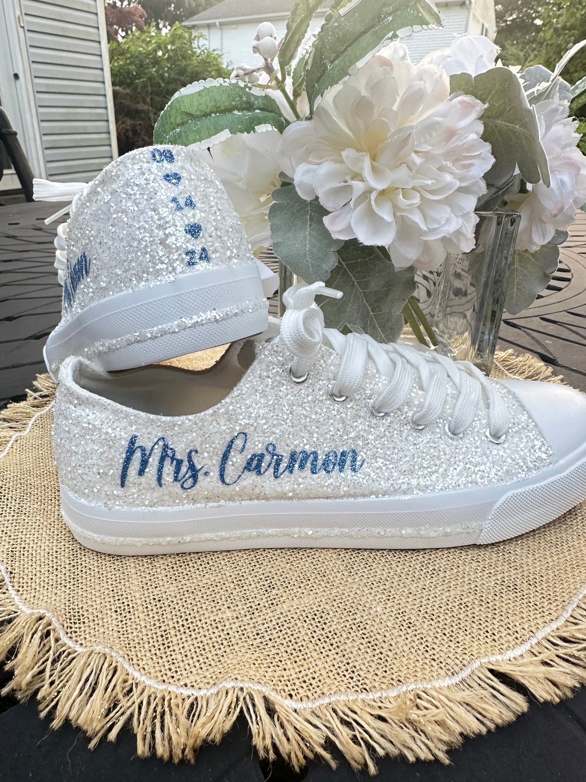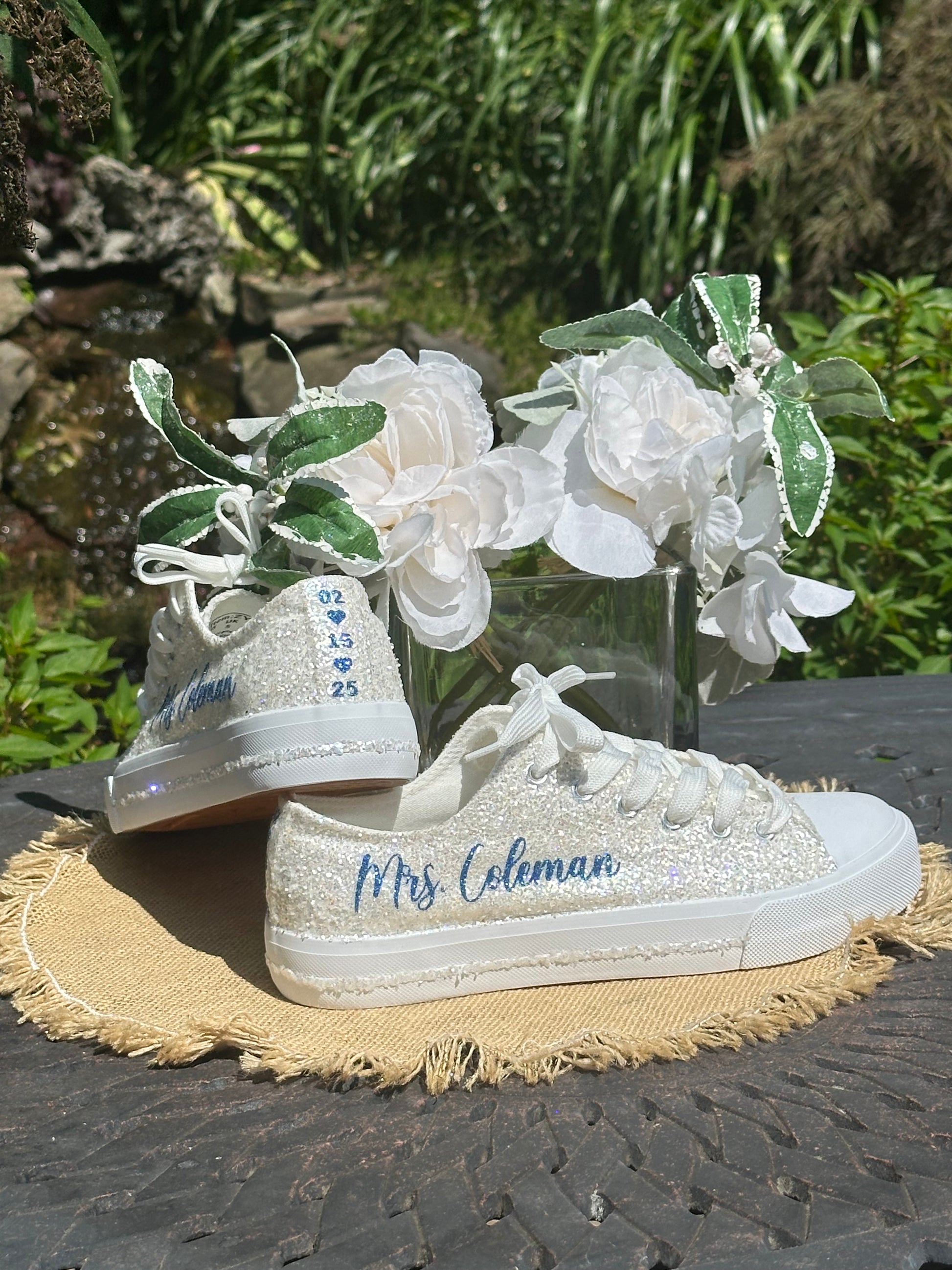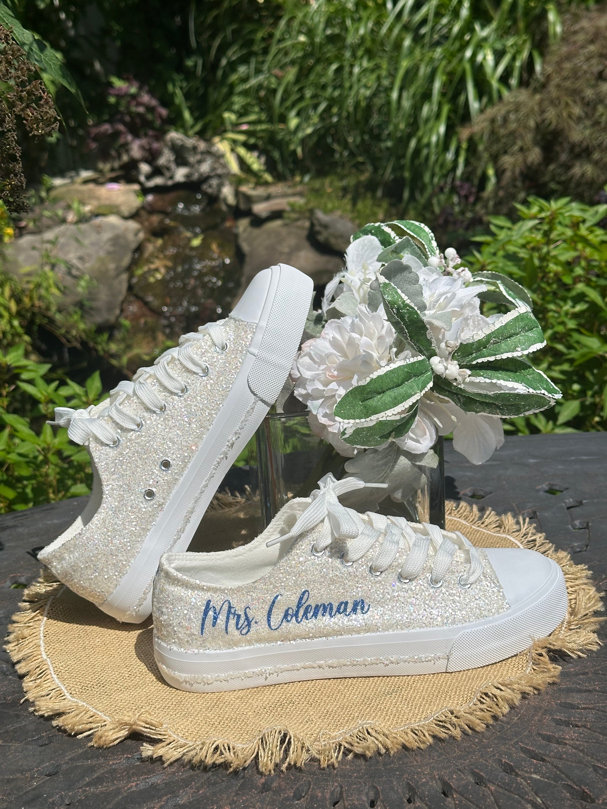 White Glitter Bride Sneakers with Blue Personalized Writing