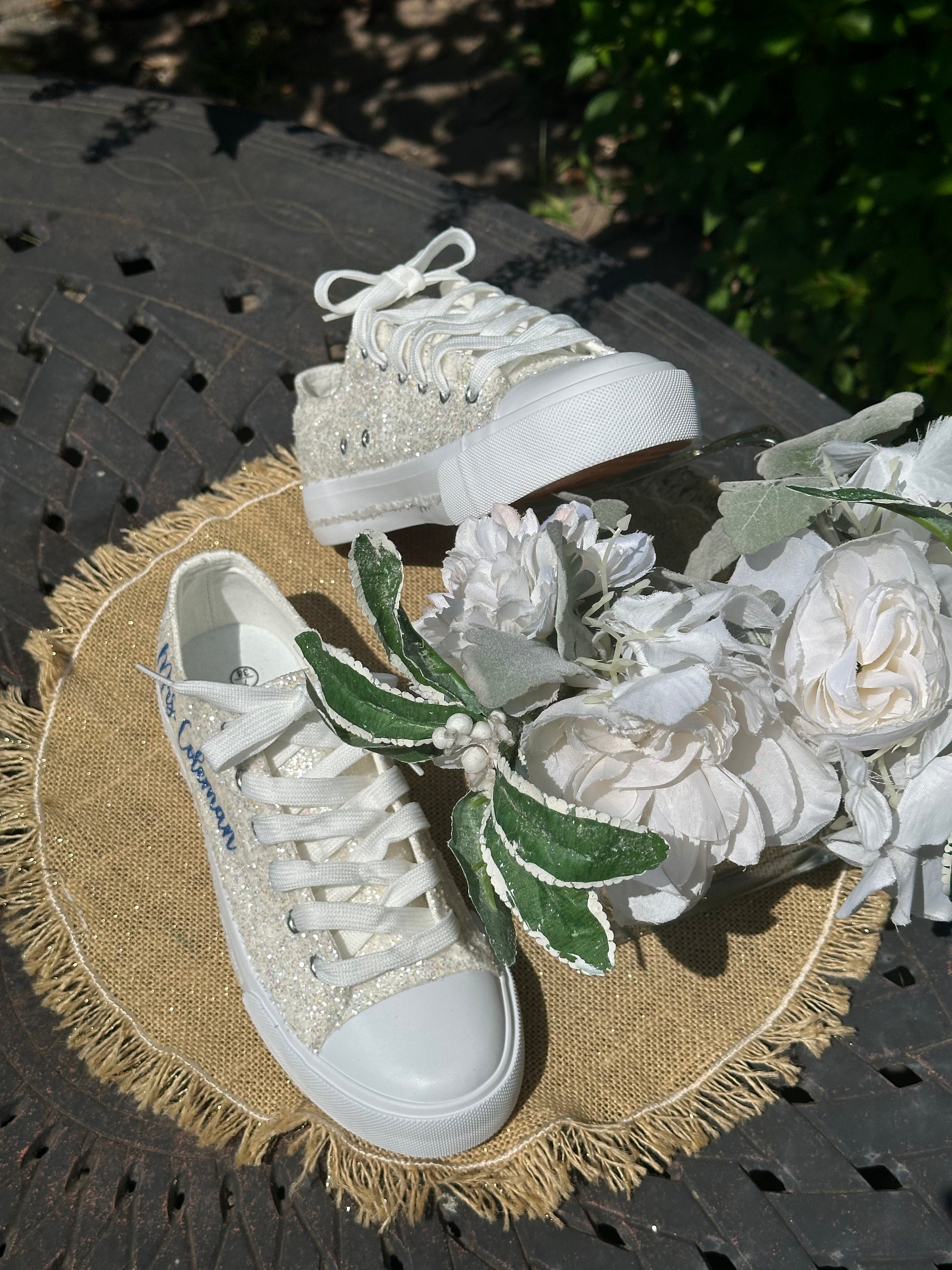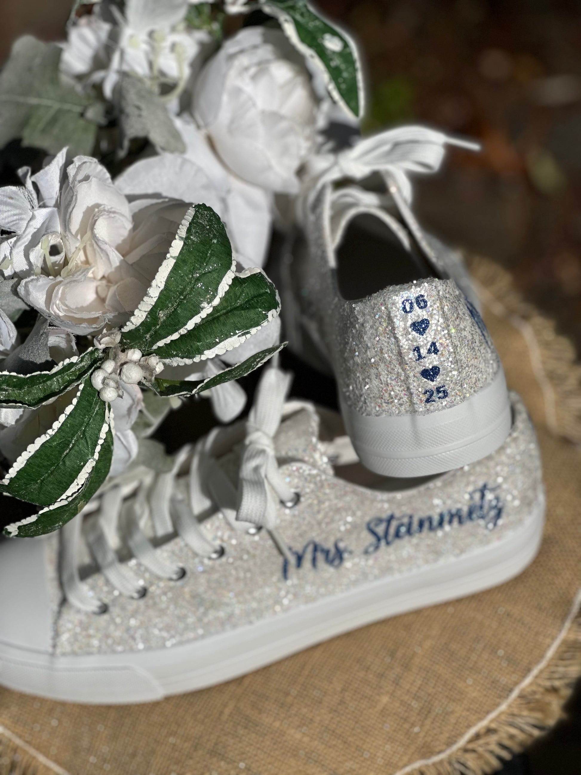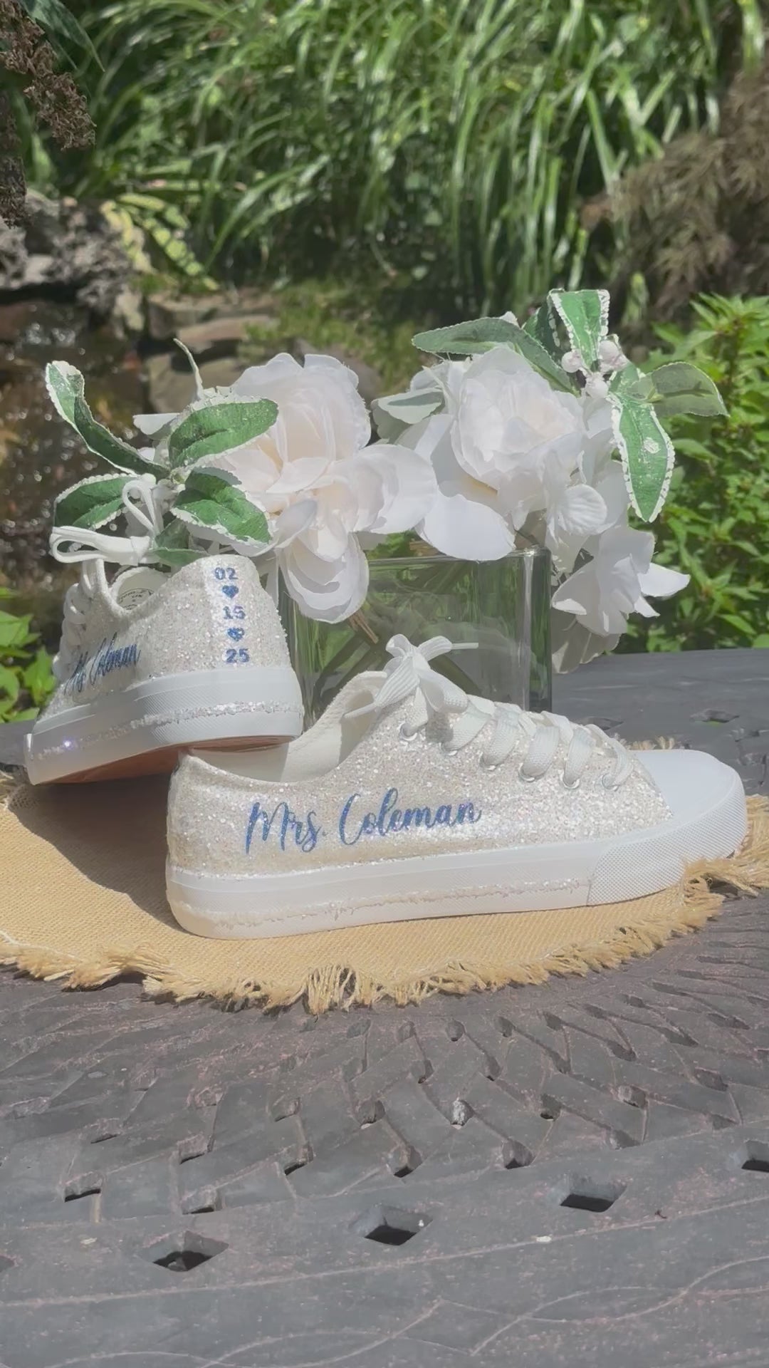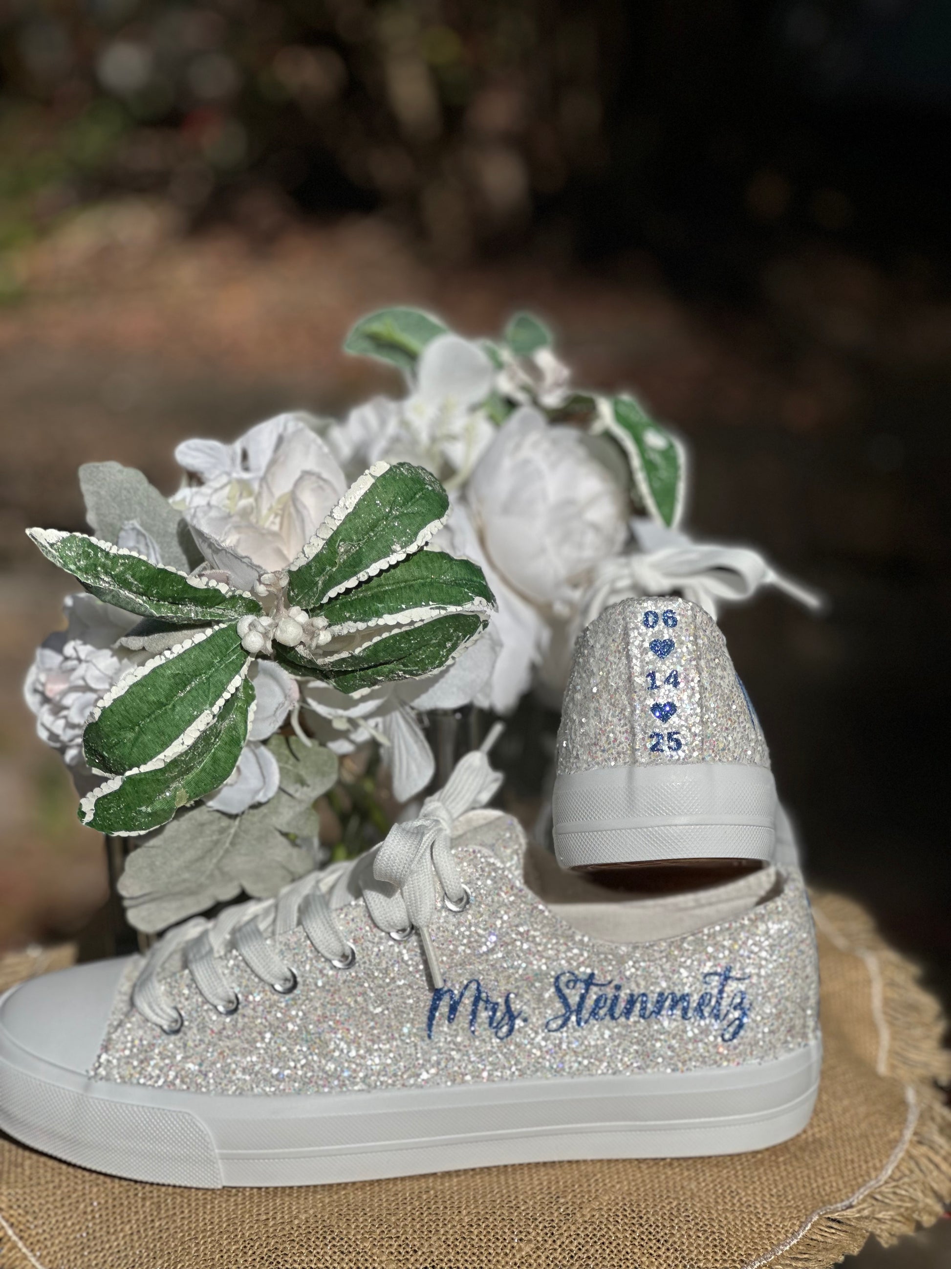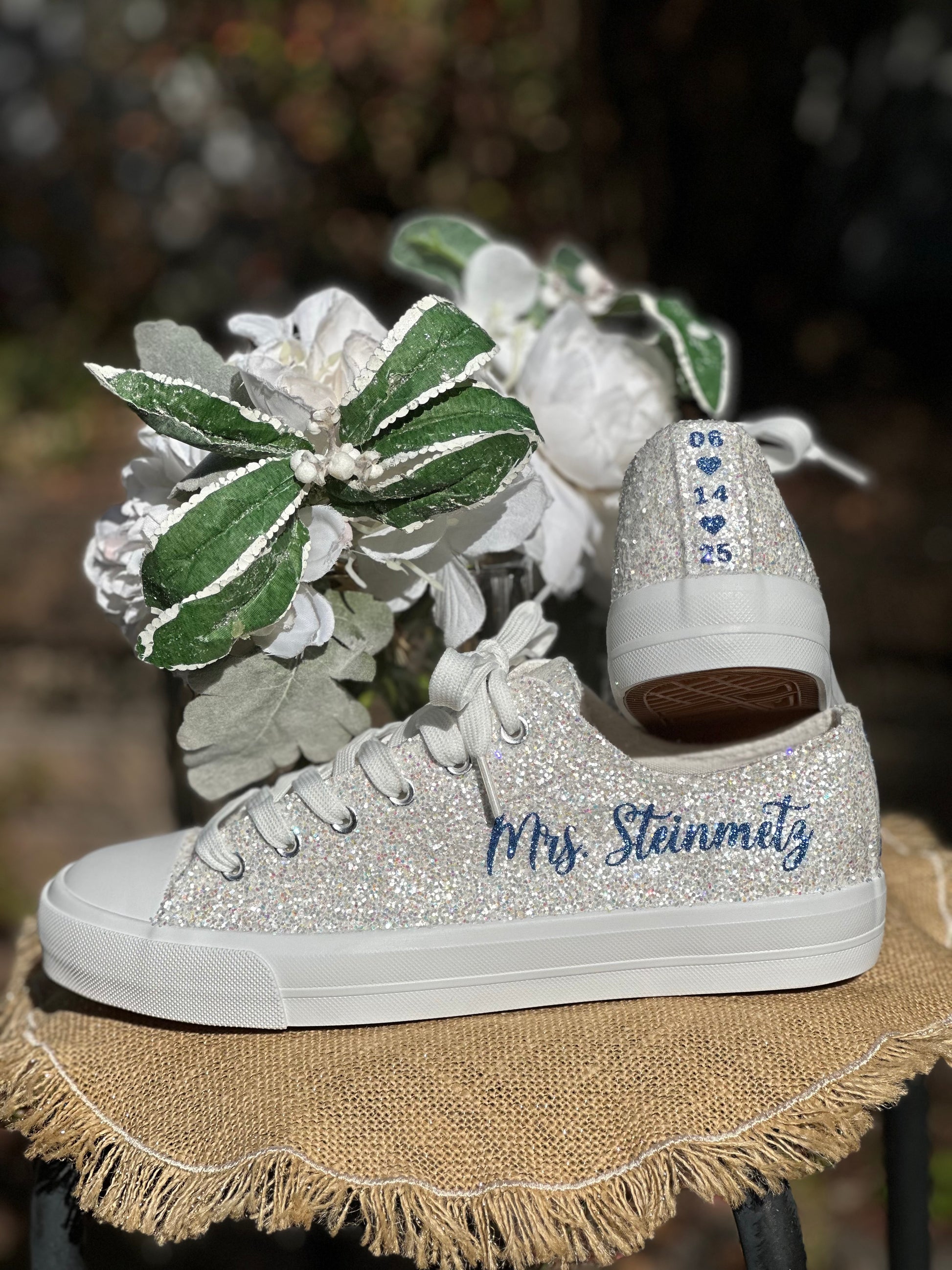 White Glitter Bride Sneakers with Blue Personalized Writing