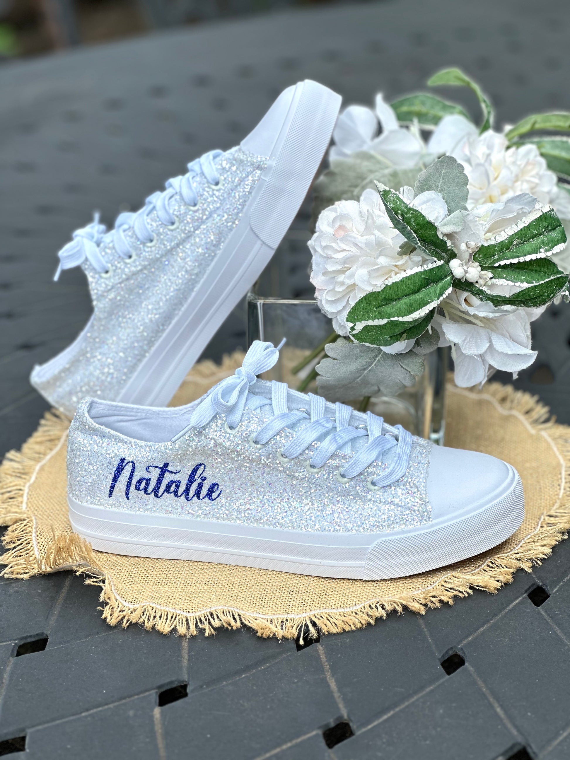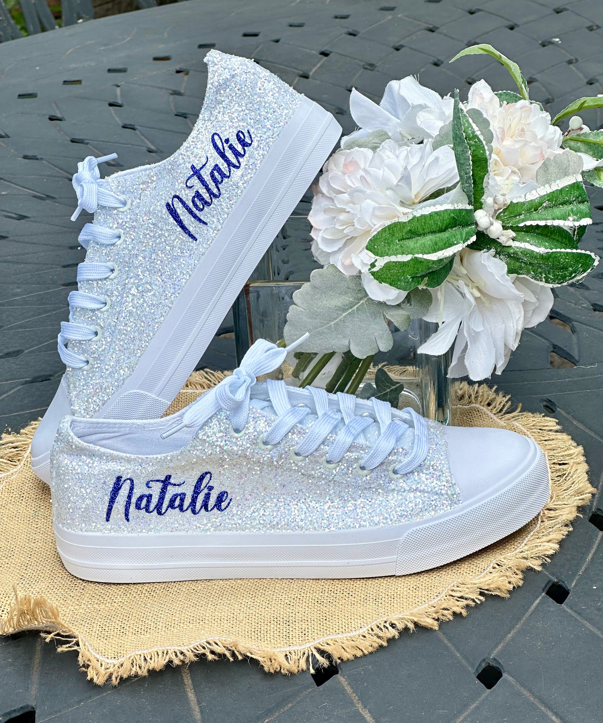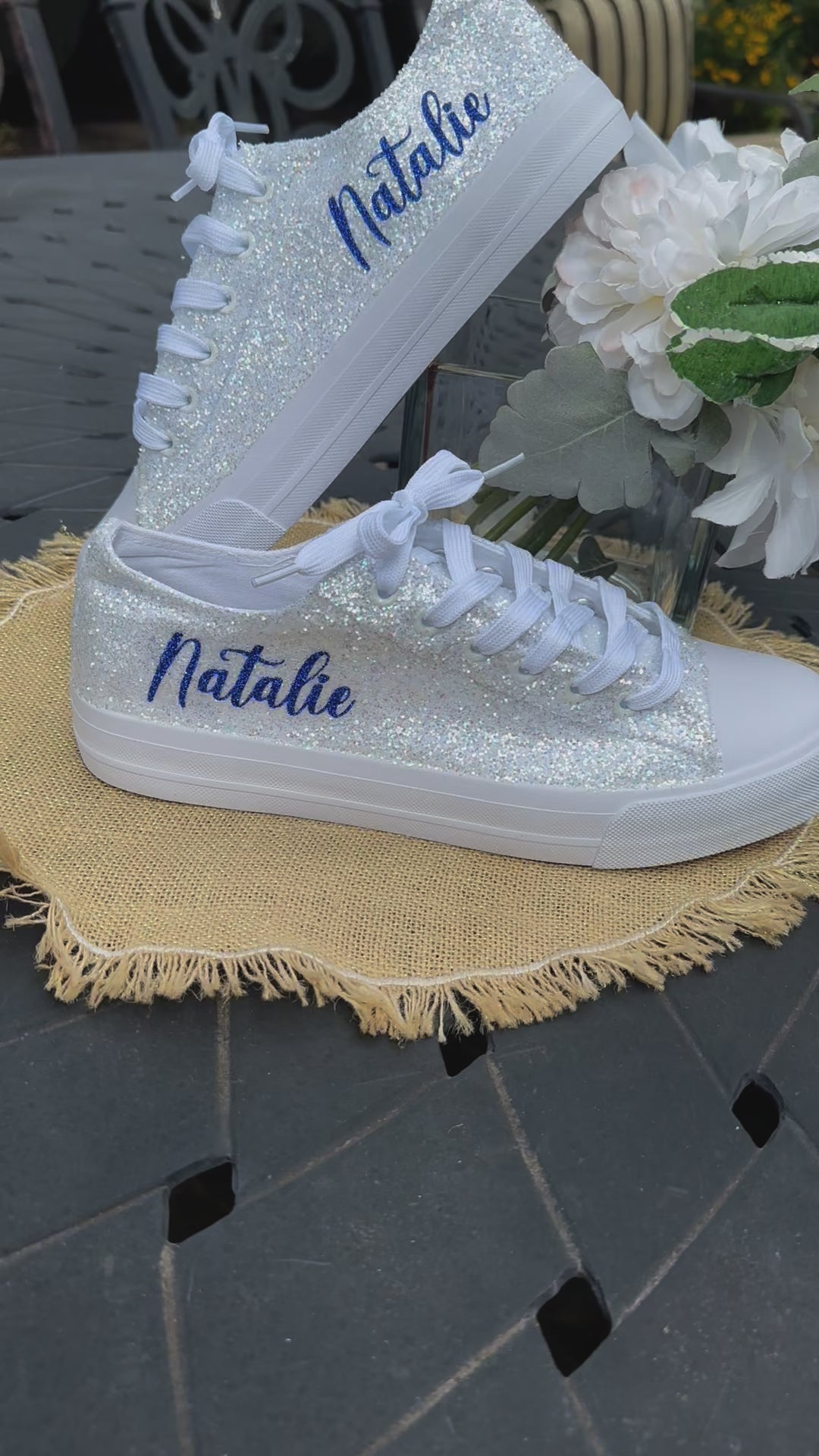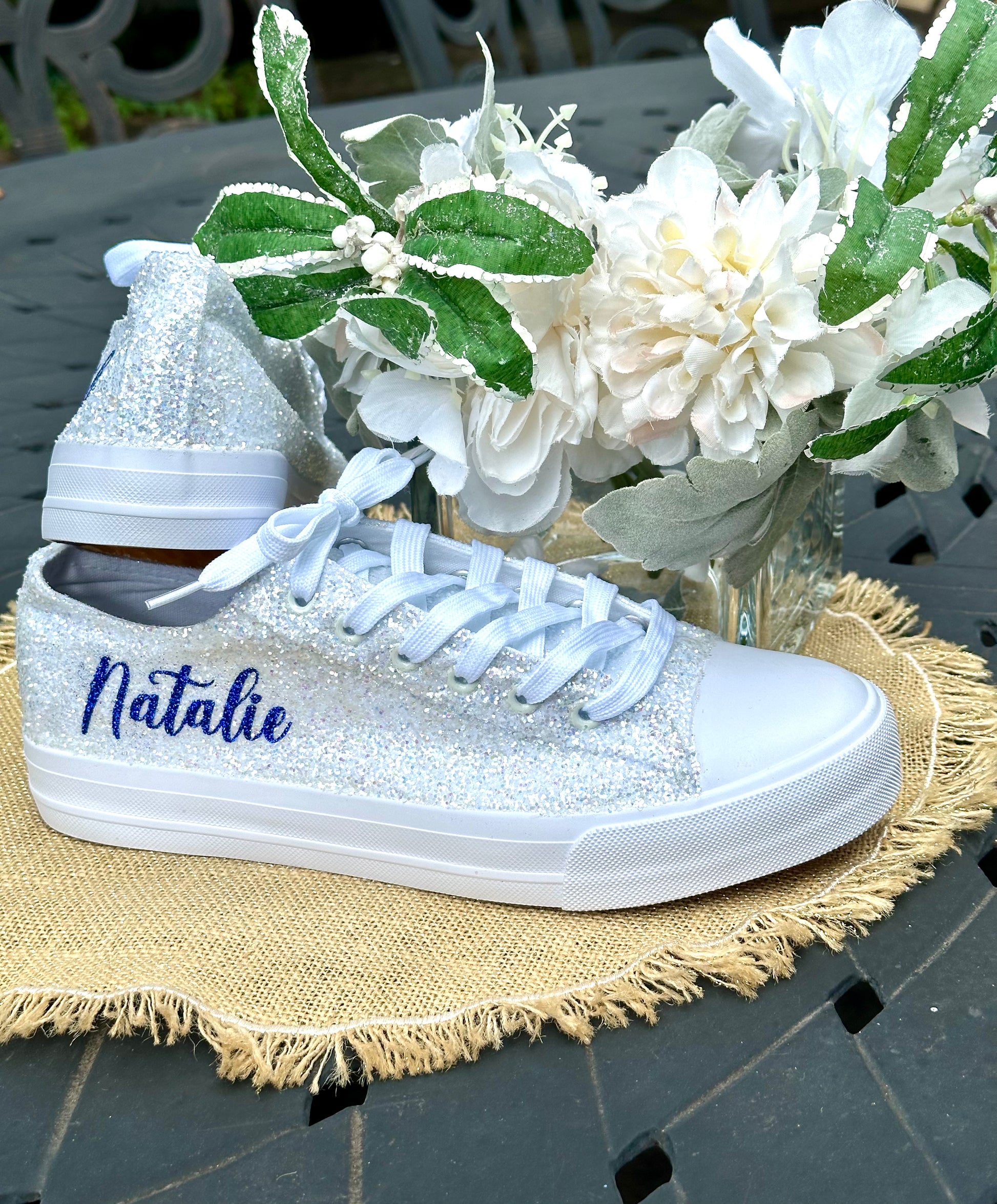 Hand Glittered unbranded canvas sneakers glittered in a gorgeous chunky white mix called *bungalow* with navy blue glitter personalization of your choice. Shown with white glitter trim, optional. Made to order.