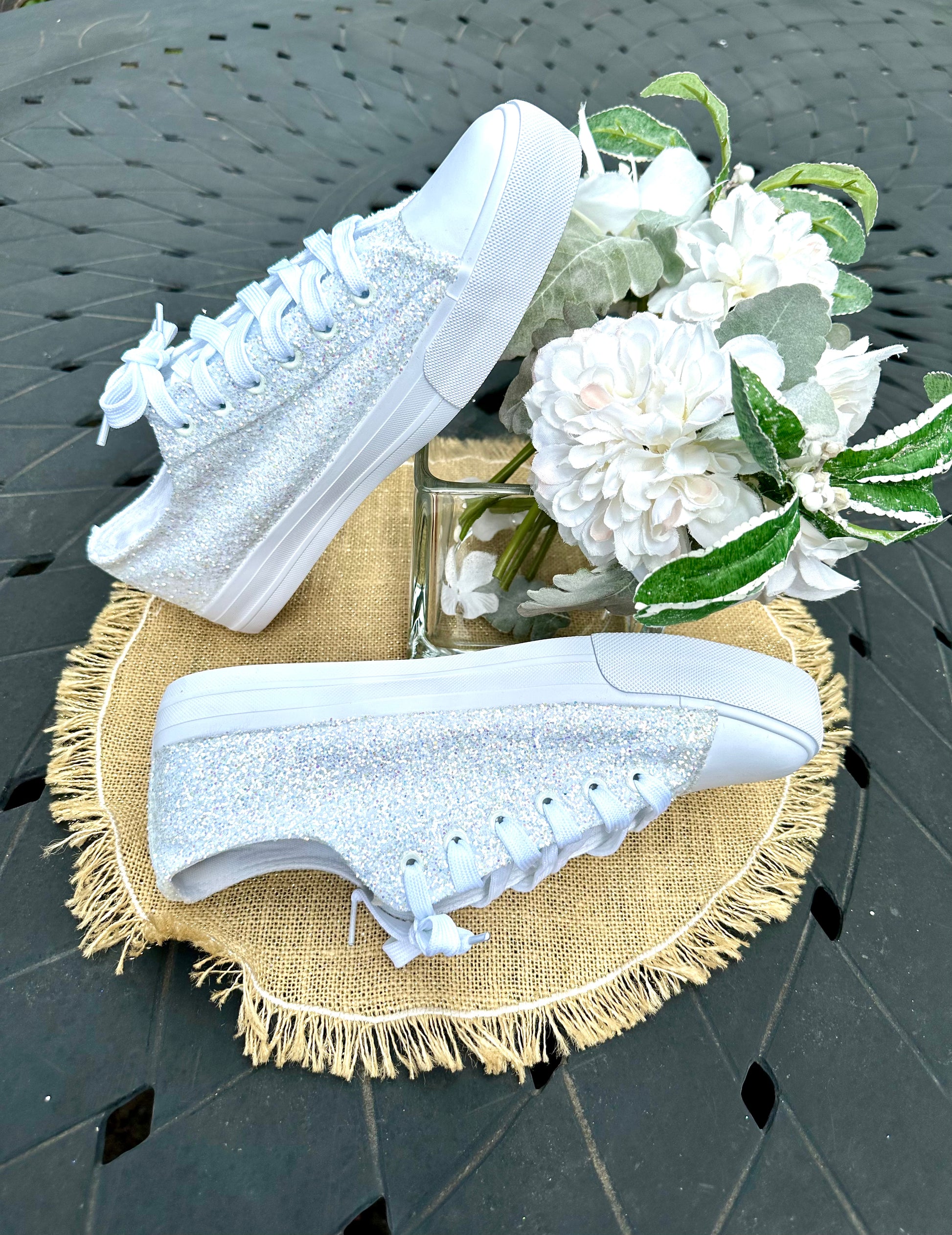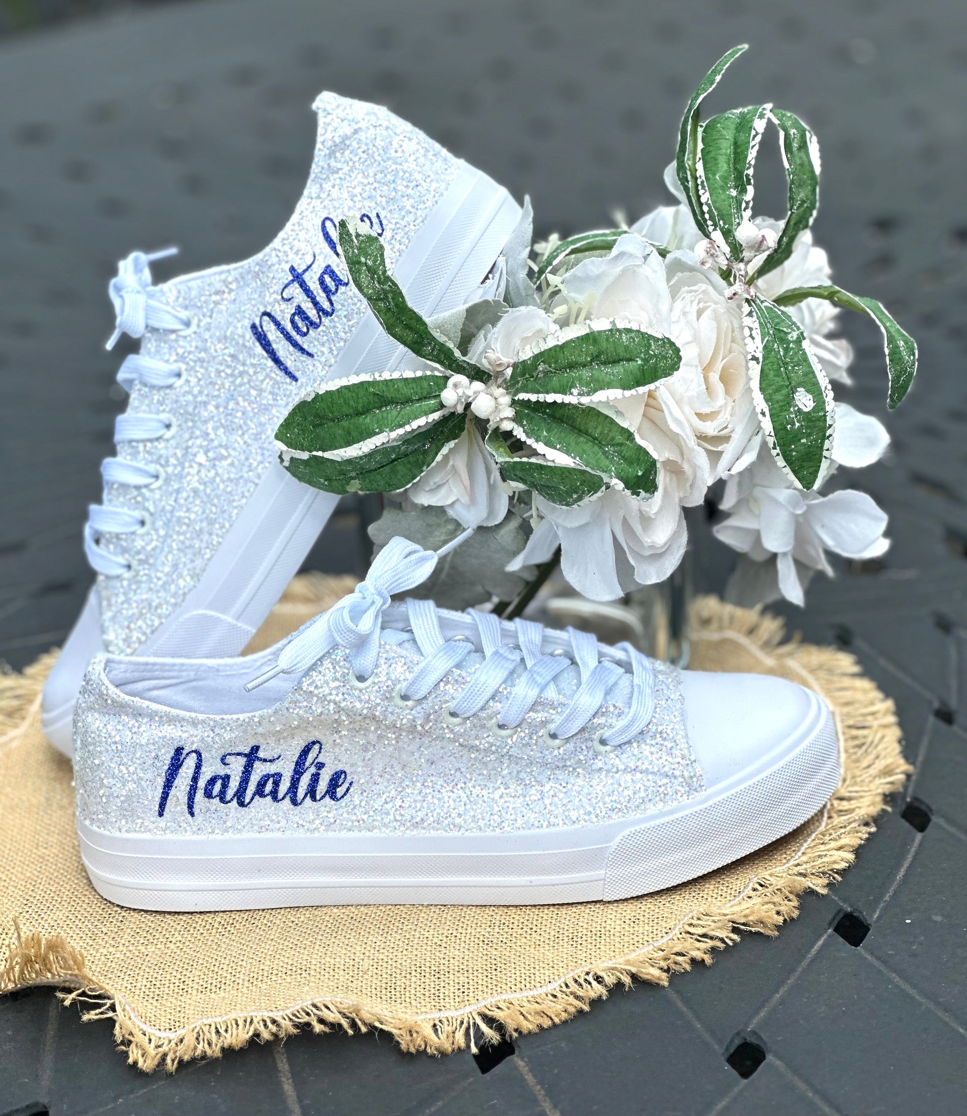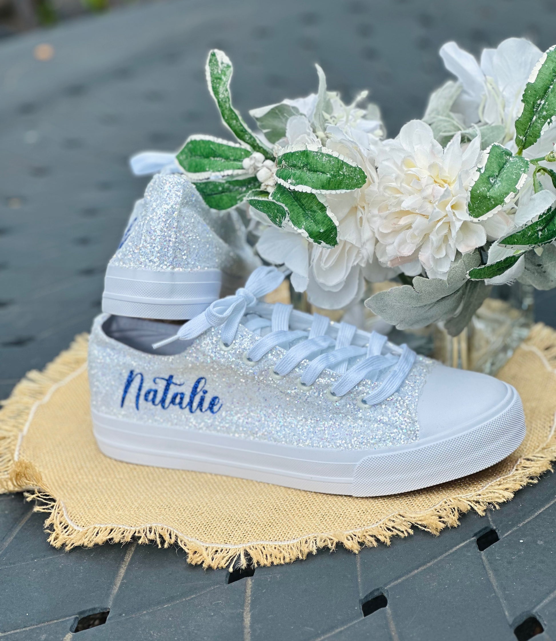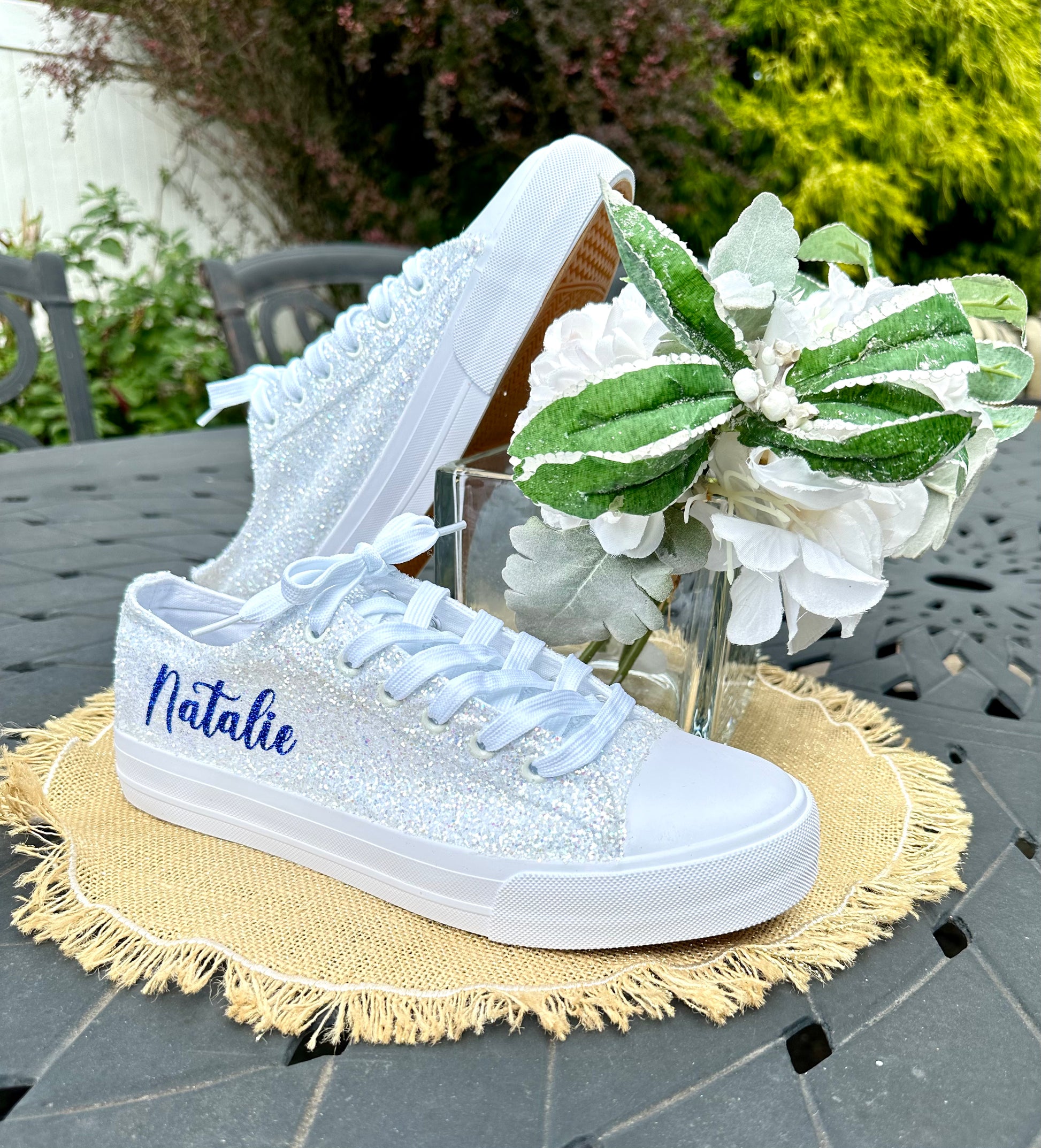 Hand Glittered unbranded canvas sneakers glittered in a gorgeous chunky white mix called *bungalow* with navy blue glitter personalization of your choice. Shown with white glitter trim, optional. Made to order.
