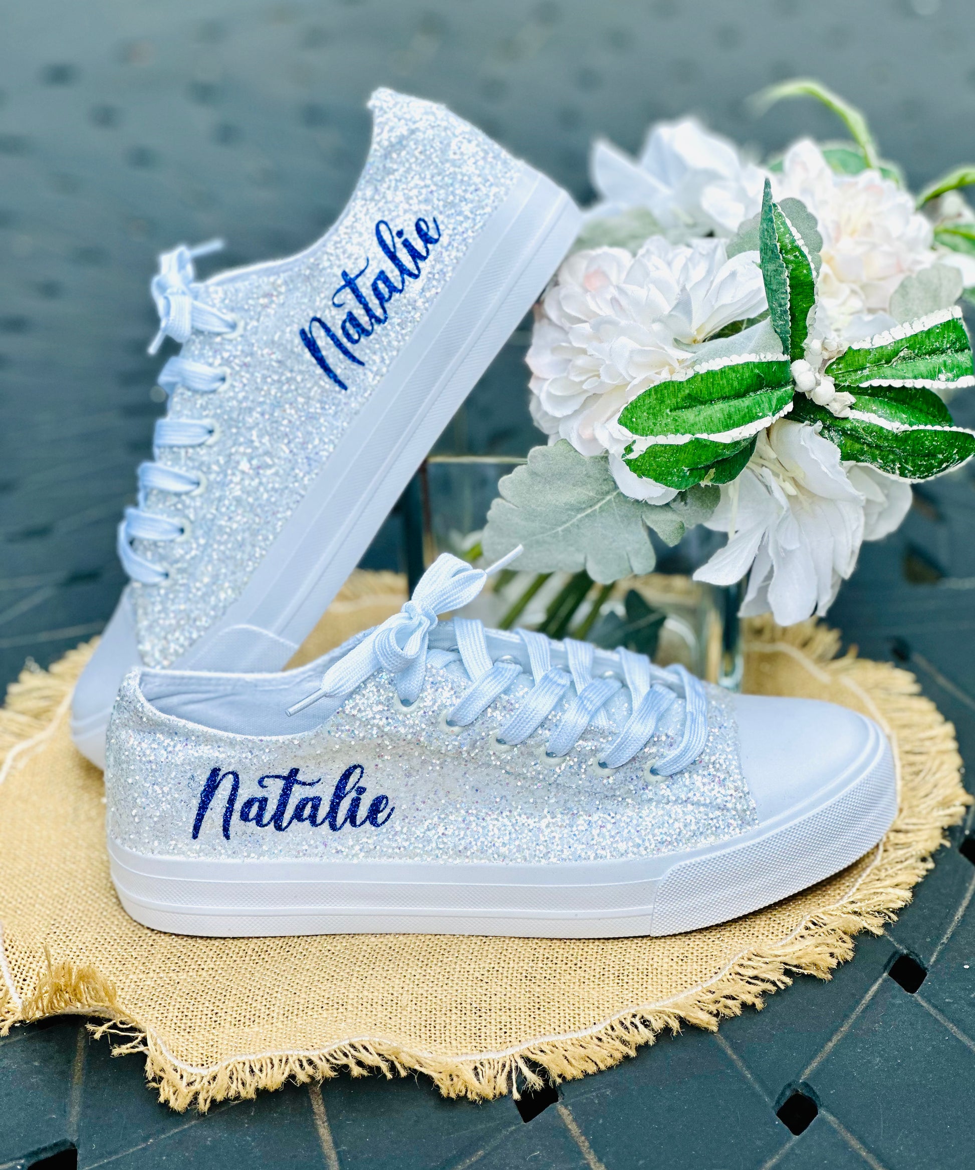 Personalization is added in navy blue glitter to include name on the outside of each sneaker and the date can be added to the inside of each sneaker or down the back heel. Please include custom info in the order notes. Should you desire different placement or options, please send us a message.