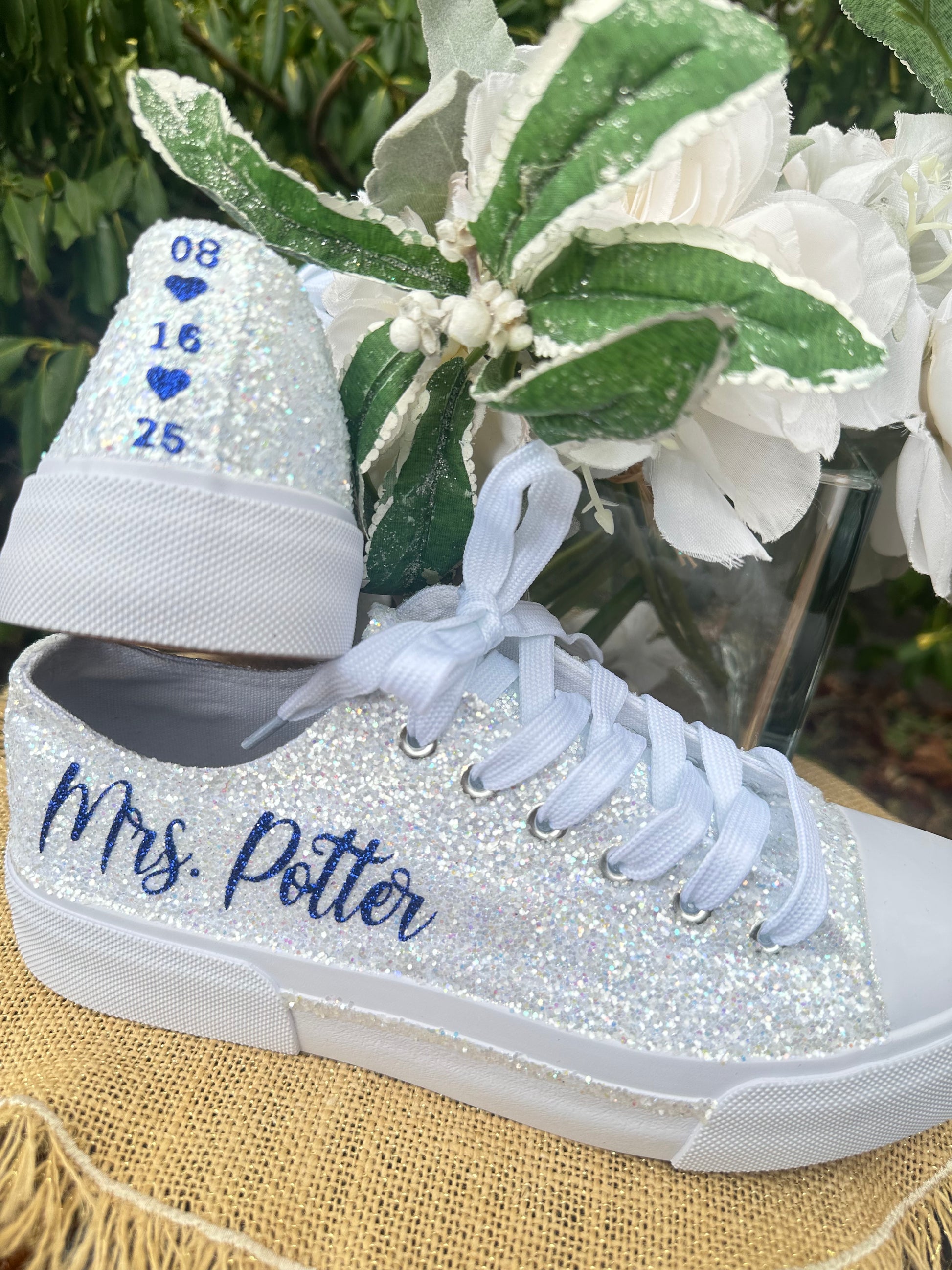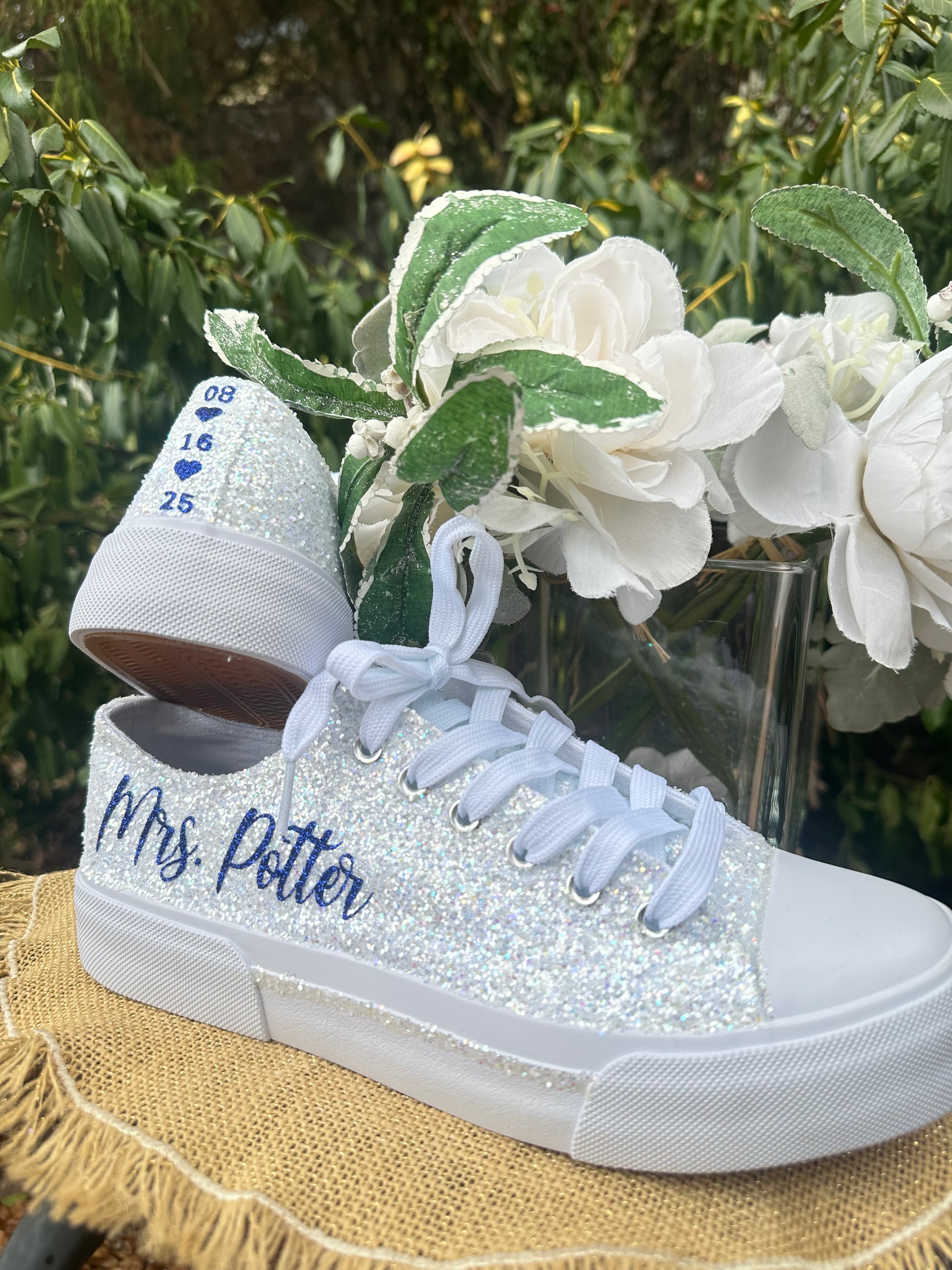 White Personalized Bride Sneakers with Navy Glitter Writing